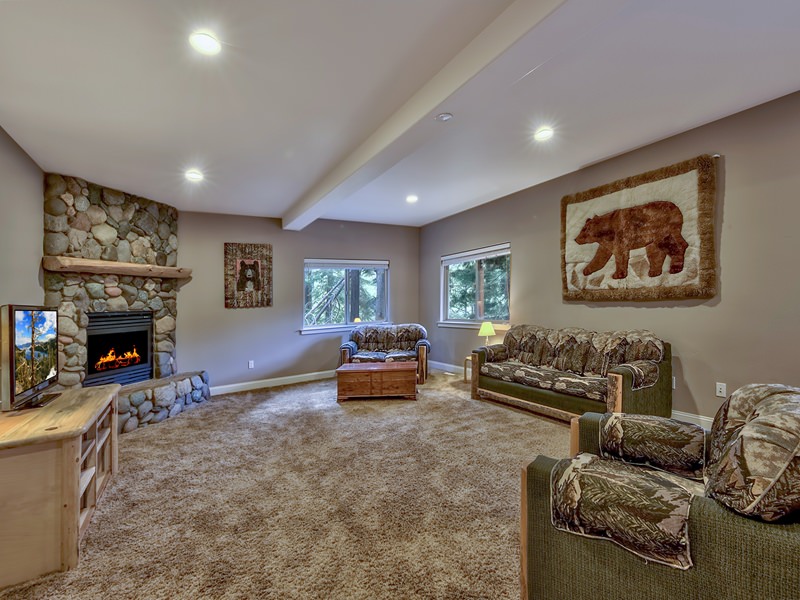The upper deck is sunny and located right off the kitchen/dining area. The lower deck is located off the family room and has a hot tub and seating area. Log accents throughout, knotty-pine vaulted ceilings, 2 gas river-rock fireplaces, and a 3 car garage. Very well maintained, and rarely used.