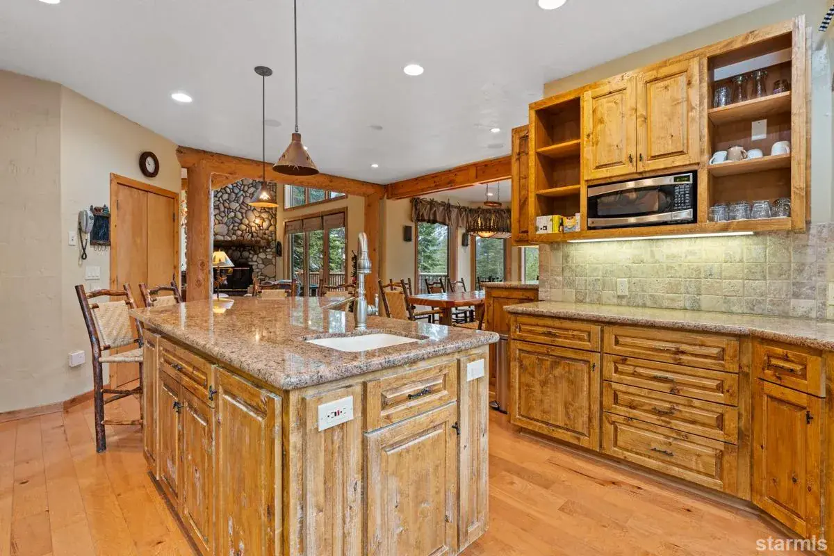 This luxury home is surrounded by views and embedded in a well-designed floor plan to inspire both the mountain lifestyle dream and adventure!Enjoy stunning vistas of the meadow, the mountain and the cliffs in the timeless elegance of log accents, hard wood floors, granite and natural stone. In the living room, you would gather around a tall river rock fireplace to connect with friends and family. Around the kitchen’s island and dining room with seating for 12, you could laugh over the day’s excitement, and in the family room there’s a pool table, TV and games for relaxing entertainment. The master has a cozy window seat and fireplace; the master bath a jetted tub with views. Recline on one of two open decks or a private backyard patio and let nature re-inspire. On a cul-de-sac, there is quiet all around as well as easy walking or biking access to Caples Lake and the meadow. Shuttle bus to ski lifts. Easy to leave all the toys behind in an oversized two-car garage while the day’s memories follow you home. Sold fully furnished and decorated.
