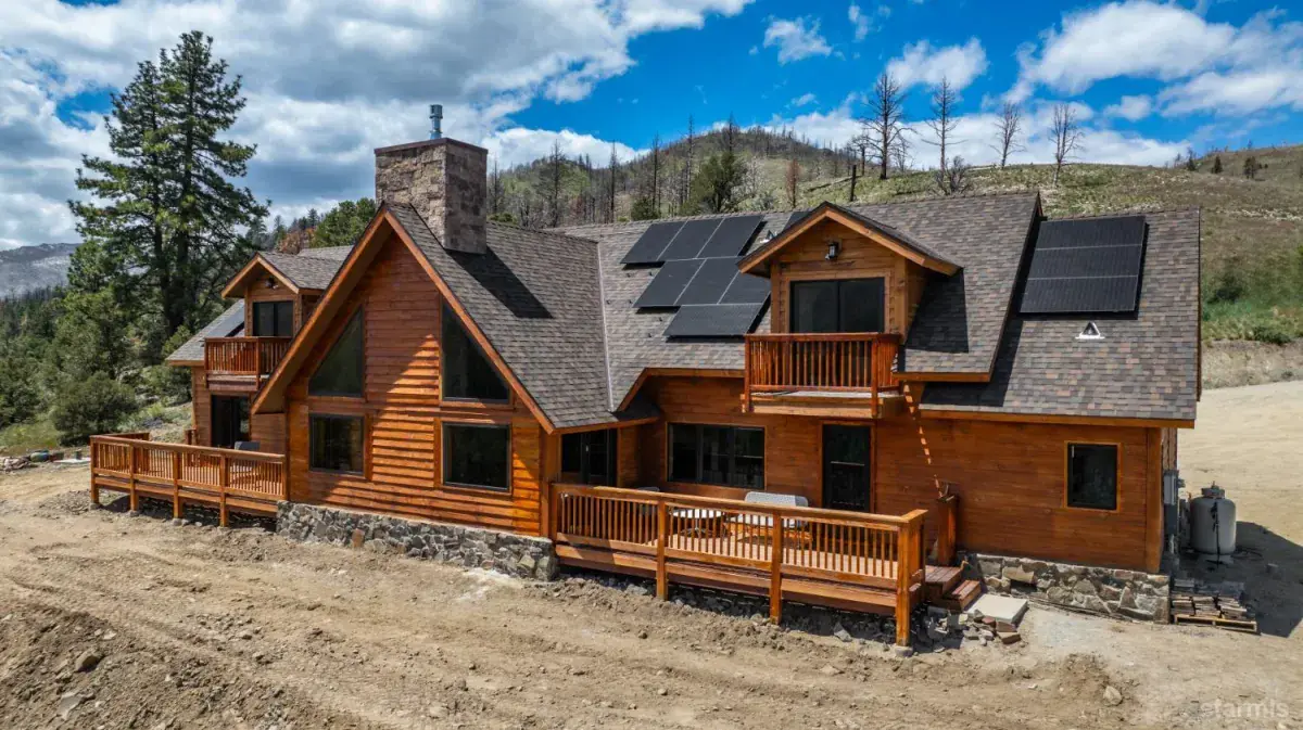 This brand new contemporary log home is now completed and available in beautiful historic Markleeville at the Carson Ridge subdivision. Built to the most rigid 2024 building codes, this classic, architecturally beautiful home will thrill you with fabulous mountain and meadow views.This two- story home includes 3 bedrooms and 3 baths in the main portion of the house, and an additional permitted one bedroom ADU apartment complete with its own kitchen. In total, this 4039 sq ft home boasts 4 bedrooms and 4 bathrooms, 2 full kitchens and a three car garage. The Balcony / loft on the 2nd floor overlooks the great room with soaring 20 ft ceilings. Finished with fine woods throughout including Tiger Wood imported from Brazil, and wood flooring of Brazilian Oak. Custom stained-glass doors allow entrance to the 900 sq ft Recreation Room” complete with a wet bar.No expense has been spared to complete this beauty. This modern, yet classic home is all electric except for cooking range and fireplace which are gas. Fitted with economical Heat Pump forced air heating and air condoning, and a 23 panel solar array which will provide 85% of your electrical needs, you will find this to be a secure and economical way to cool and heat your home. Owner Financing is negotiable and available at a 3.9% rate.