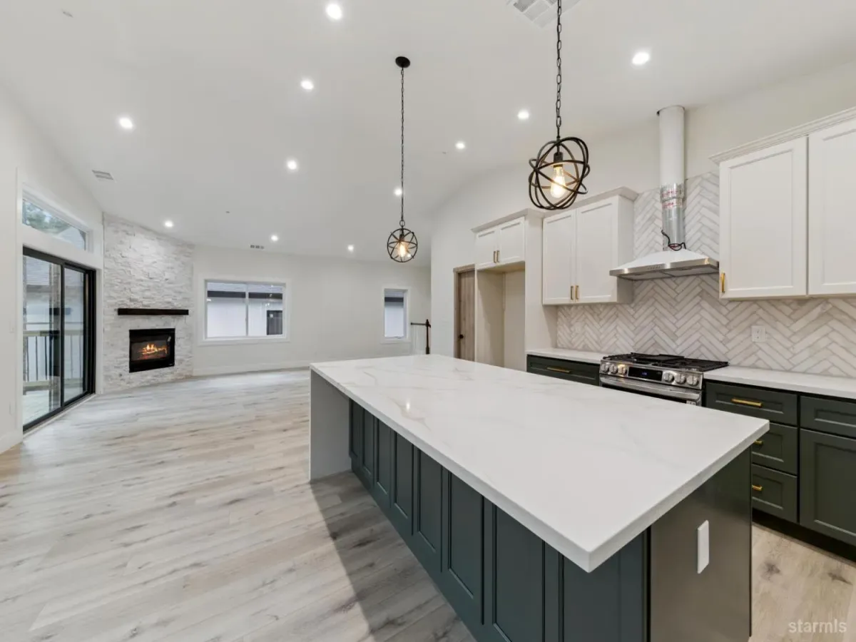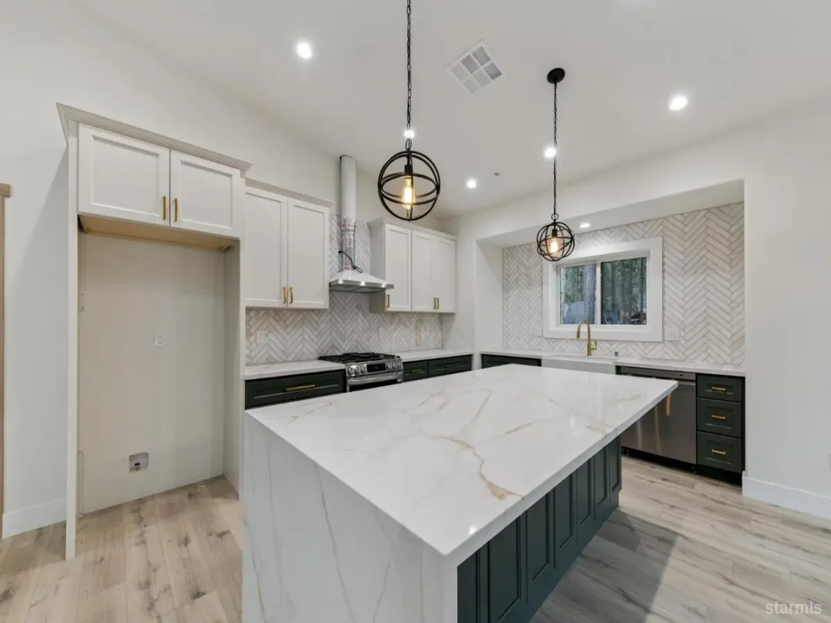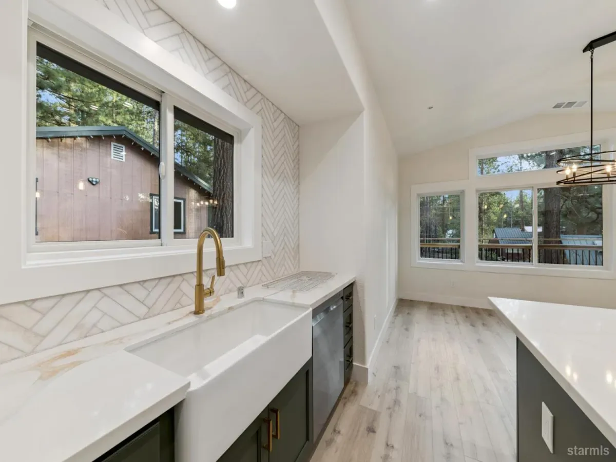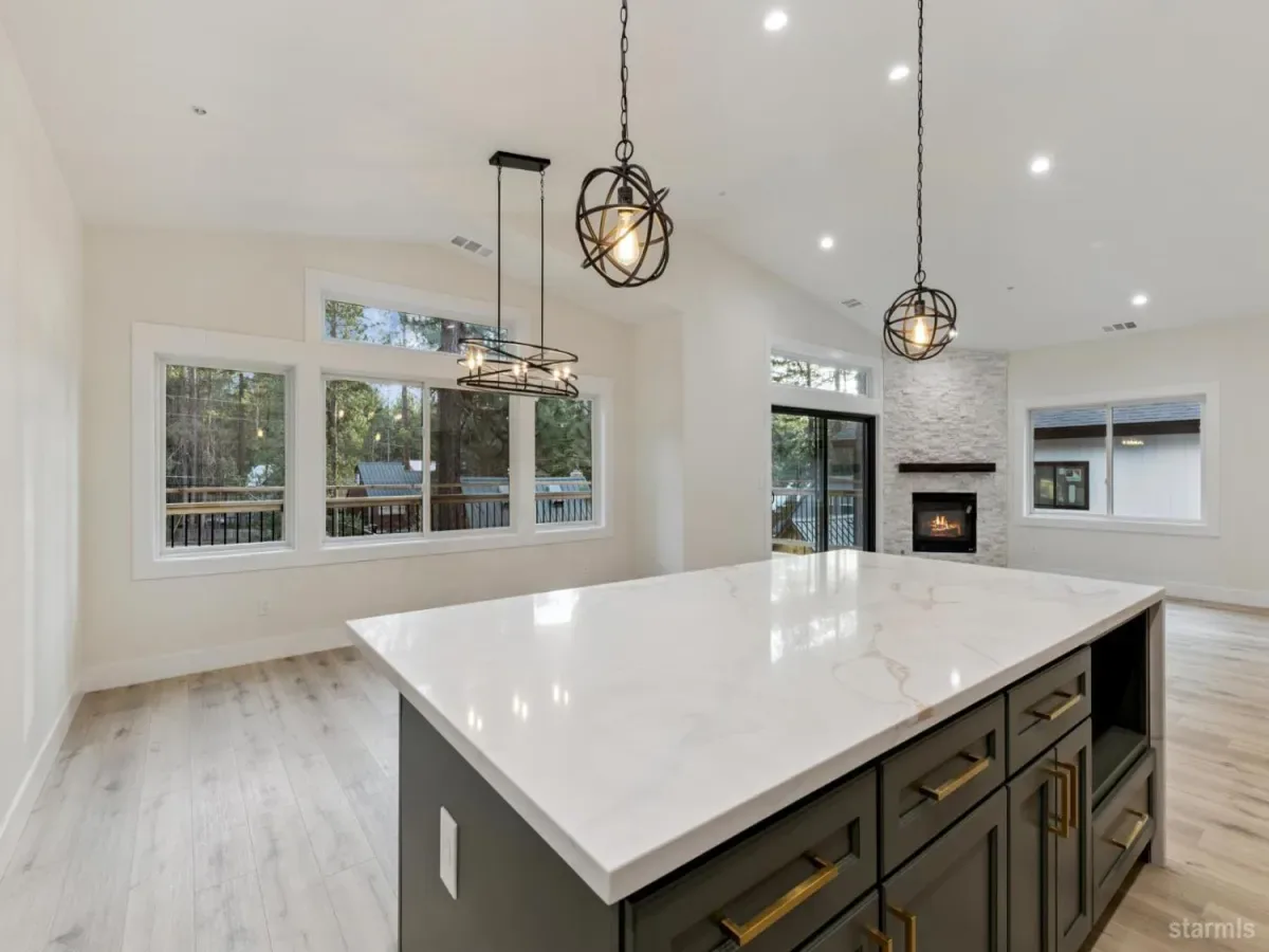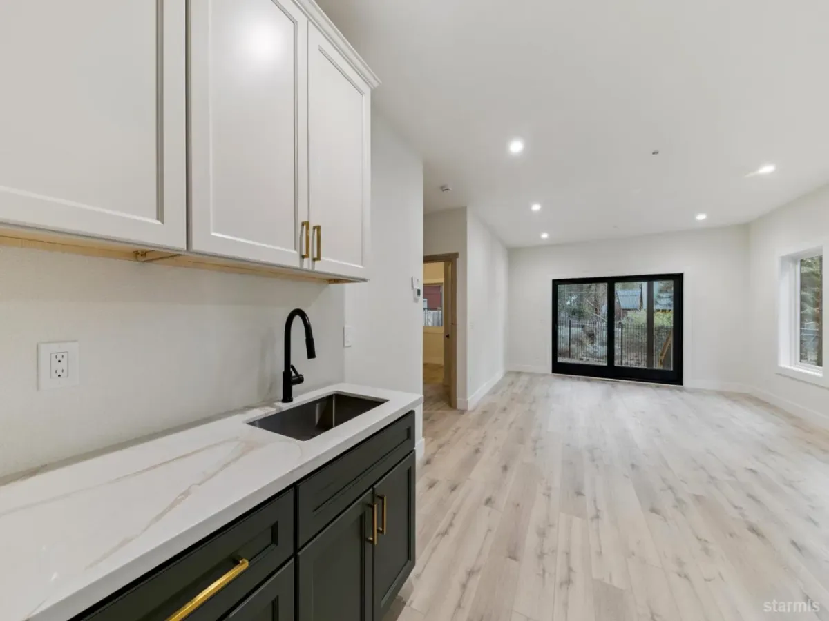 Brand new in Pinewood Terrace, just beneath Heavenly and minutes from Heavenly Village, the Gondola and casino corridor, this one strikes a rare balance of access and privacy. Set near the end of a quiet cul de sac and backing to a vacant USFS lot, the setting feels more tucked away than you would expect this close to the action, with added afternoon light from the rear.From the street, the design stands out with a crisp modern mountain profile, contrasting fiber cement siding, black Andersen windows, warm wood soffits and a paving stone driveway. Inside, the split level entry opens to a dramatic two story foyer and an upstairs great room with vaulted ceilings, wide plank luxury vinyl flooring, expansive glass and a floor to ceiling stone fireplace. A massive redwood deck extends off the living area and looks out over the forested backdrop.The kitchen keeps pace with a large waterfall island, slab quartz, full height herringbone backsplash, custom cabinetry, brushed gold hardware and fixtures, stainless appliances and a walk in pantry. Upstairs, the primary suite offers generous space, a striking bath with soaking tub, separate shower, dual vanity and a large walk in closet.Downstairs, a second living area with wet bar adds flexibility for a game room, media room or overflow space, along with 2 additional bedrooms, another full bath and access to the 2 car garage. High efficiency systems include a modern furnace and tankless hot water.For buyers with one eye on income potential, the timing here matters as the City’s updated VHR program rolls out. The same builder also has another newly completed home next door, creating a rare chance for friends, family or investors to secure adjacent properties near Heavenly.