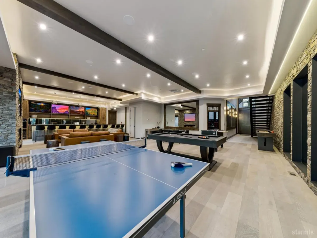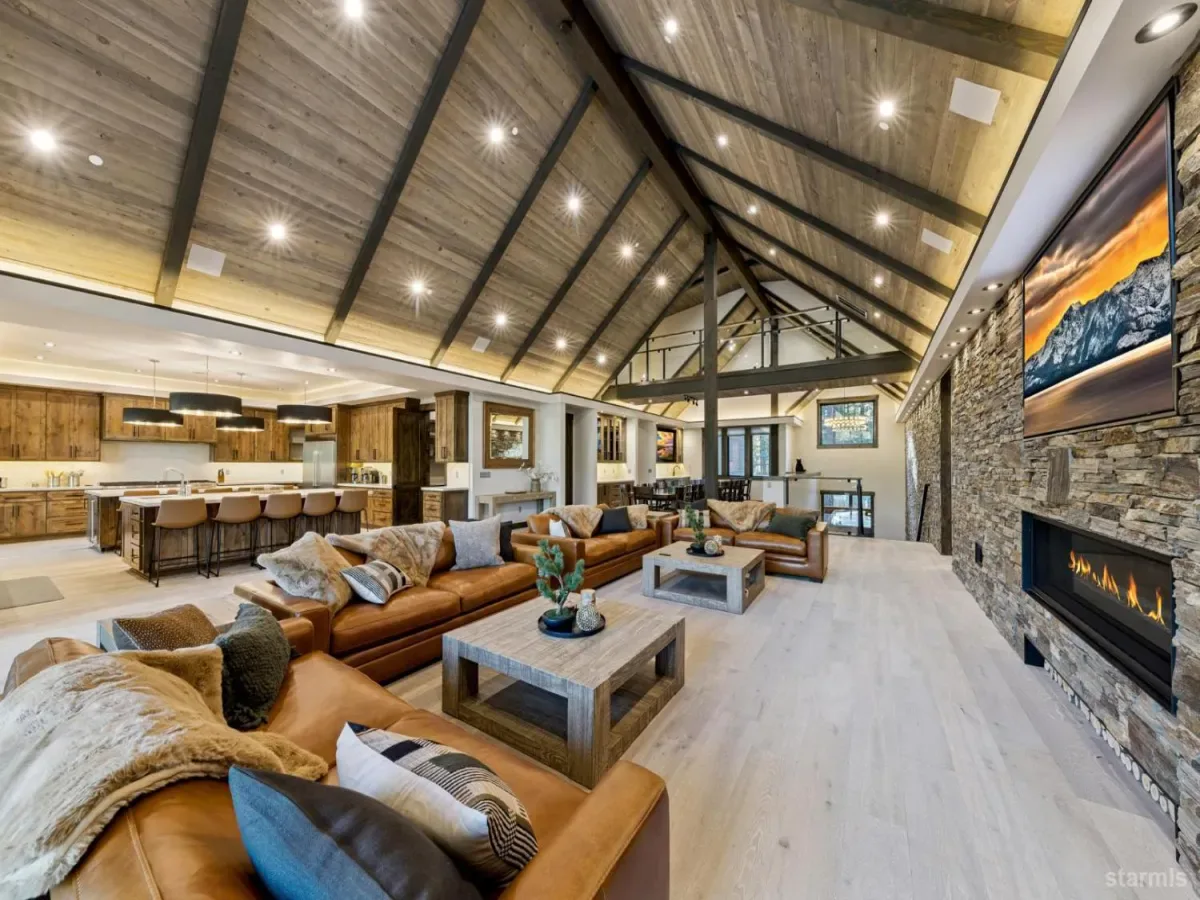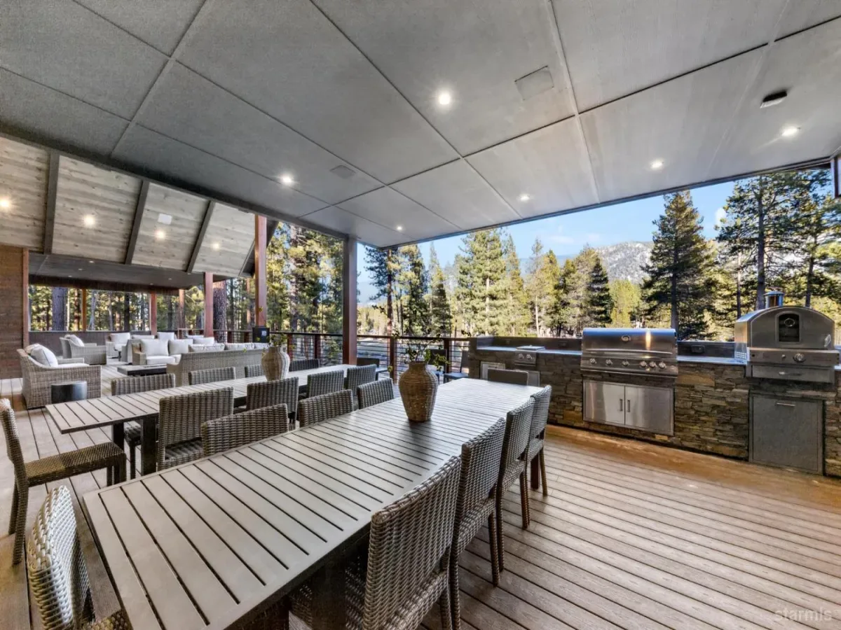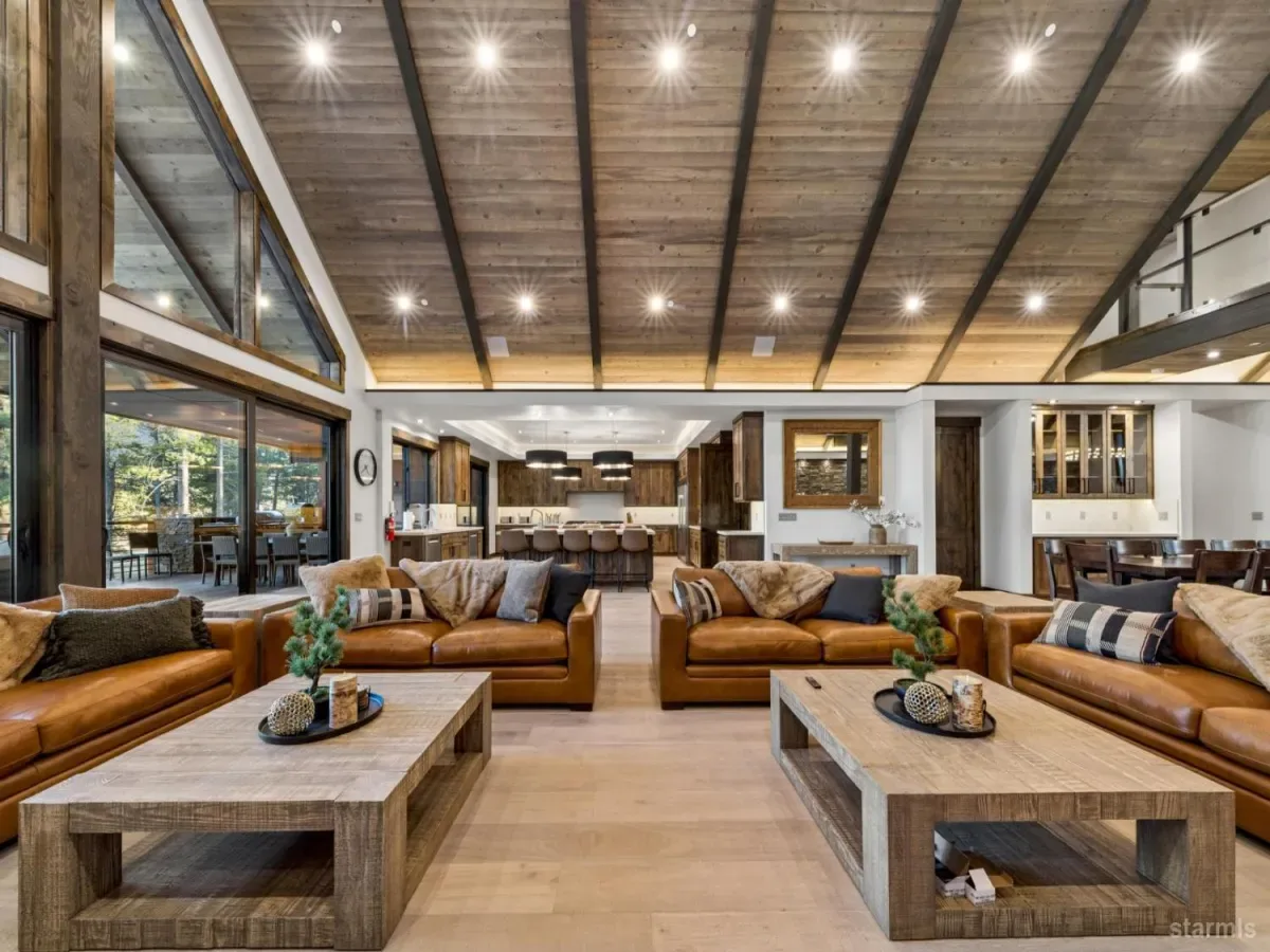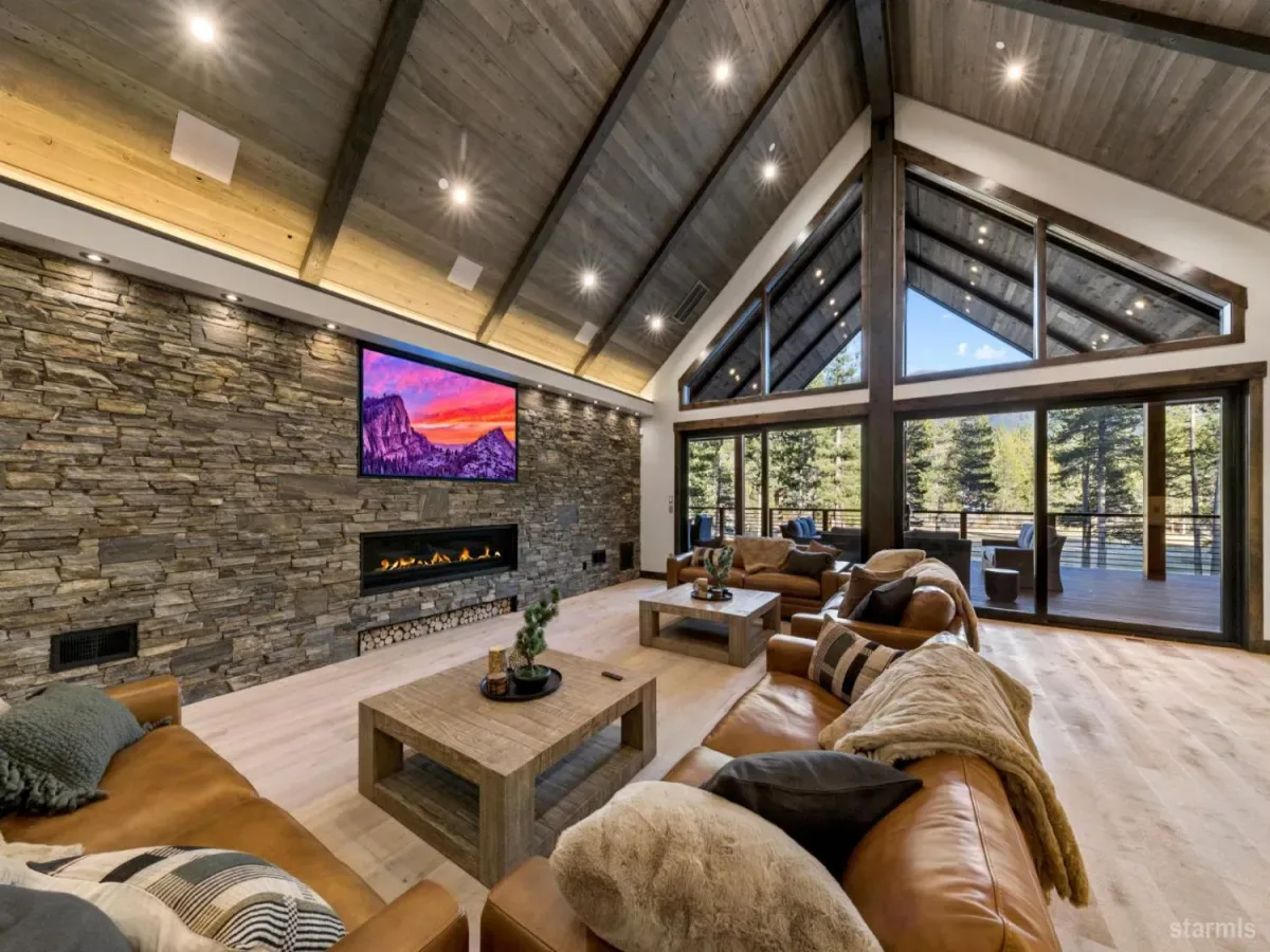 Backing to Bijou Golf Course on a flat, highly usable .63-acre parcel, this newly completed estate by Bob McIntyre reflects one of Tahoe’s most tenured and respected builders, known for delivering grand alpine homes that balance scale, function, and design. The approach is defined by layered rooflines, a thoughtful mix of vertical and horizontal cedar siding in a rich stain, black-framed windows, and substantial natural stone that grounds the home in its setting. – – The main living level opens with volume and warmth, featuring cathedral ceilings, exposed beams, and a wall of glass framing the golf course, surrounding pines, and filtered views toward Heavenly Ski Resort. A linear stone fireplace anchors the great room, which flows into a dining area designed for large gatherings, supported by additional cabinetry, beverage storage, and service space. The kitchen is built for real use at scale with dual islands, three dishwashers, dual 48-inch ranges, an additional wall oven, 72-inch built-in refrigeration, and a full walk-in pantry, offering both performance and efficiency whether hosting or unwinding. A covered rear deck extends the living space with composite decking, built-in BBQ, cooktop, pizza oven, and ample room for dining and lounge areas. – – The lower level is dedicated to entertainment, with over 3,400-sf designed to bring people together. A full walk-behind bar with seating for eleven anchors the space, complemented by multiple game areas, a theater room with high-end audio, and a wall of glass connecting to an indoor pool and steam suite. A 1,500-sf covered deck with fire feature and spa extends the experience outdoors, with a backyard designed for additional recreation. – – All 11 bedrooms are en suite, offering consistent comfort and privacy, with select suites featuring fireplaces or deck access. A separate-entry unit provides flexibility for extended stays or caretaker use with ADA-friendly design. Additional features include a tandem 4-car garage, dual laundry rooms, and a planned elevator connecting the garage to the main living level. – – Spanning 10,303-sf, the home is currently operating as a high-performing vacation rental with strong 2026 bookings already in place. A rare combination of scale, usability, and proven performance.