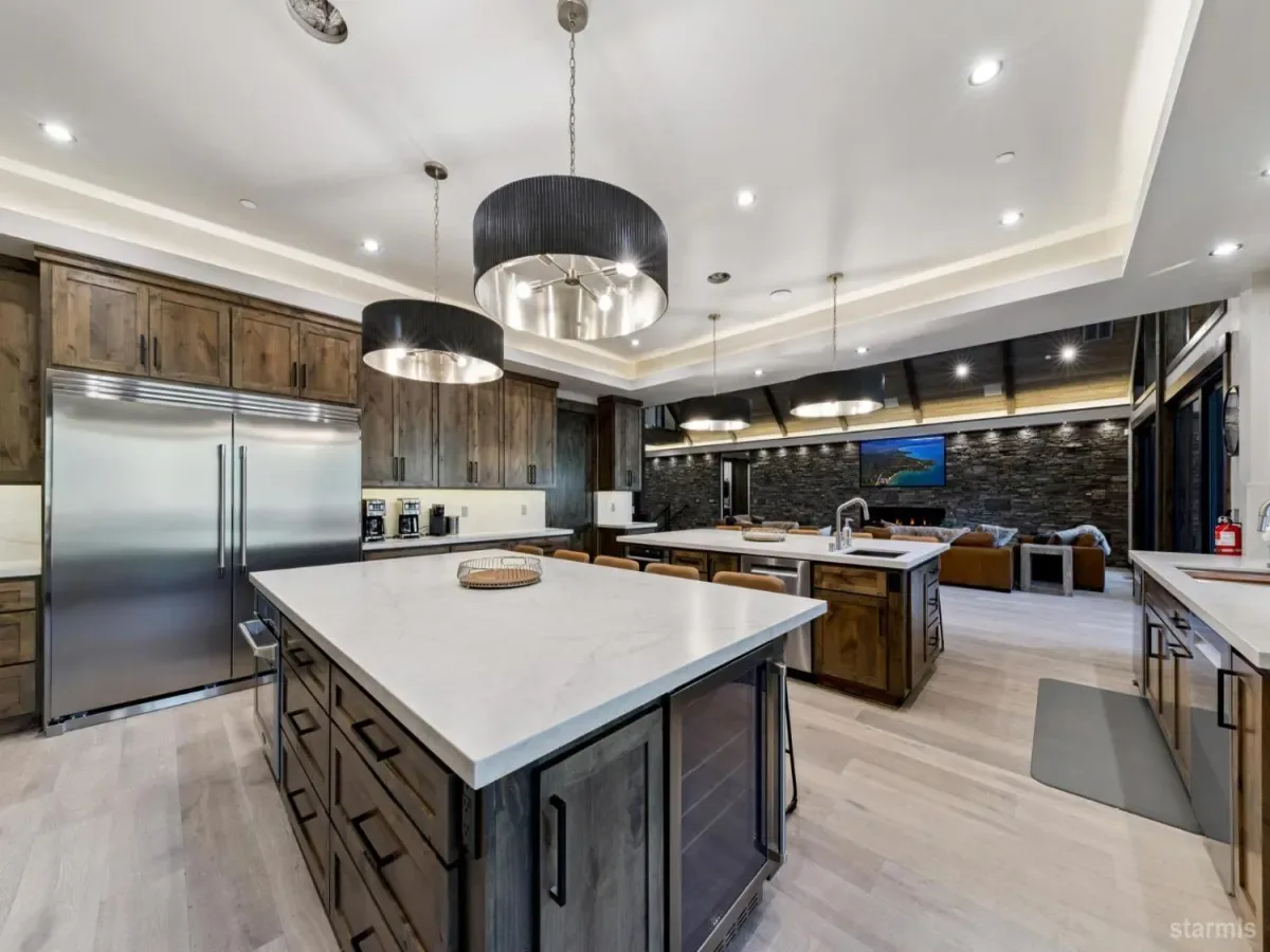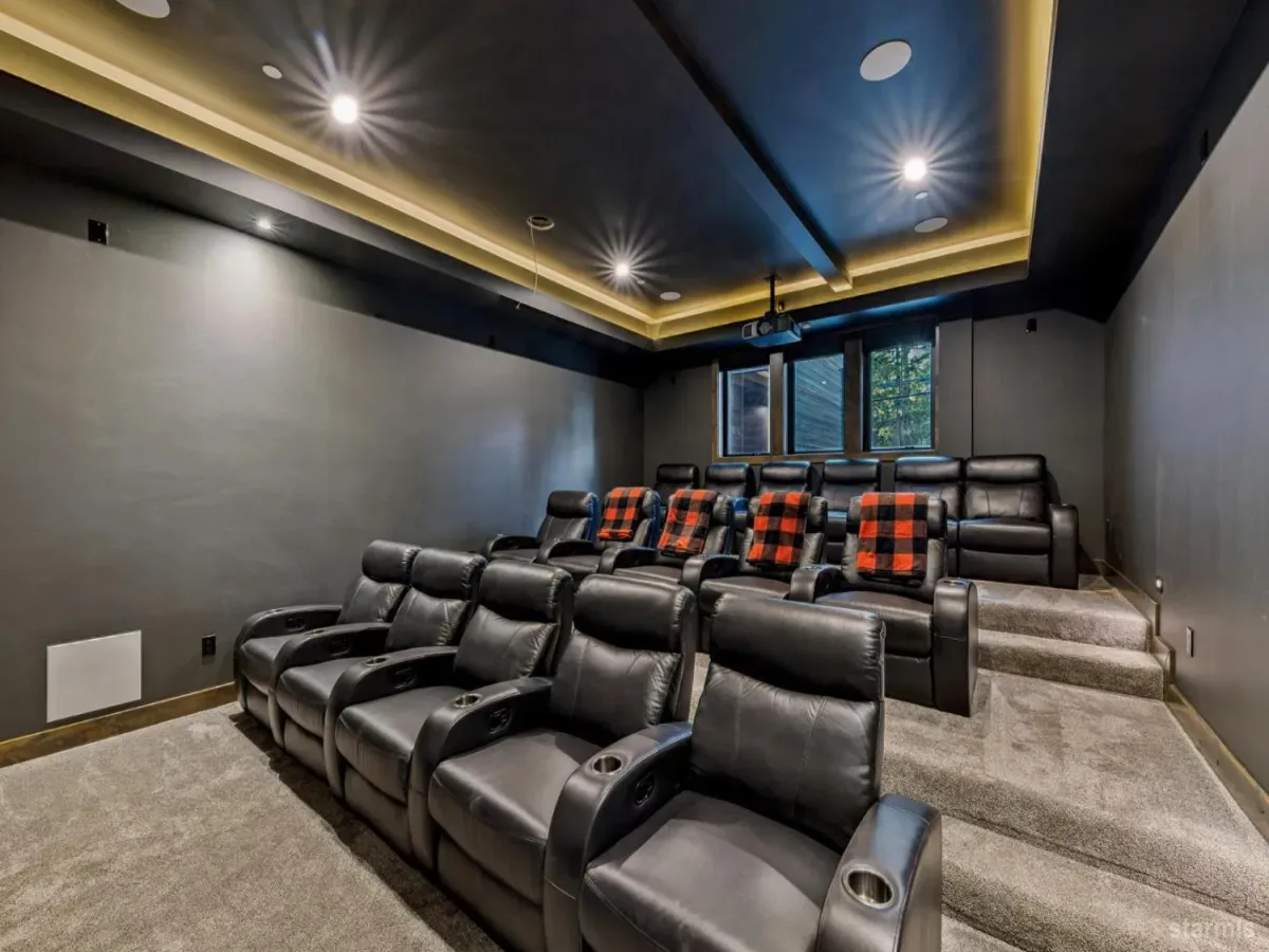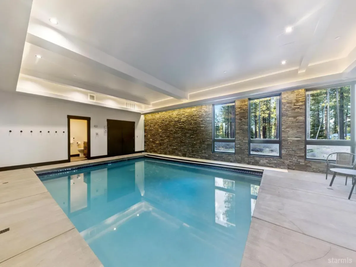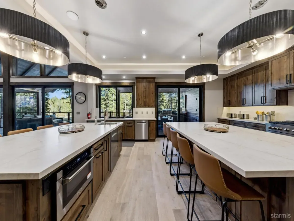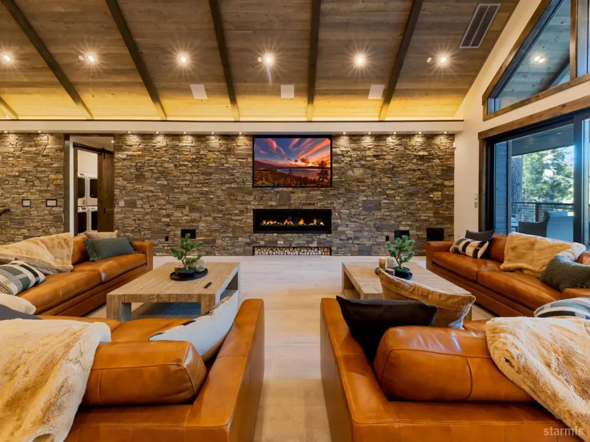 Backing to Bijou Golf Course on a flat, highly usable .63-acre parcel, this newly completed estate by Bob McIntyre reflects one of Tahoe’s most tenured and respected builders, known for delivering grand alpine homes that balance scale, function, and design. The approach is defined by layered rooflines, a thoughtful mix of vertical and horizontal cedar siding in a rich stain, black-framed windows, and substantial natural stone that grounds the home in its setting. – – The main living level opens with volume and warmth, featuring cathedral ceilings, exposed beams, and a wall of glass framing the golf course, surrounding pines, and filtered views toward Heavenly Ski Resort. A linear stone fireplace anchors the great room, which flows into a dining area designed for large gatherings, supported by additional cabinetry, beverage storage, and service space. The kitchen is built for real use at scale with dual islands, three dishwashers, dual 48-inch ranges, an additional wall oven, 72-inch built-in refrigeration, and a full walk-in pantry, offering both performance and efficiency whether hosting or unwinding. A covered rear deck extends the living space with composite decking, built-in BBQ, cooktop, pizza oven, and ample room for dining and lounge areas. – – The lower level is dedicated to entertainment, with over 3,400-sf designed to bring people together. A full walk-behind bar with seating for eleven anchors the space, complemented by multiple game areas, a theater room with high-end audio, and a wall of glass connecting to an indoor pool and steam suite. A 1,500-sf covered deck with fire feature and spa extends the experience outdoors, with a backyard designed for additional recreation. – – All 11 bedrooms are en suite, offering consistent comfort and privacy, with select suites featuring fireplaces or deck access. A separate-entry unit provides flexibility for extended stays or caretaker use with ADA-friendly design. Additional features include a tandem 4-car garage, dual laundry rooms, and a planned elevator connecting the garage to the main living level. – – Spanning 10,303-sf, the home is currently operating as a high-performing vacation rental with strong 2026 bookings already in place. A rare combination of scale, usability, and proven performance.