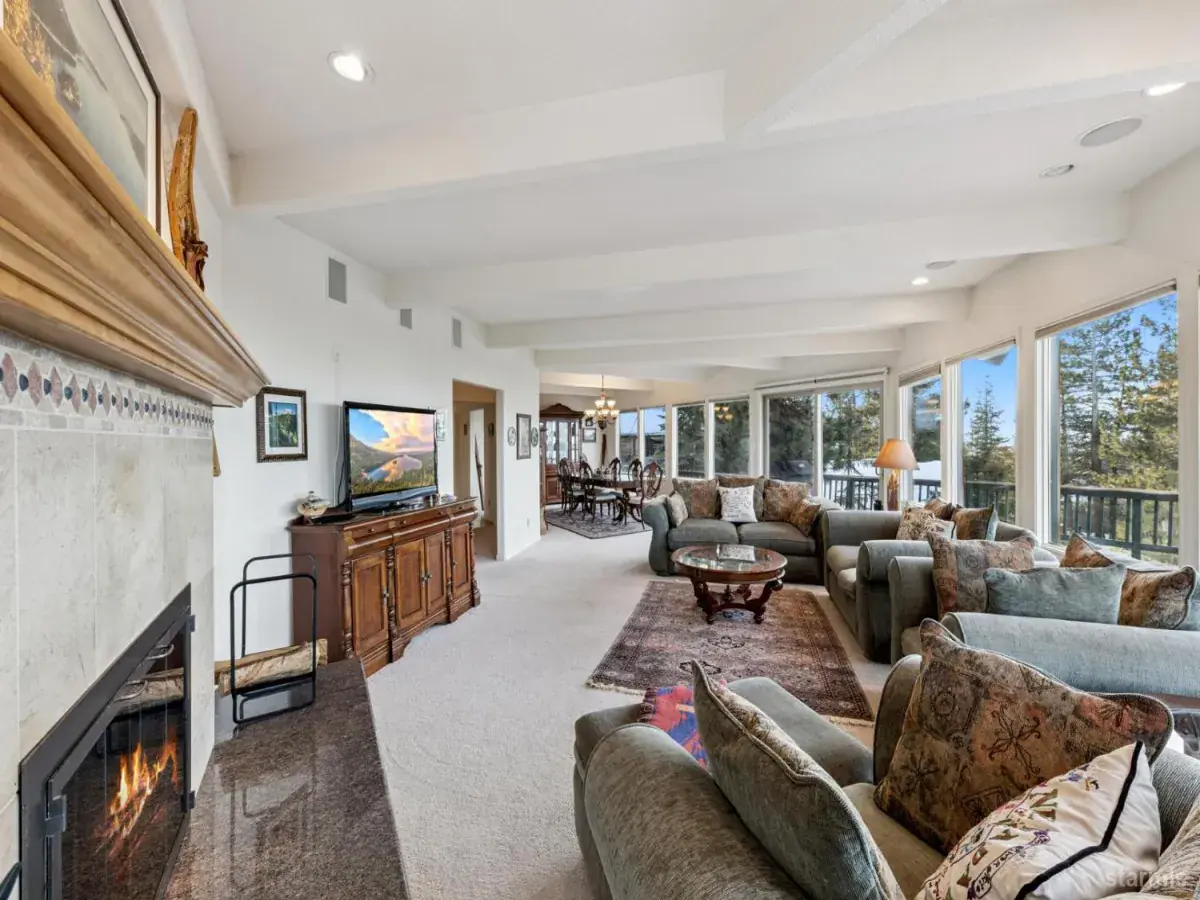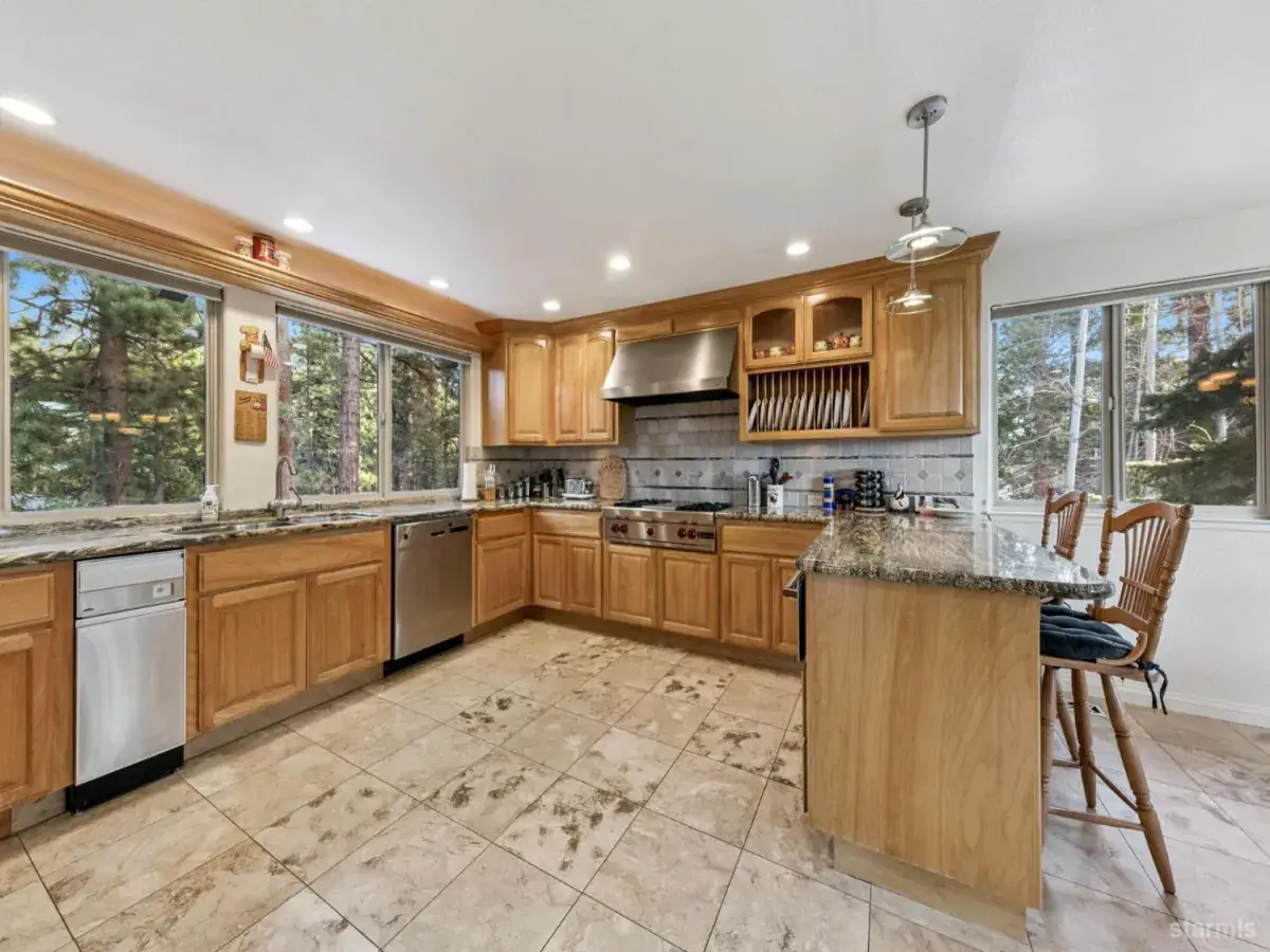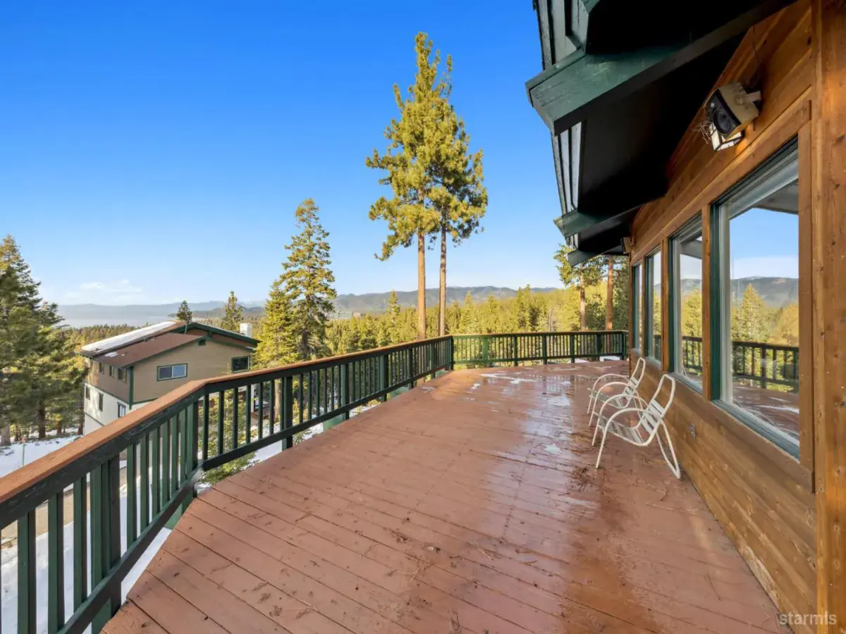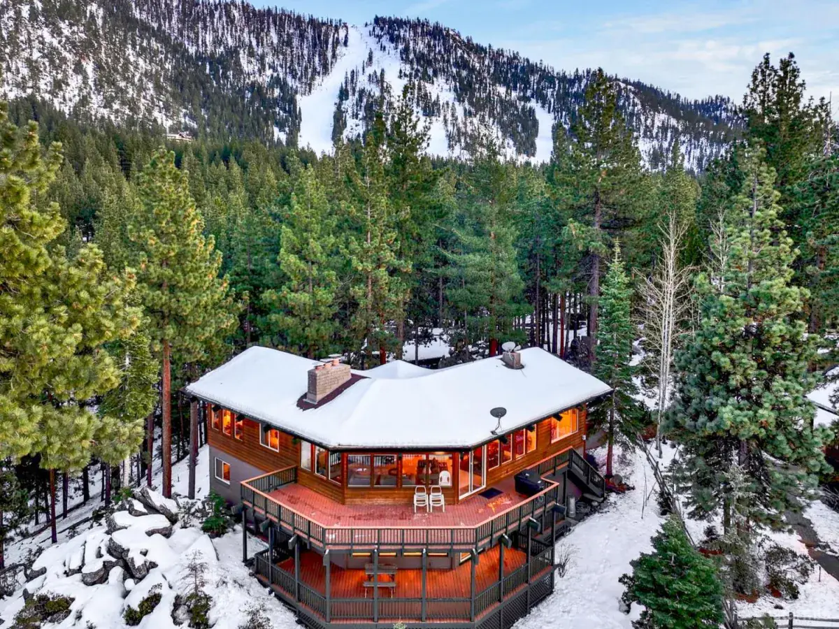 Tucked at the very end of a quiet dead-end street beneath the California base of Heavenly, this is one of those locations that simply should not exist anymore. While surrounded by mid-town convenience, the setting feels remarkably removed, bordered by a natural greenbelt of USFS land and granite boulder outcroppings that wrap the property in forested calm. – – The parcel spans approximately 0.37 acres and offers an unusually expansive driveway with room for 8 to 10 vehicles, in addition to a two-car garage. It is a rare combination of scale, usability, and setting for this part of town. – – The home itself is exceptionally well built, anchored by substantial concrete block construction that delivers a sense of permanence and strength, softened by rustic cedar siding and classic mountain character. The architecture follows the contours of the land, pressing against granite at the sides and opening dramatically to the rear, where sweeping lake views define the experience. – – Upper-level living was designed to capture those views from nearly every room, with expansive rear decks wrapping the entire back of the home. Sightlines stretch from the southern end of Lake Tahoe across the basin to the downtown casino core, all enjoyed in near silence, with little more than wind through the trees and wildlife nearby. – – The main living area is generous and open, centered around a large fireplace and flowing naturally into a semi-formal dining space. The kitchen is equally well appointed, featuring a built-in Sub-Zero refrigerator, gas cooktop, double wall ovens, warming drawer, peninsula seating, and a breakfast nook positioned to take in the lake views. – – The upper level also includes two bedrooms, highlighted by a spacious primary suite with a well-finished bath, dual vanity, and a large walk-in shower with rain head and body sprays. – – A traditional mountain pub-style family room anchors the lower level, complete with an open fireplace framed in antique brick, a coffered ceiling and billiards at center stage. A true walk-behind bar includes a bar sink, mini dishwasher, dual under-counter beverage refers, liquor display cabinets, and an etched Lake Tahoe mirror that feels straight out of a private lodge. – – Two additional bedrooms and a full bath complete the lower level, along with a large mechanical and storage room ideal for gear. The garage includes an alcove mudroom designed for skis, boards, and wet winter days. – – This is a legacy-caliber property in one of the most premium micro-locations near Heavenly, particularly compelling for buyers who prioritize skiing access without sacrificing summer livability.