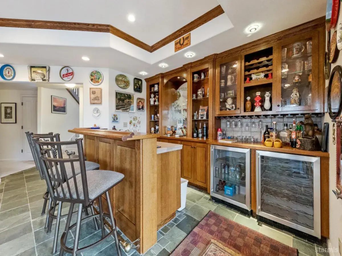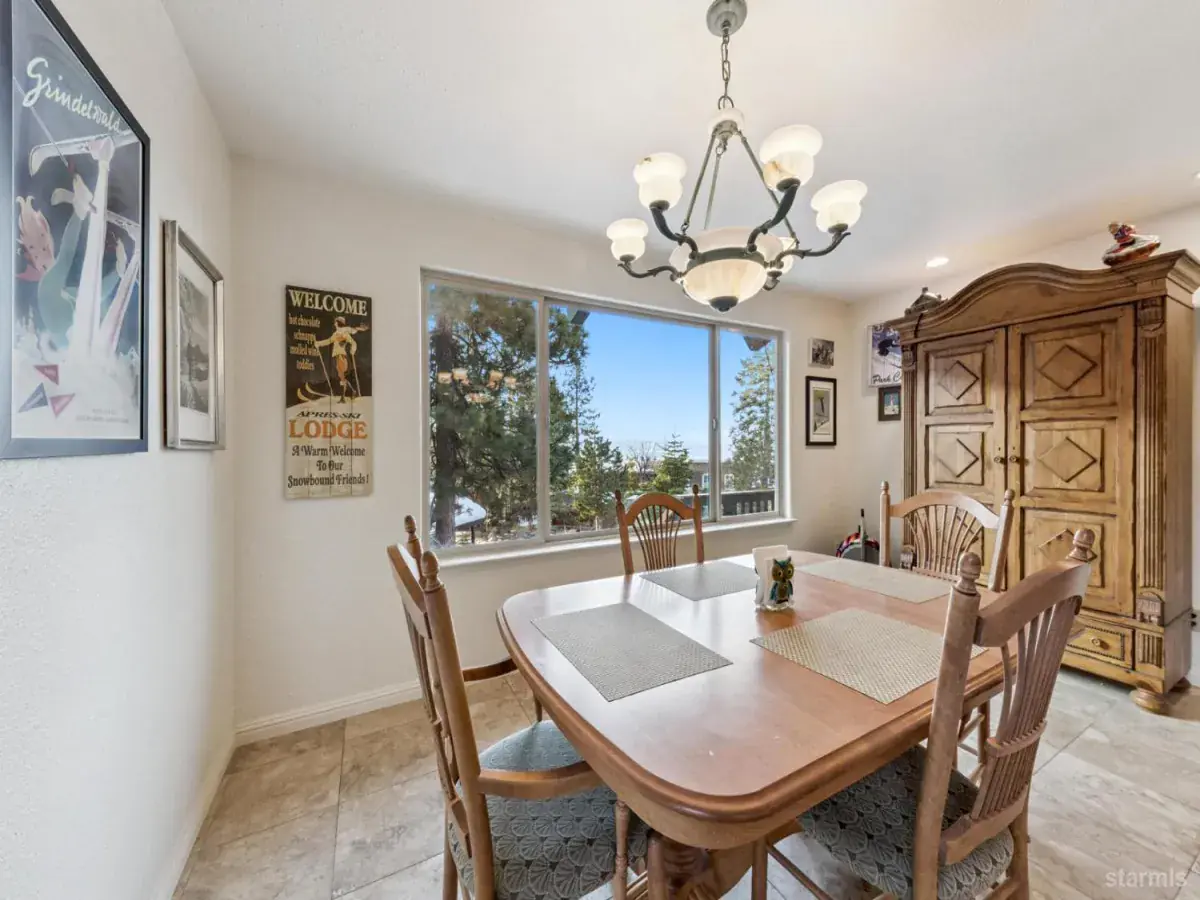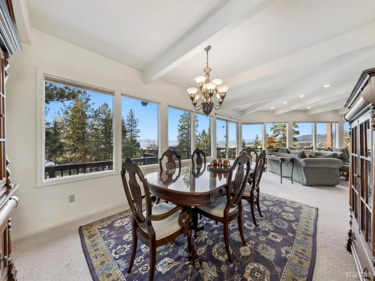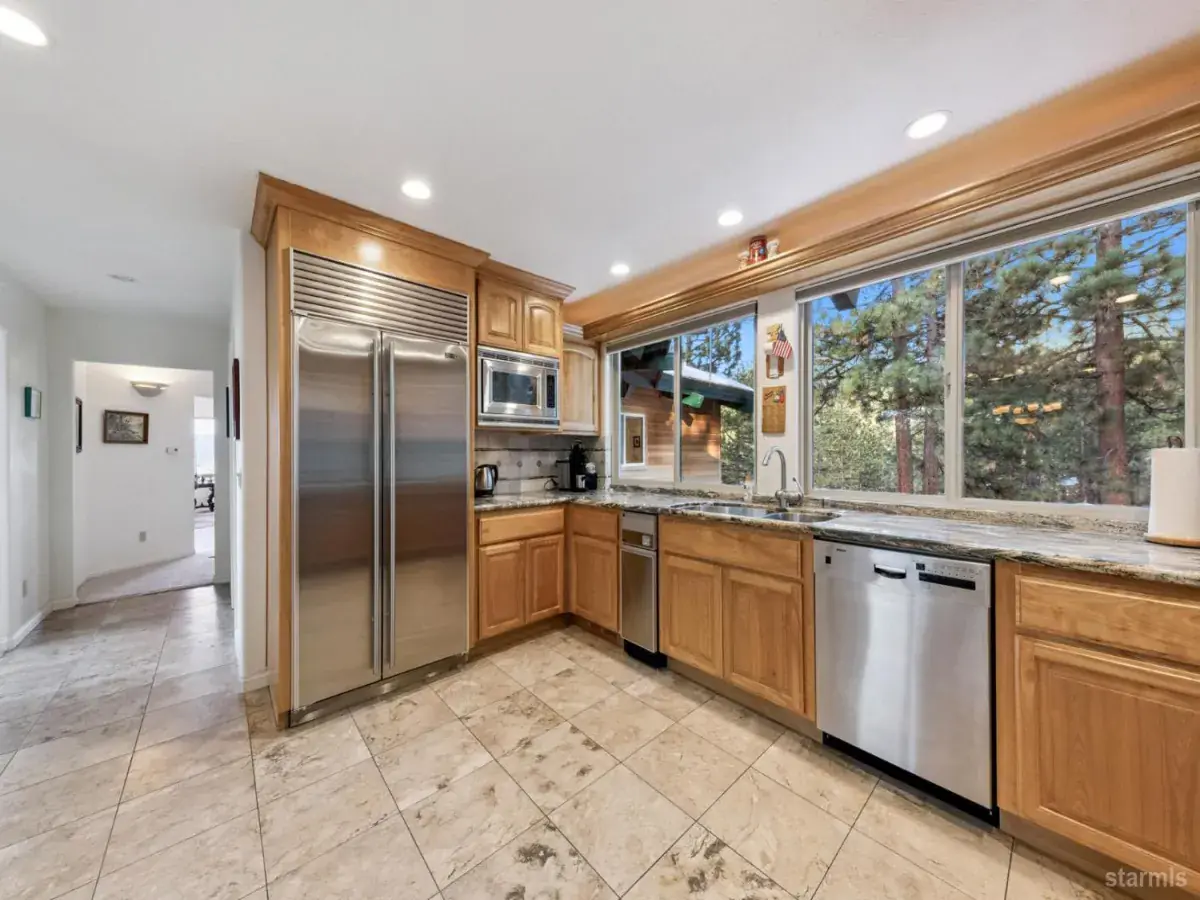 Tucked at the very end of a quiet dead-end street beneath the California base of Heavenly, this is one of those locations that simply should not exist anymore. While surrounded by mid-town convenience, the setting feels remarkably removed, bordered by a natural greenbelt of USFS land and granite boulder outcroppings that wrap the property in forested calm. – – The parcel spans approximately 0.37 acres and offers an unusually expansive driveway with room for 8 to 10 vehicles, in addition to a two-car garage. It is a rare combination of scale, usability, and setting for this part of town. – – The home itself is exceptionally well built, anchored by substantial concrete block construction that delivers a sense of permanence and strength, softened by rustic cedar siding and classic mountain character. The architecture follows the contours of the land, pressing against granite at the sides and opening dramatically to the rear, where sweeping lake views define the experience. – – Upper-level living was designed to capture those views from nearly every room, with expansive rear decks wrapping the entire back of the home. Sightlines stretch from the southern end of Lake Tahoe across the basin to the downtown casino core, all enjoyed in near silence, with little more than wind through the trees and wildlife nearby. – – The main living area is generous and open, centered around a large fireplace and flowing naturally into a semi-formal dining space. The kitchen is equally well appointed, featuring a built-in Sub-Zero refrigerator, gas cooktop, double wall ovens, warming drawer, peninsula seating, and a breakfast nook positioned to take in the lake views. – – The upper level also includes two bedrooms, highlighted by a spacious primary suite with a well-finished bath, dual vanity, and a large walk-in shower with rain head and body sprays. – – A traditional mountain pub-style family room anchors the lower level, complete with an open fireplace framed in antique brick, a coffered ceiling and billiards at center stage. A true walk-behind bar includes a bar sink, mini dishwasher, dual under-counter beverage refers, liquor display cabinets, and an etched Lake Tahoe mirror that feels straight out of a private lodge. – – Two additional bedrooms and a full bath complete the lower level, along with a large mechanical and storage room ideal for gear. The garage includes an alcove mudroom designed for skis, boards, and wet winter days. – – This is a legacy-caliber property in one of the most premium micro-locations near Heavenly, particularly compelling for buyers who prioritize skiing access without sacrificing summer livability.