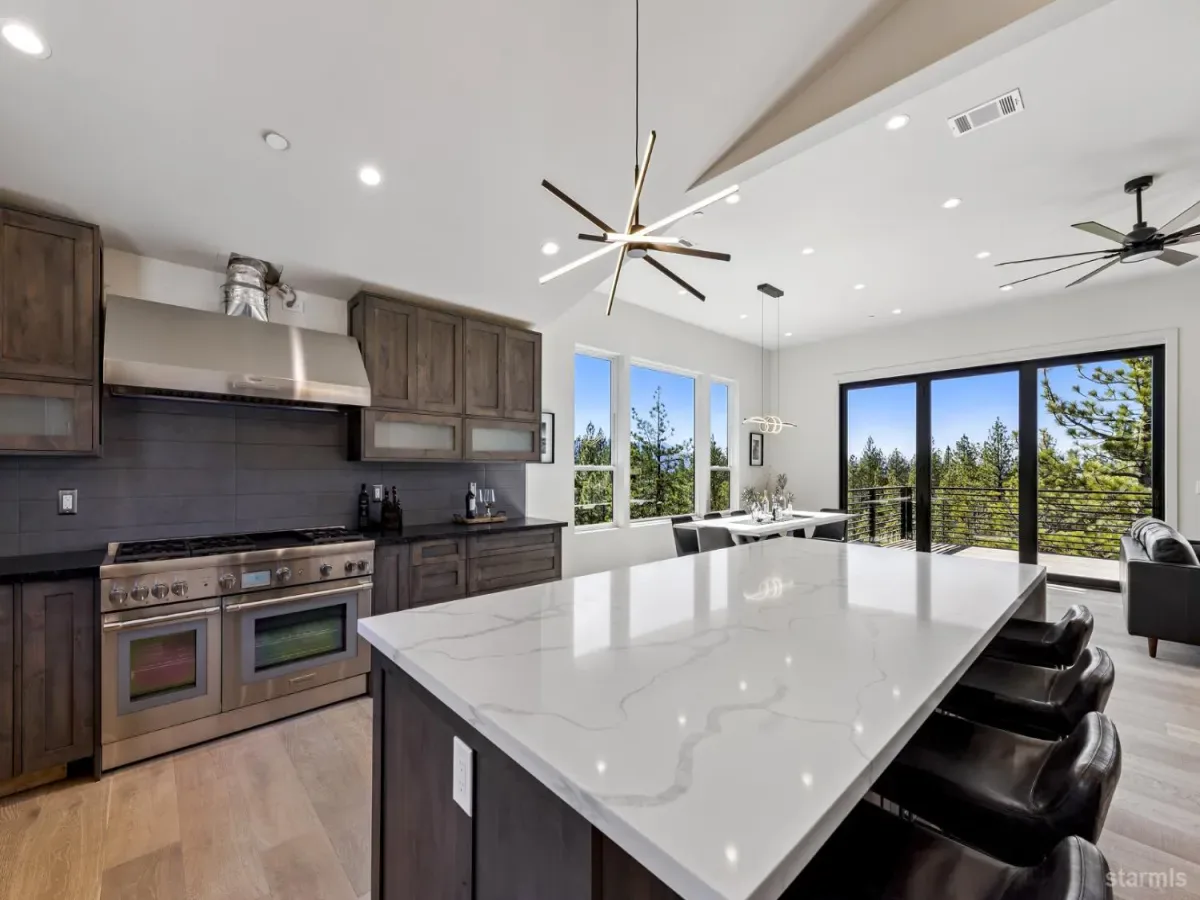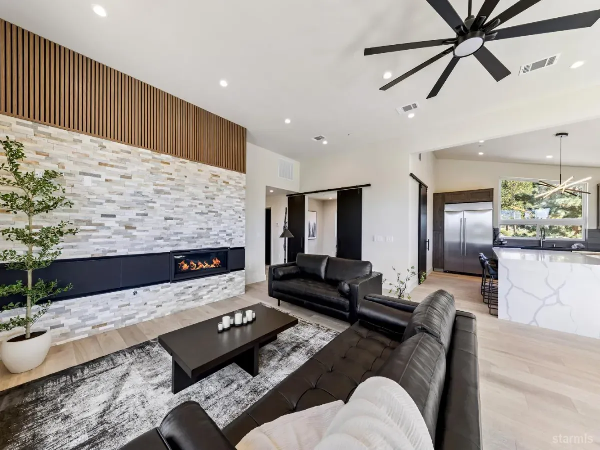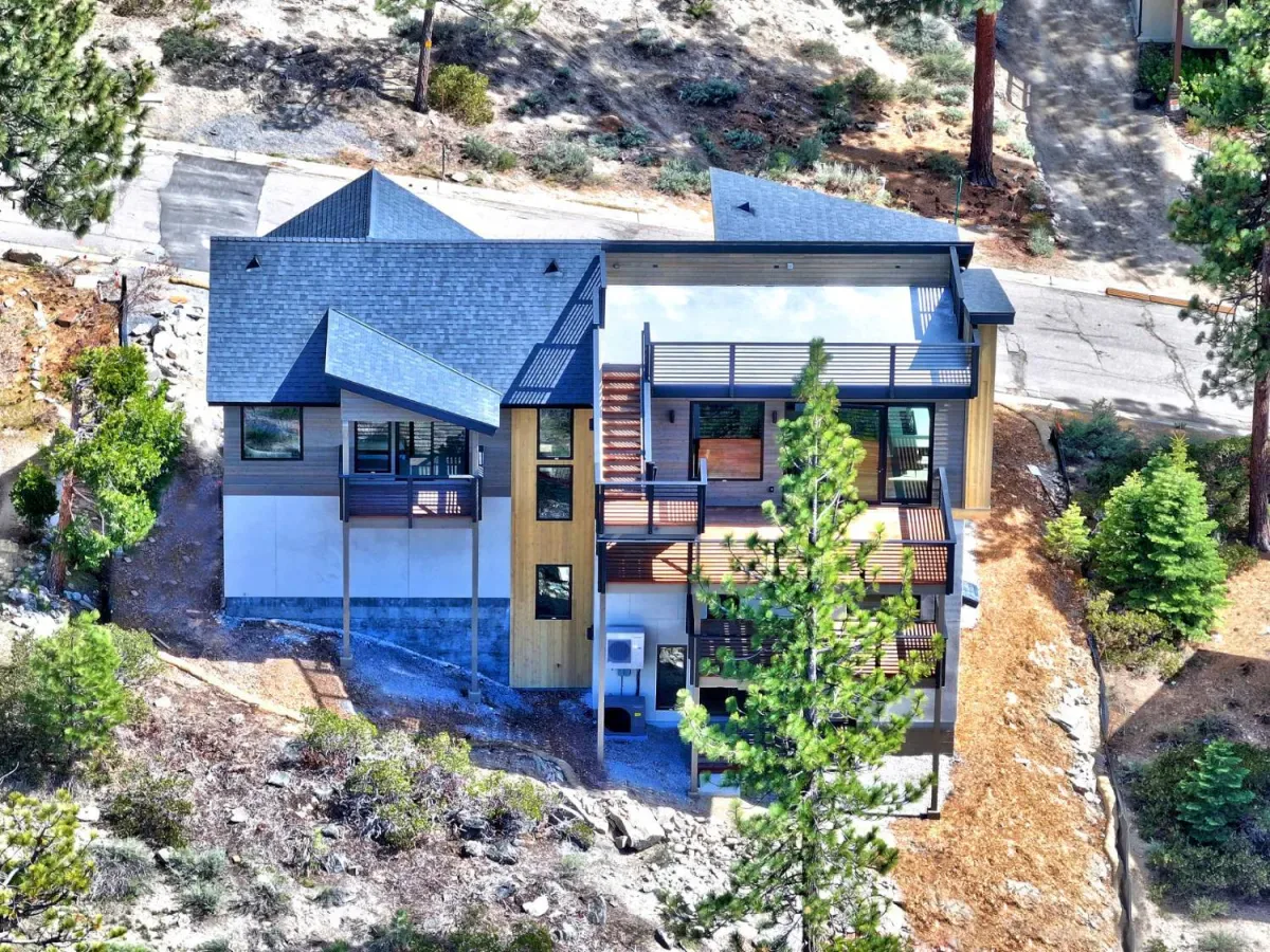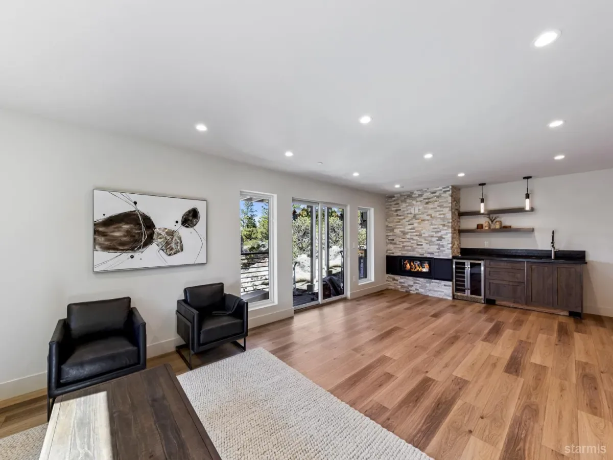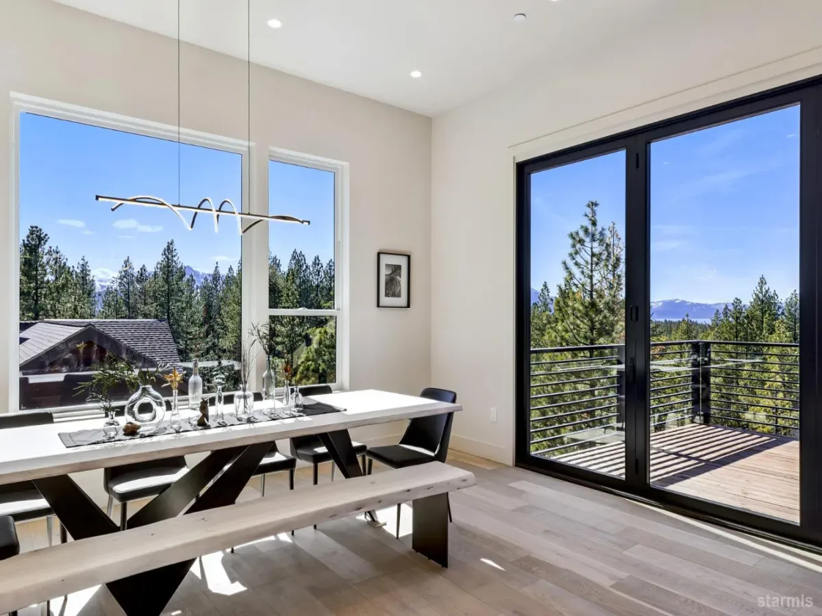 Brand new luxurious home located in the desirable Heavenly Valley area of South Lake Tahoe overlooking multiple Forest Service owned lots. This 3,421 square foot custom home features 4 bedrooms, 4.5 bathrooms, and a 2-car garage and sits on a sunny 11,617 square foot lot with panoramic mountain views and filtered views of Lake Tahoe. The location offers easy access to Heavenly Ski Resort, Stateline, and the lake, making it ideal for both year-round living and vacation use.The spacious upstairs living area is designed to take full advantage of the views and includes tall ceilings, brushed white oak hardwood flooring, and a beautiful contemporary gas fireplace. An Andersen folding door fully opens the living room to the back deck, creating seamless indoor-outdoor living and framing the surrounding mountain scenery and filtered lake views. From the back deck, stairs lead to an expansive rooftop deck offering 360-degree mountain views and stunning views of Lake Tahoe.The kitchen is finished with custom knotty alder cabinetry, granite and quartz countertops, and high-end Thermador appliances, including a built-in 48-inch refrigerator and a 48-inch dual-oven gas range. Additional features include two dishwashers, a built-in microwave, and generous counter space, making it well suited for entertaining and larger gatherings.The primary suite is located on the main living level and includes a private balcony with filtered lake views, a spacious walk-in closet, and a spa like bathroom with a freestanding soaking tub overlooking the mountains, dual-sink vanity, and a stunning custom tile shower.Additionally, there is an office/flex space on the main level that offers a light and bright space to set up a home office.Downstairs are three additional guest bedrooms, including a junior primary suite with its own en-suite bathroom. The other two bedrooms share a Jack and Jill bathroom finished with custom tile and modern fixtures. The laundry room features built-in cabinetry and a utility sink for added convenience.The first floor boasts a large game room with a gas fireplace, wet bar, and a full bathroom. This flexible space could easily function as a theater room, second family room, or even be converted into a fifth bedroom.This exceptional new home offers a rare combination of quality construction, expansive living space, and panoramic mountain and lake views in one of South Lake Tahoe’s most desirable locations.