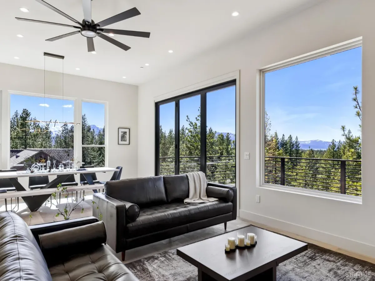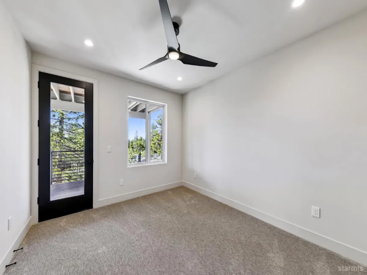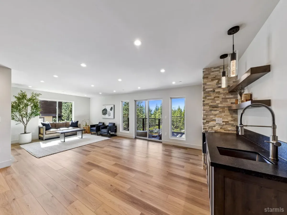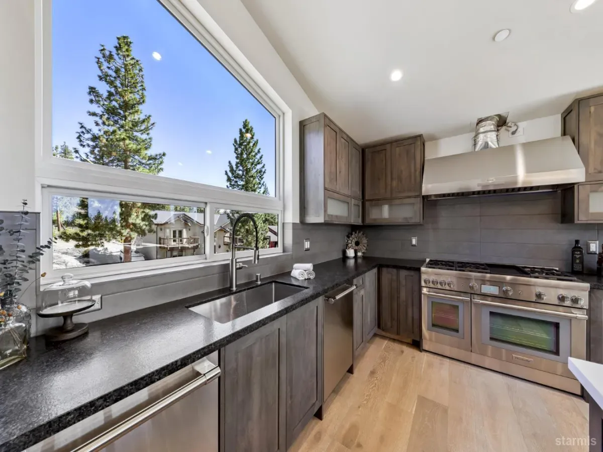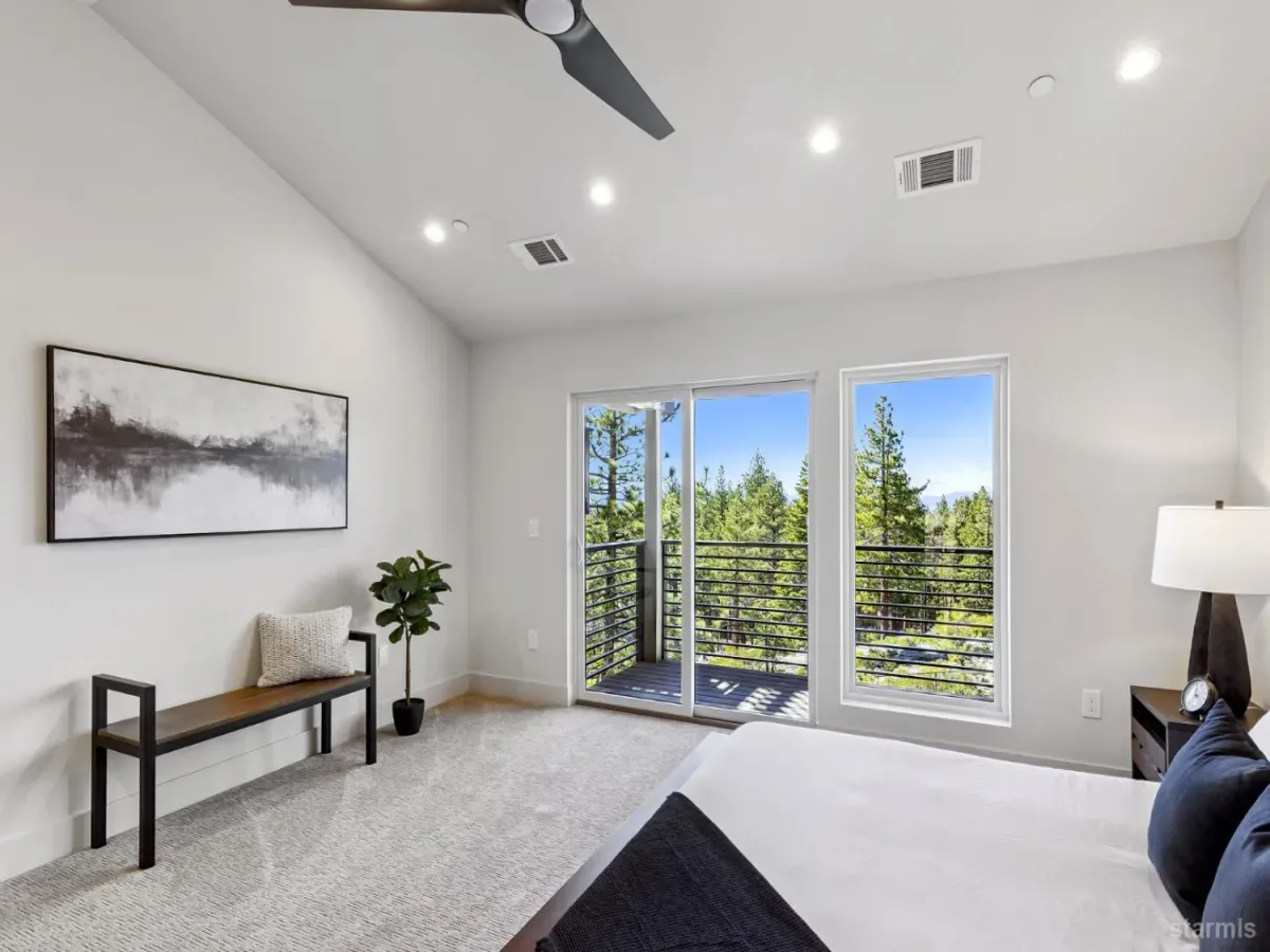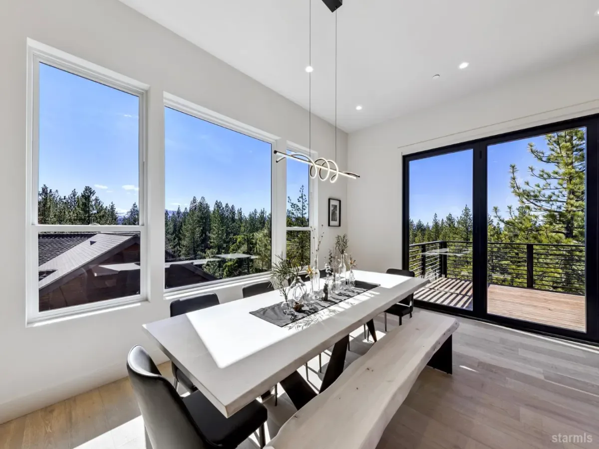 Brand new luxurious home located in the desirable Heavenly Valley area of South Lake Tahoe overlooking multiple Forest Service owned lots. This 3,421 square foot custom home features 4 bedrooms, 4.5 bathrooms, and a 2-car garage and sits on a sunny 11,617 square foot lot with panoramic mountain views and filtered views of Lake Tahoe. The location offers easy access to Heavenly Ski Resort, Stateline, and the lake, making it ideal for both year-round living and vacation use.The spacious upstairs living area is designed to take full advantage of the views and includes tall ceilings, brushed white oak hardwood flooring, and a beautiful contemporary gas fireplace. An Andersen folding door fully opens the living room to the back deck, creating seamless indoor-outdoor living and framing the surrounding mountain scenery and filtered lake views. From the back deck, stairs lead to an expansive rooftop deck offering 360-degree mountain views and stunning views of Lake Tahoe.The kitchen is finished with custom knotty alder cabinetry, granite and quartz countertops, and high-end Thermador appliances, including a built-in 48-inch refrigerator and a 48-inch dual-oven gas range. Additional features include two dishwashers, a built-in microwave, and generous counter space, making it well suited for entertaining and larger gatherings.The primary suite is located on the main living level and includes a private balcony with filtered lake views, a spacious walk-in closet, and a spa like bathroom with a freestanding soaking tub overlooking the mountains, dual-sink vanity, and a stunning custom tile shower.Additionally, there is an office/flex space on the main level that offers a light and bright space to set up a home office.Downstairs are three additional guest bedrooms, including a junior primary suite with its own en-suite bathroom. The other two bedrooms share a Jack and Jill bathroom finished with custom tile and modern fixtures. The laundry room features built-in cabinetry and a utility sink for added convenience.The first floor boasts a large game room with a gas fireplace, wet bar, and a full bathroom. This flexible space could easily function as a theater room, second family room, or even be converted into a fifth bedroom.This exceptional new home offers a rare combination of quality construction, expansive living space, and panoramic mountain and lake views in one of South Lake Tahoe’s most desirable locations.