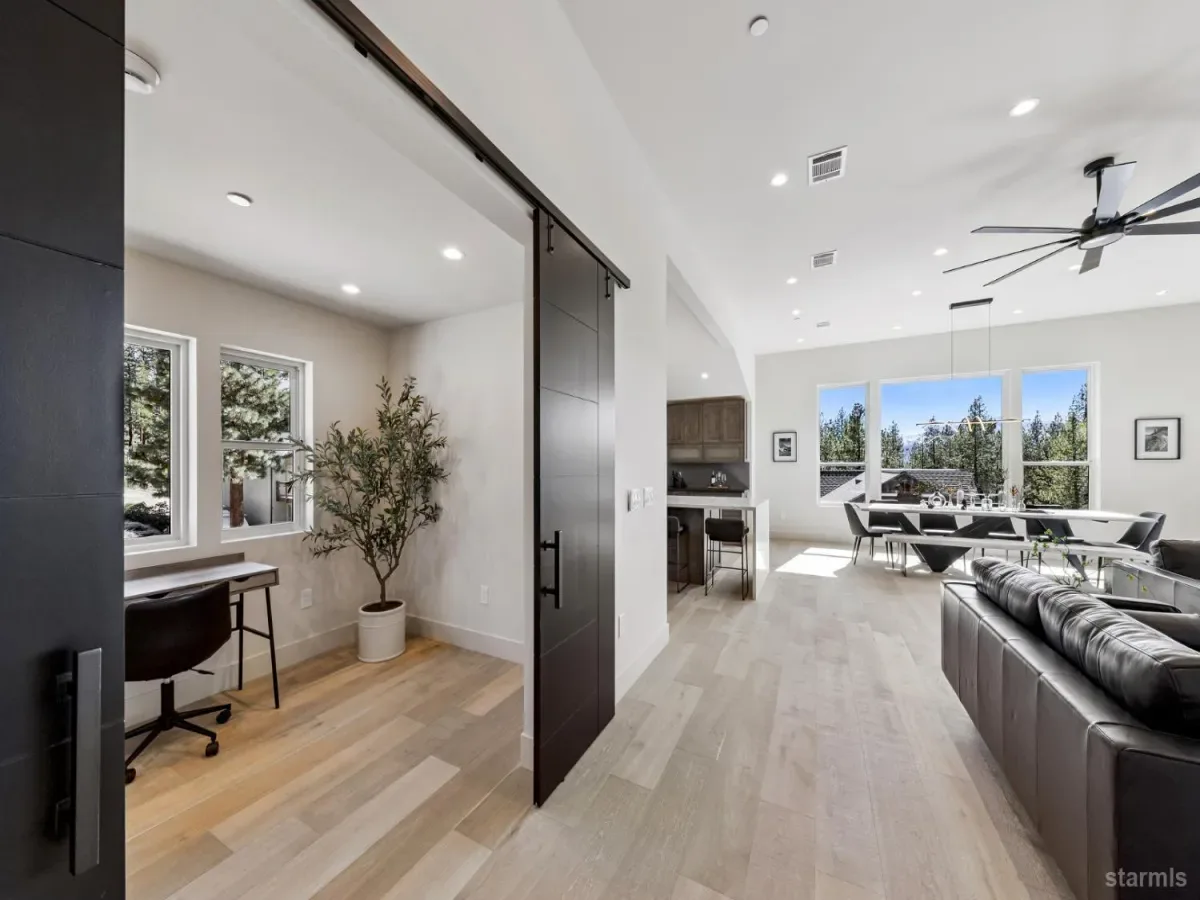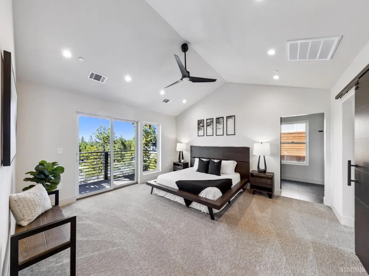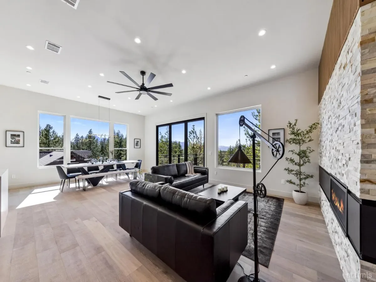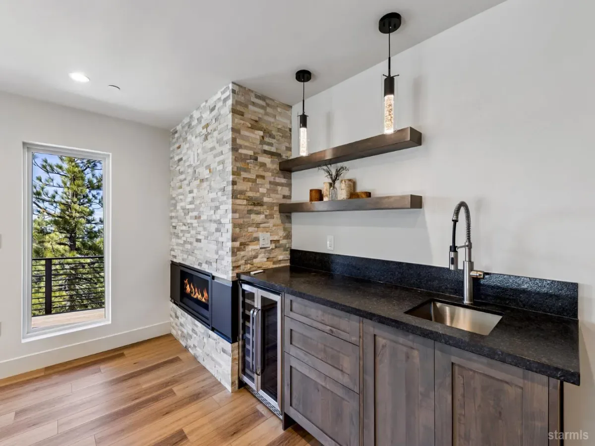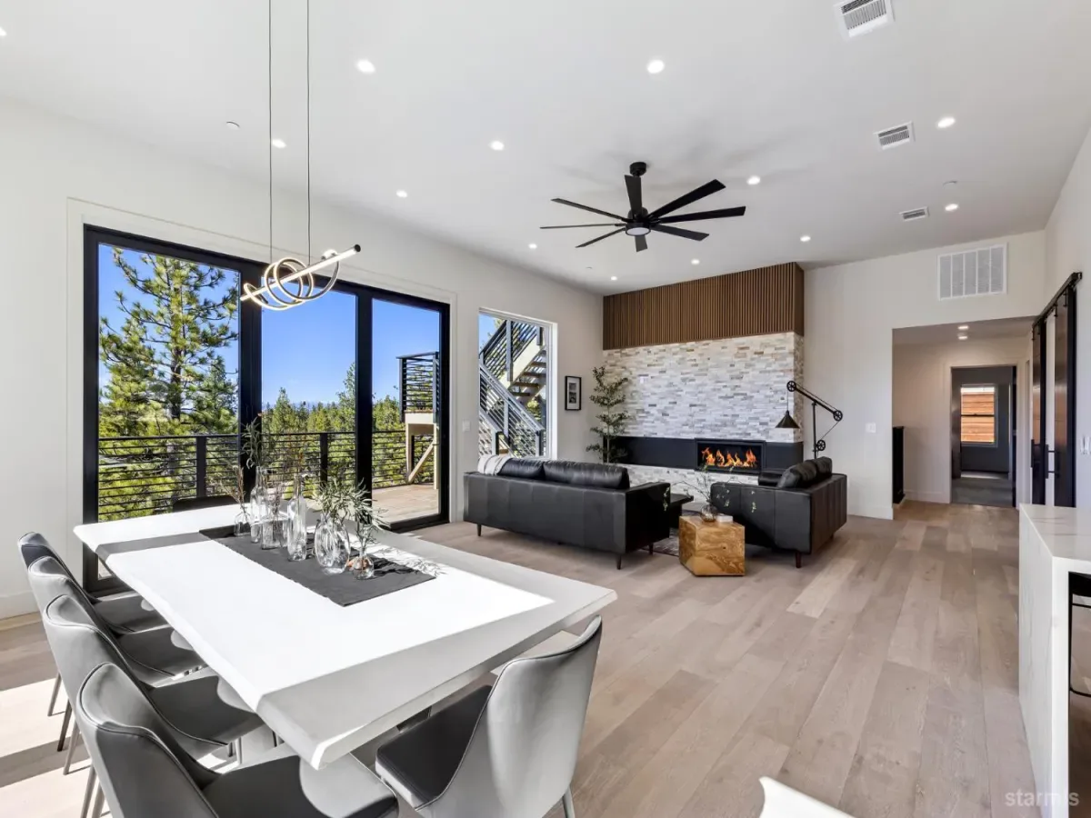 Brand new luxurious home located in the desirable Heavenly Valley area of South Lake Tahoe overlooking multiple Forest Service owned lots. This 3,421 square foot custom home features 4 bedrooms, 4.5 bathrooms, and a 2-car garage and sits on a sunny 11,617 square foot lot with panoramic mountain views and filtered views of Lake Tahoe. The location offers easy access to Heavenly Ski Resort, Stateline, and the lake, making it ideal for both year-round living and vacation use.The spacious upstairs living area is designed to take full advantage of the views and includes tall ceilings, brushed white oak hardwood flooring, and a beautiful contemporary gas fireplace. An Andersen folding door fully opens the living room to the back deck, creating seamless indoor-outdoor living and framing the surrounding mountain scenery and filtered lake views. From the back deck, stairs lead to an expansive rooftop deck offering 360-degree mountain views and stunning views of Lake Tahoe.The kitchen is finished with custom knotty alder cabinetry, granite and quartz countertops, and high-end Thermador appliances, including a built-in 48-inch refrigerator and a 48-inch dual-oven gas range. Additional features include two dishwashers, a built-in microwave, and generous counter space, making it well suited for entertaining and larger gatherings.The primary suite is located on the main living level and includes a private balcony with filtered lake views, a spacious walk-in closet, and a spa like bathroom with a freestanding soaking tub overlooking the mountains, dual-sink vanity, and a stunning custom tile shower.Additionally, there is an office/flex space on the main level that offers a light and bright space to set up a home office.Downstairs are three additional guest bedrooms, including a junior primary suite with its own en-suite bathroom. The other two bedrooms share a Jack and Jill bathroom finished with custom tile and modern fixtures. The laundry room features built-in cabinetry and a utility sink for added convenience.The first floor boasts a large game room with a gas fireplace, wet bar, and a full bathroom. This flexible space could easily function as a theater room, second family room, or even be converted into a fifth bedroom.This exceptional new home offers a rare combination of quality construction, expansive living space, and panoramic mountain and lake views in one of South Lake Tahoe’s most desirable locations.