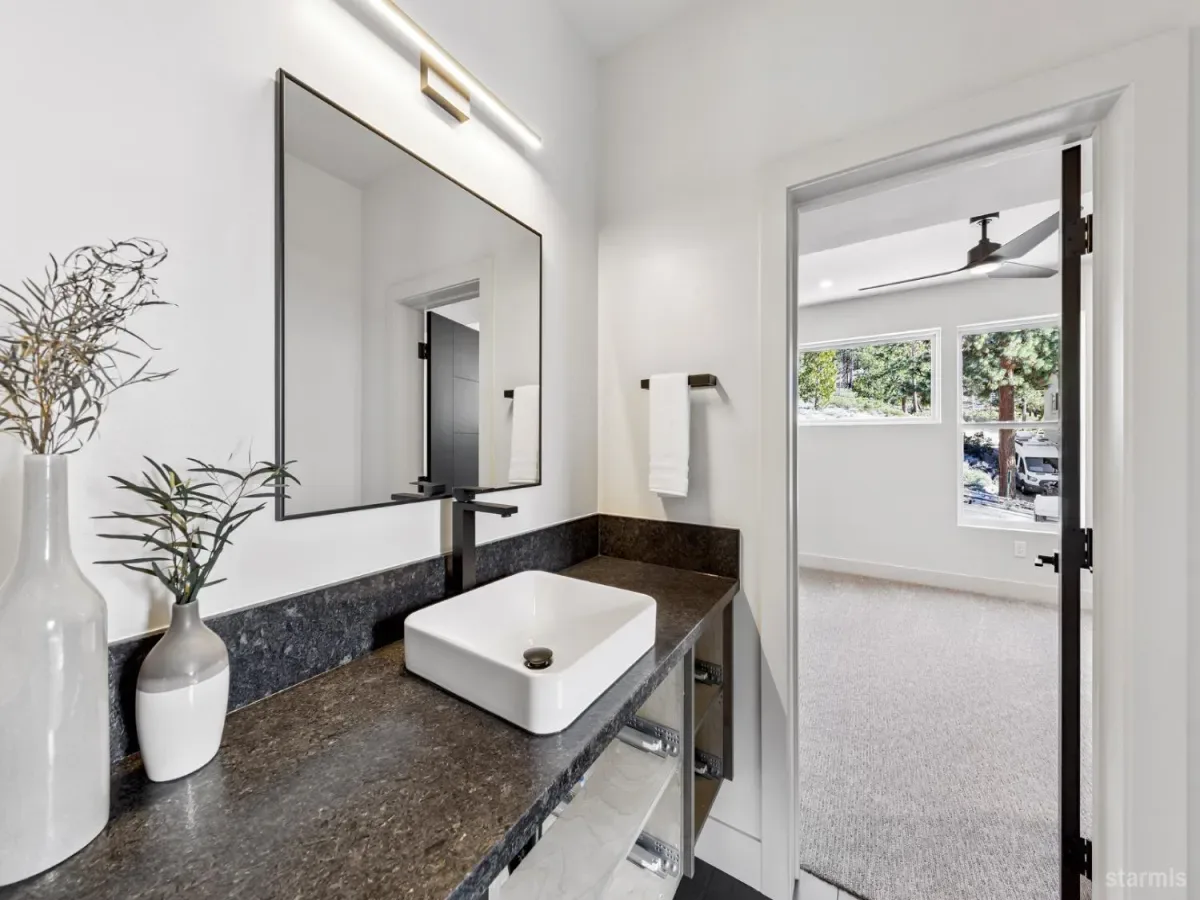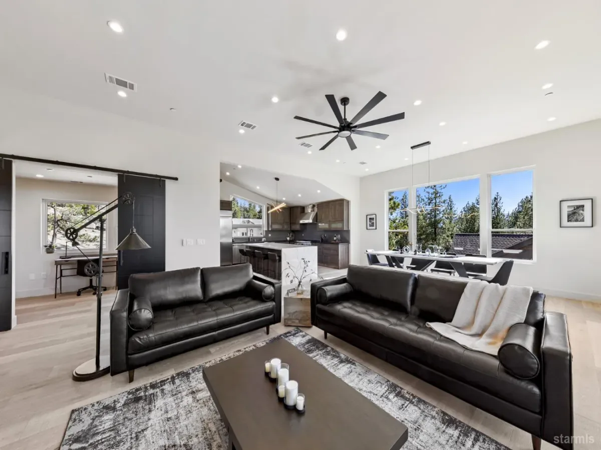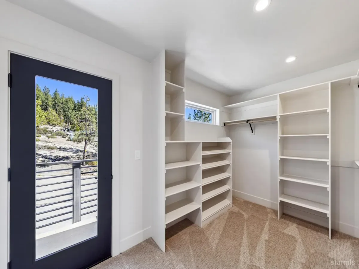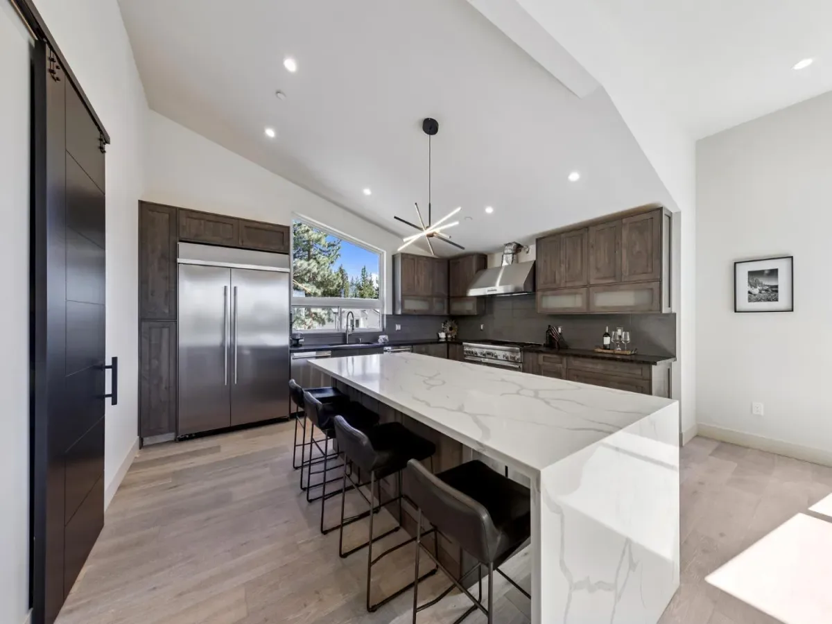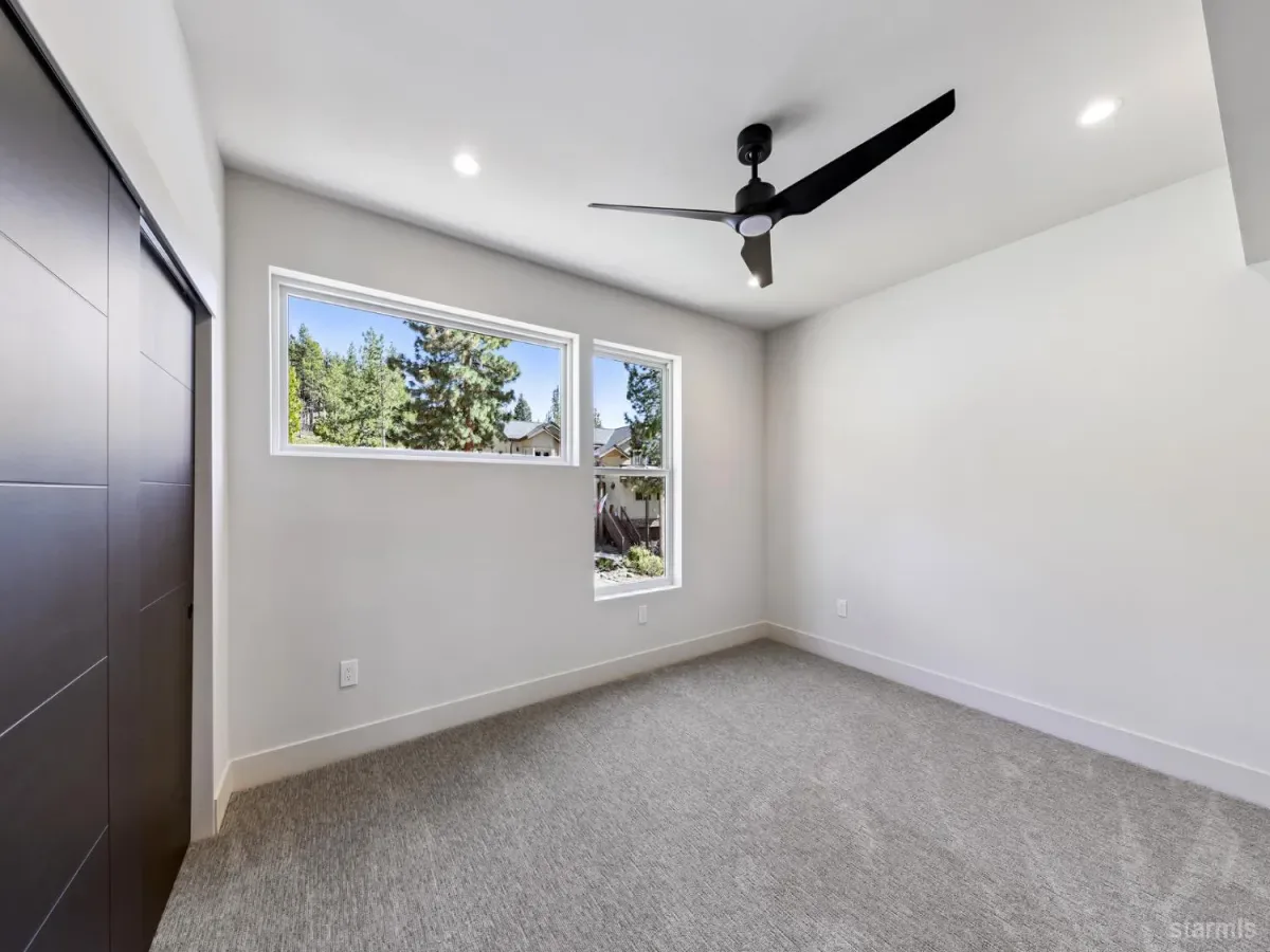 Brand new luxurious home located in the desirable Heavenly Valley area of South Lake Tahoe overlooking multiple Forest Service owned lots. This 3,421 square foot custom home features 4 bedrooms, 4.5 bathrooms, and a 2-car garage and sits on a sunny 11,617 square foot lot with panoramic mountain views and filtered views of Lake Tahoe. The location offers easy access to Heavenly Ski Resort, Stateline, and the lake, making it ideal for both year-round living and vacation use.The spacious upstairs living area is designed to take full advantage of the views and includes tall ceilings, brushed white oak hardwood flooring, and a beautiful contemporary gas fireplace. An Andersen folding door fully opens the living room to the back deck, creating seamless indoor-outdoor living and framing the surrounding mountain scenery and filtered lake views. From the back deck, stairs lead to an expansive rooftop deck offering 360-degree mountain views and stunning views of Lake Tahoe.The kitchen is finished with custom knotty alder cabinetry, granite and quartz countertops, and high-end Thermador appliances, including a built-in 48-inch refrigerator and a 48-inch dual-oven gas range. Additional features include two dishwashers, a built-in microwave, and generous counter space, making it well suited for entertaining and larger gatherings.The primary suite is located on the main living level and includes a private balcony with filtered lake views, a spacious walk-in closet, and a spa like bathroom with a freestanding soaking tub overlooking the mountains, dual-sink vanity, and a stunning custom tile shower.Additionally, there is an office/flex space on the main level that offers a light and bright space to set up a home office.Downstairs are three additional guest bedrooms, including a junior primary suite with its own en-suite bathroom. The other two bedrooms share a Jack and Jill bathroom finished with custom tile and modern fixtures. The laundry room features built-in cabinetry and a utility sink for added convenience.The first floor boasts a large game room with a gas fireplace, wet bar, and a full bathroom. This flexible space could easily function as a theater room, second family room, or even be converted into a fifth bedroom.This exceptional new home offers a rare combination of quality construction, expansive living space, and panoramic mountain and lake views in one of South Lake Tahoe’s most desirable locations.