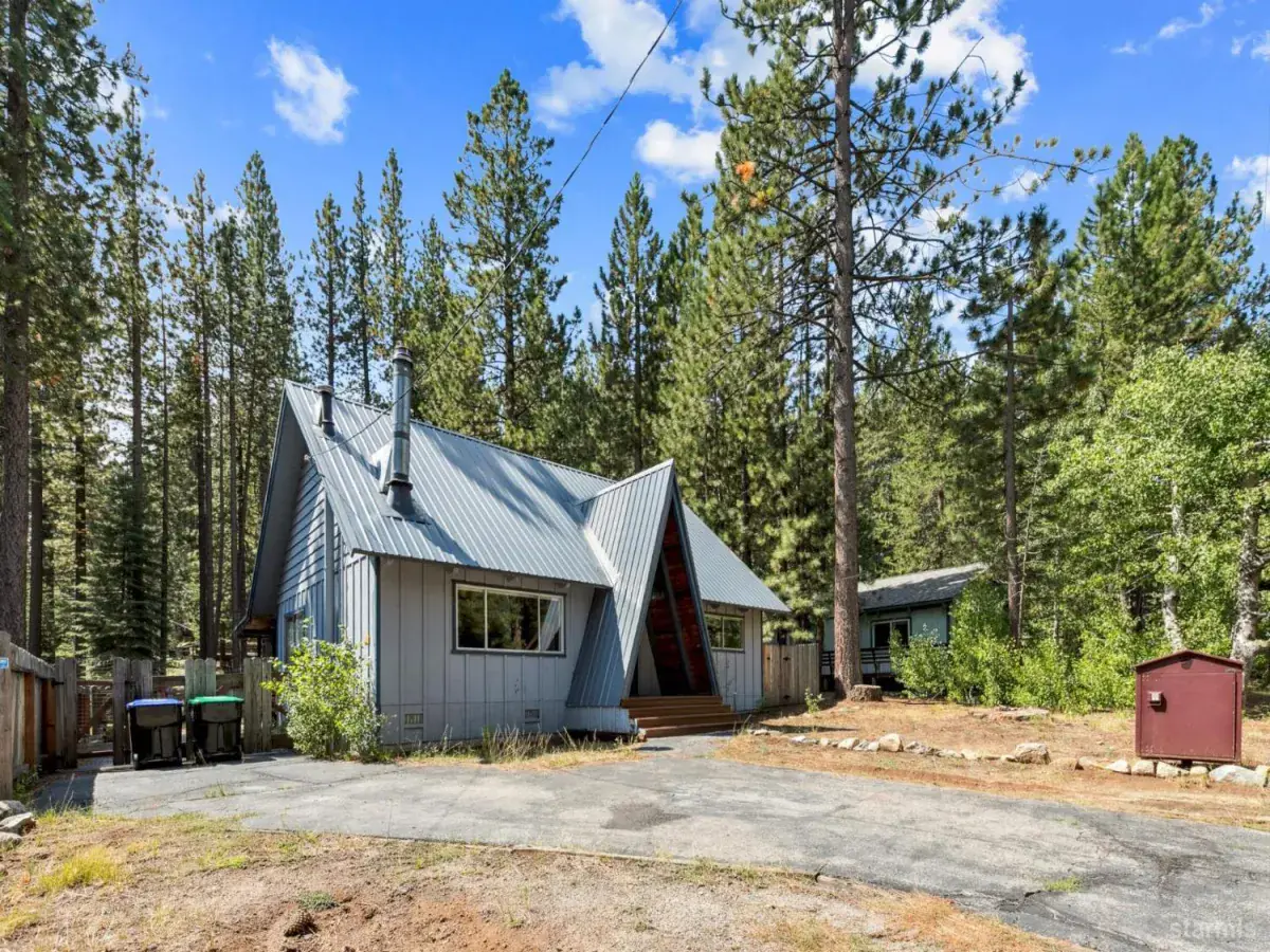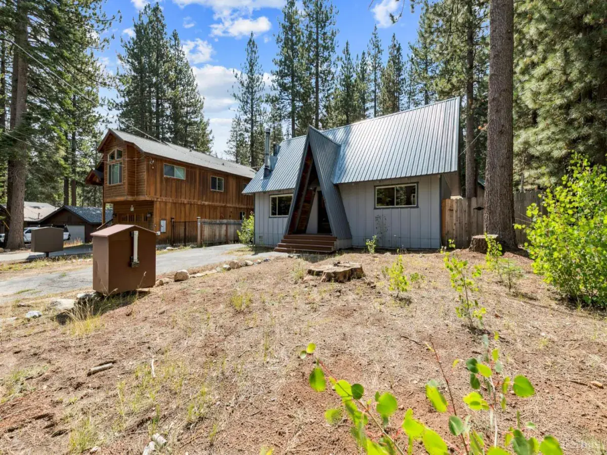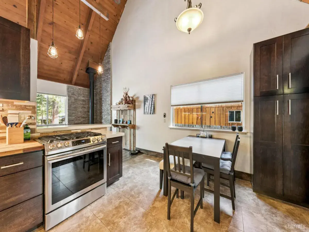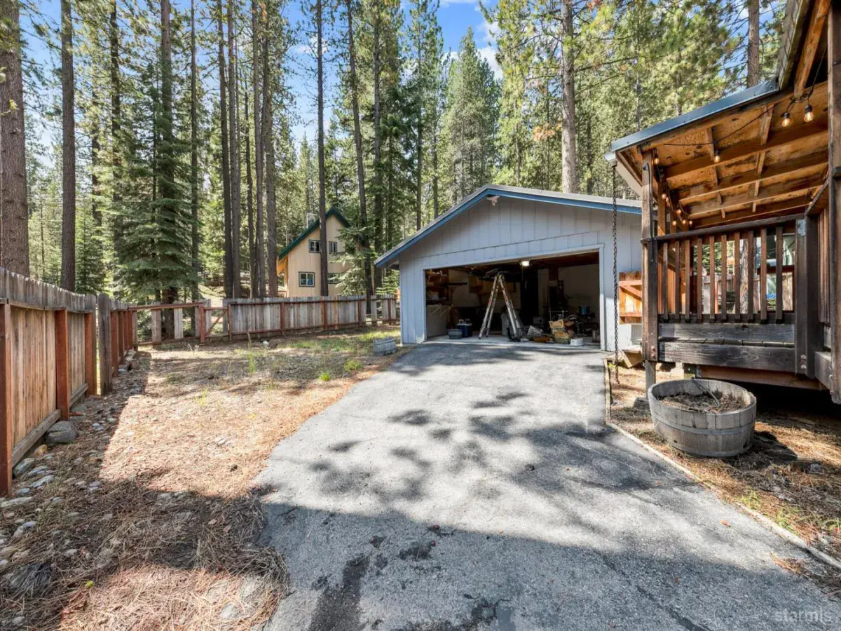 This Tahoe cabin with a two car garage offers everything on your A list for true mountain living. This 3-bedroom, 2 bath property has both a modern and rustic style feel and offers plenty of space for all your Tahoe gear. The open living room is cozy and offers reclaimed wood accents, ambiance and warmth courtesy of the wood burning stove. The beautifully remodeled kitchen has shaker cabinetry, soft close doors and drawers, concrete and butcher block counters and a gas range. The kitchen flows naturally outdoors to a large deck with covered hot tub leading to the 2 car garage. There are 2 bedrooms and a full bathroom downstairs and another bedroom and full bath upstairs. The upstairs bedroom has stunning custom-built barn door closets and an additional walk-in closet outside the room. The large lot affords plenty of parking, a large backyard, two-car garage with an additional storage room. The furry friends will enjoy the large fenced backyard and the property is located in the Tahoe Paradise neighborhood. Tons of trails accessible right from the door and easy access to Sierra-at-Tahoe, Kirkwood, Heavenly and Lake Tahoe beaches.