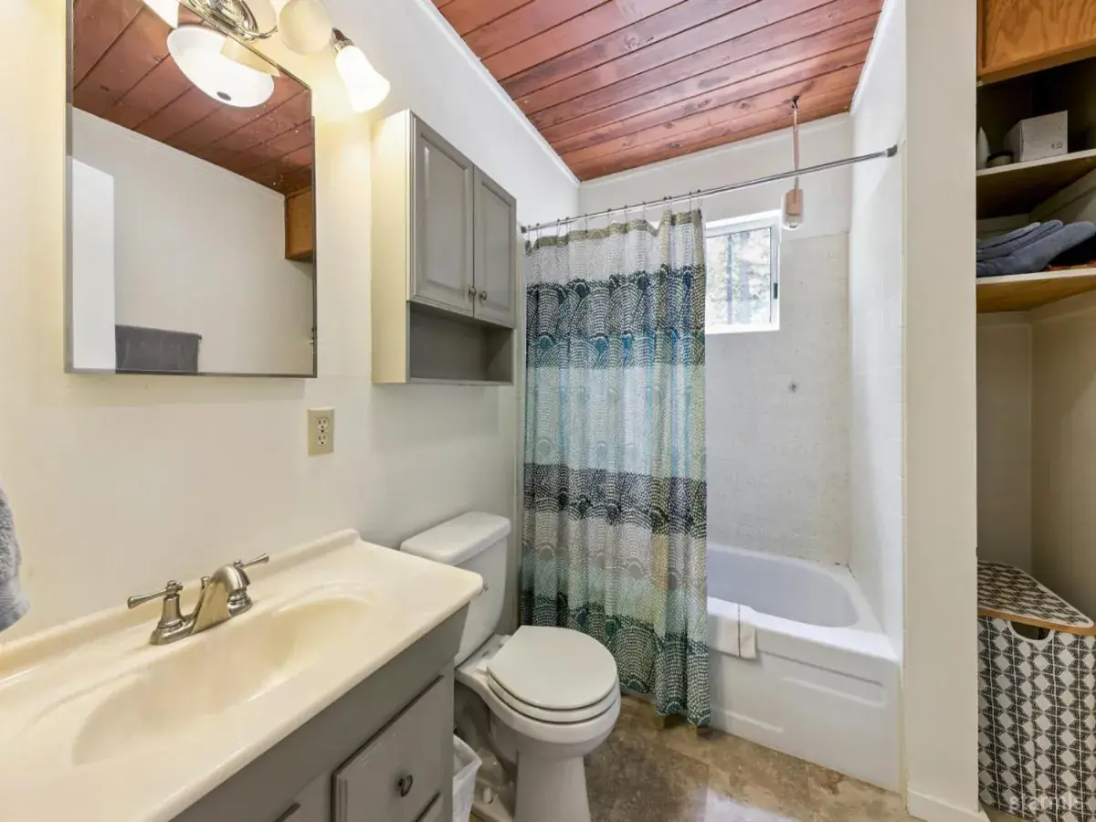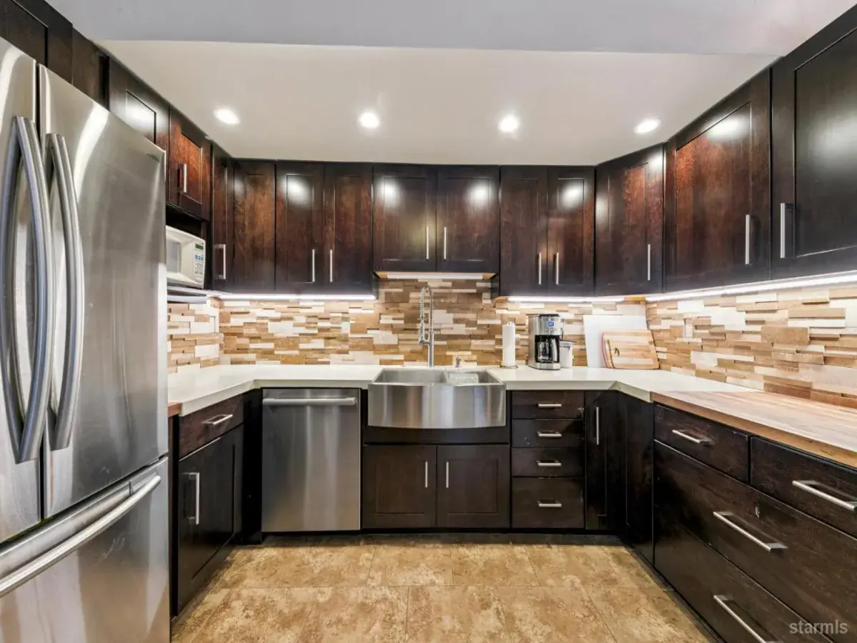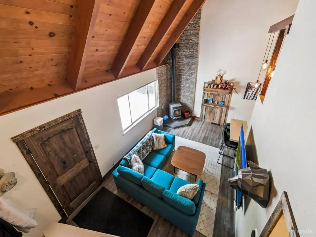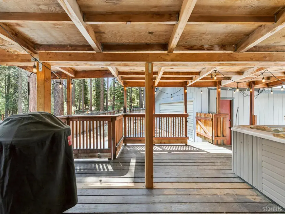 This Tahoe cabin with a two car garage offers everything on your A list for true mountain living. This 3-bedroom, 2 bath property has both a modern and rustic style feel and offers plenty of space for all your Tahoe gear. The open living room is cozy and offers reclaimed wood accents, ambiance and warmth courtesy of the wood burning stove. The beautifully remodeled kitchen has shaker cabinetry, soft close doors and drawers, concrete and butcher block counters and a gas range. The kitchen flows naturally outdoors to a large deck with covered hot tub leading to the 2 car garage. There are 2 bedrooms and a full bathroom downstairs and another bedroom and full bath upstairs. The upstairs bedroom has stunning custom-built barn door closets and an additional walk-in closet outside the room. The large lot affords plenty of parking, a large backyard, two-car garage with an additional storage room. The furry friends will enjoy the large fenced backyard and the property is located in the Tahoe Paradise neighborhood. Tons of trails accessible right from the door and easy access to Sierra-at-Tahoe, Kirkwood, Heavenly and Lake Tahoe beaches.