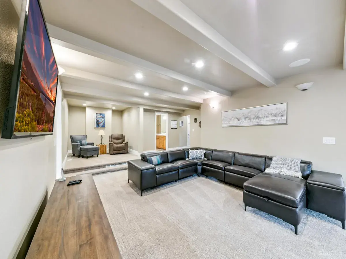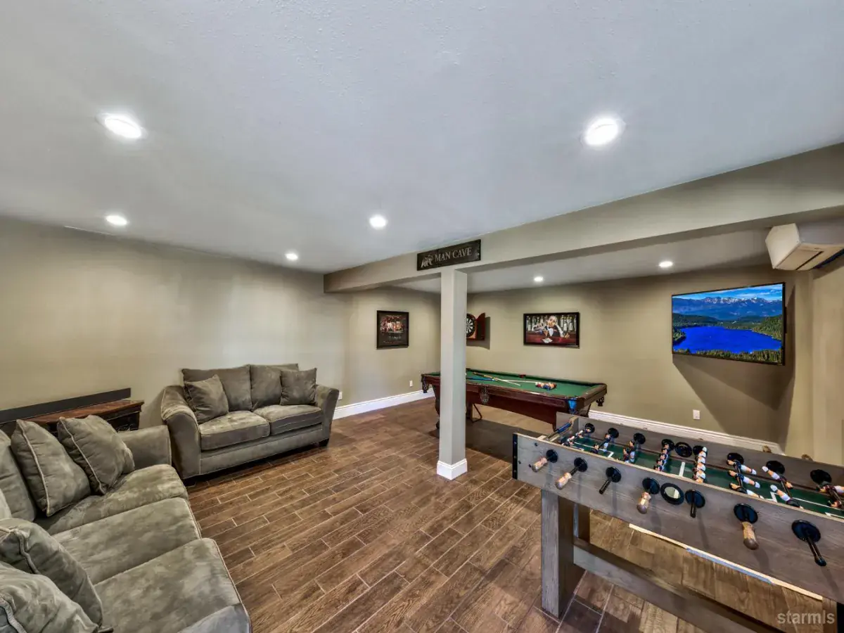Discover this exceptional custom mountain modern home situated on nearly an acre of land that backs directly to the National Forest. This luxurious property offers unparalleled privacy and endless outdoor recreation opportunities right from your doorstep, while remaining conveniently located just minutes from Heavenly Ski Resort and the lake.The welcoming entry leads into an impressive great room featuring soaring open beam ceilings, rich hardwood flooring, and an expansive wall of windows that frame breathtaking forest views. The thoughtfully designed kitchen showcases custom cabinetry, elegant quartz slab countertops, and premium Viking stainless steel appliances, including a built-in refrigerator and commercial gas range. Adjacent to the kitchen, a formal dining room provides an ideal space for entertaining while overlooking the serene forest setting.The main level primary bedroom offers comfort and luxury with beautiful hardwood flooring and an en-suite bathroom complete with a jetted tub and separate stall shower. A second guest room with its own en-suite bathroom provides additional convenience on the main floor.The lower level expands the living space with a generous family room and three additional guest bedrooms including a second primary suite, accommodating large families or guests with ease. This impressive home totals 3,732 square feet with six bedrooms and four and a half bathrooms.The detached garage provides practical storage solutions and features a finished game room, perfect for entertainment and recreation. This extraordinary property combines modern mountain living with the tranquility of forest surroundings, creating an ideal retreat for year-round enjoyment.