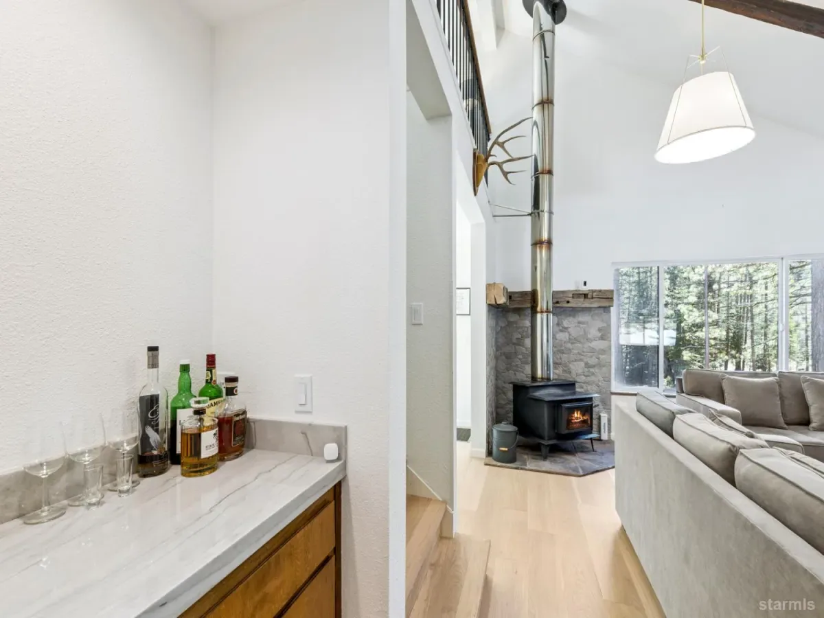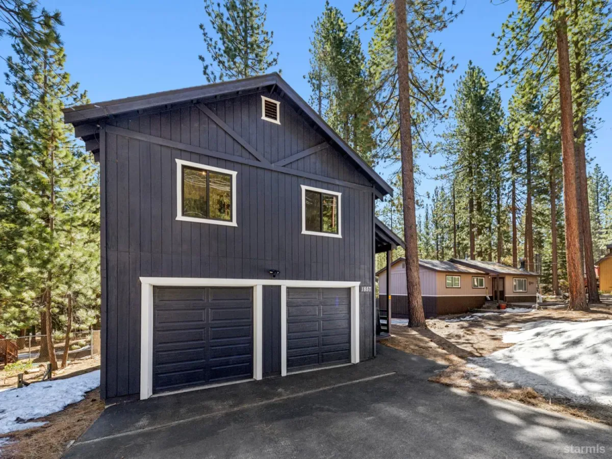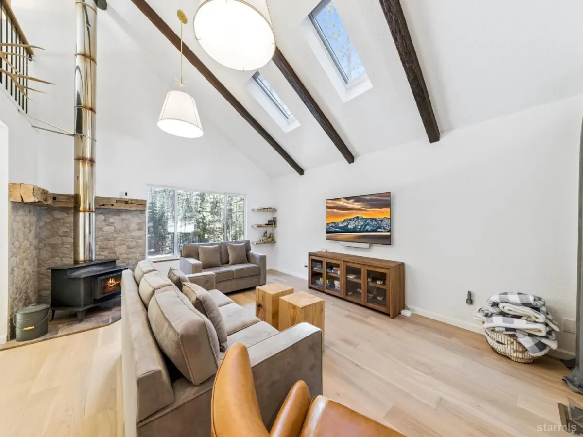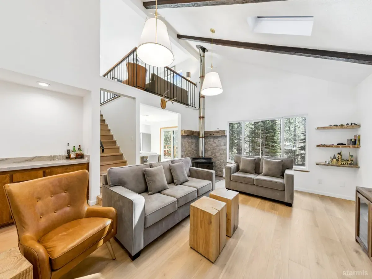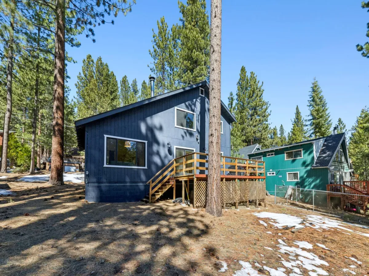 Completely renovated Tahoe home on a large 17,424 square foot lot with an exceptional backyard setting overlooking the trees. Located on a quiet dead-end street with access to miles of hiking and biking trails, this 3-bedroom, 2-bath home offers 1,888 square feet of thoughtfully updated living space along with plenty of parking, including a second asphalt parking pad for a boat or RV.The home has undergone a full renovation including a new roof with a full ice and water shield system, new windows, and high-quality interior finishes throughout. A functional mudroom welcomes you with a tile entry, built-in bench, coat rack, and closet before leading into the main living area. The living room features vaulted open-beam ceilings, skylights, a wood-burning fireplace with a reclaimed timber mantle, and beautiful white oak flooring.The kitchen is finished with custom alder cabinets with soft-close hardware, quartz countertops, stainless steel appliances, a live-edge shelf, and an induction cooktop with a custom hood.Both bathrooms have been fully remodeled with porcelain tile, quartzite slab counters, custom vanities, and updated fixtures. Upstairs, a spacious loft serves as a second living area and includes a wet bar with quartz counters while overlooking the main living space below.Additional upgrades include a new split-zone forced air heating system with a smart thermostat, EV charger, solar-powered blackout shades on the skylights, and Sonos speakers and more.The home is being offered fully furnished with high-end furnishings from Restoration Hardware and custom-made couches, making it a true turnkey Tahoe retreat