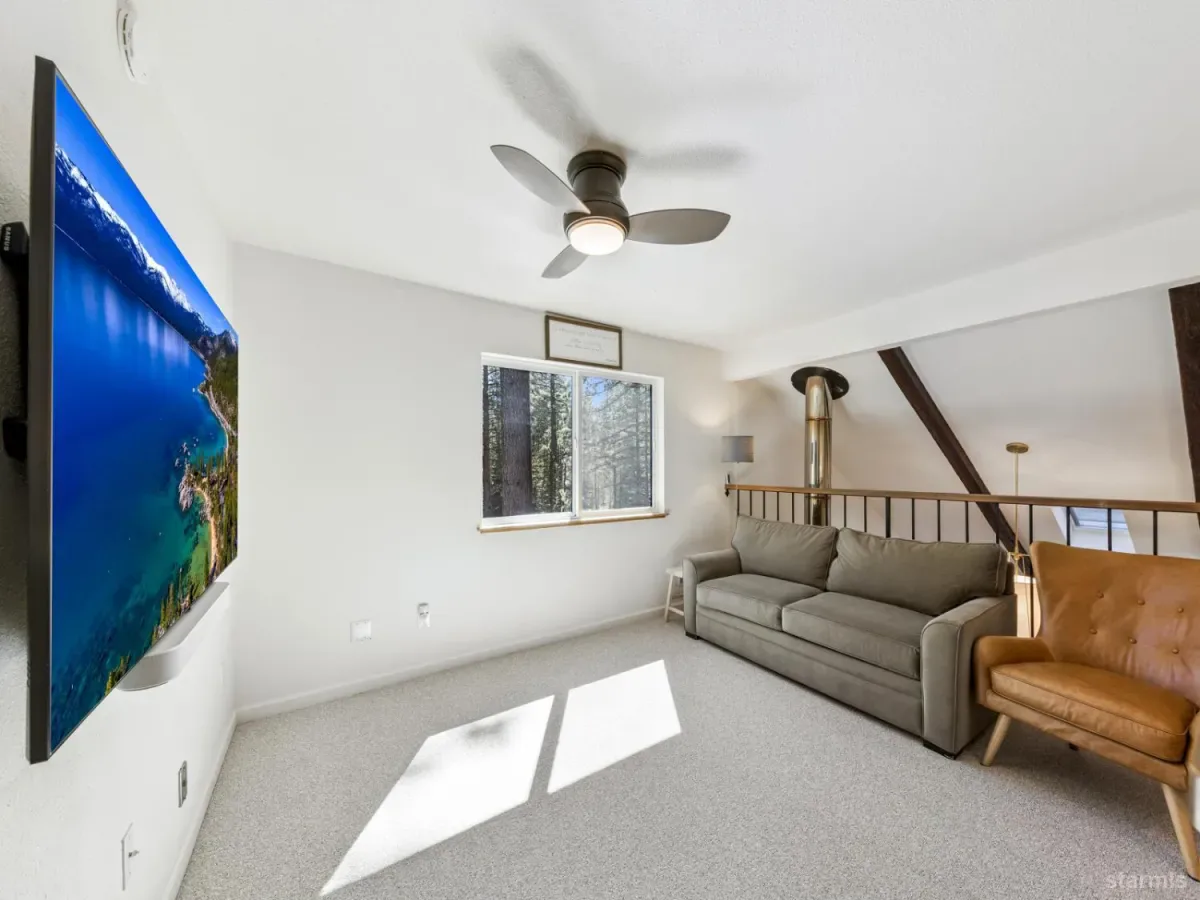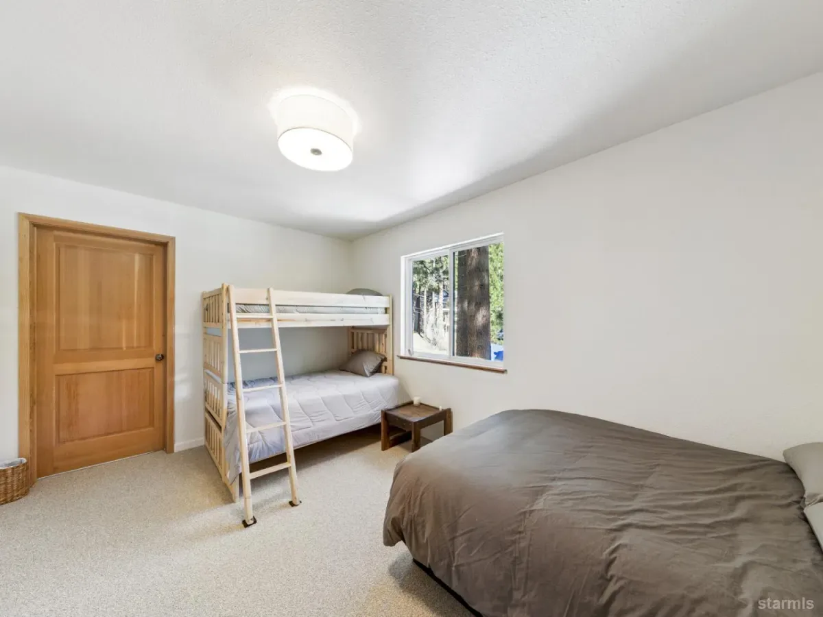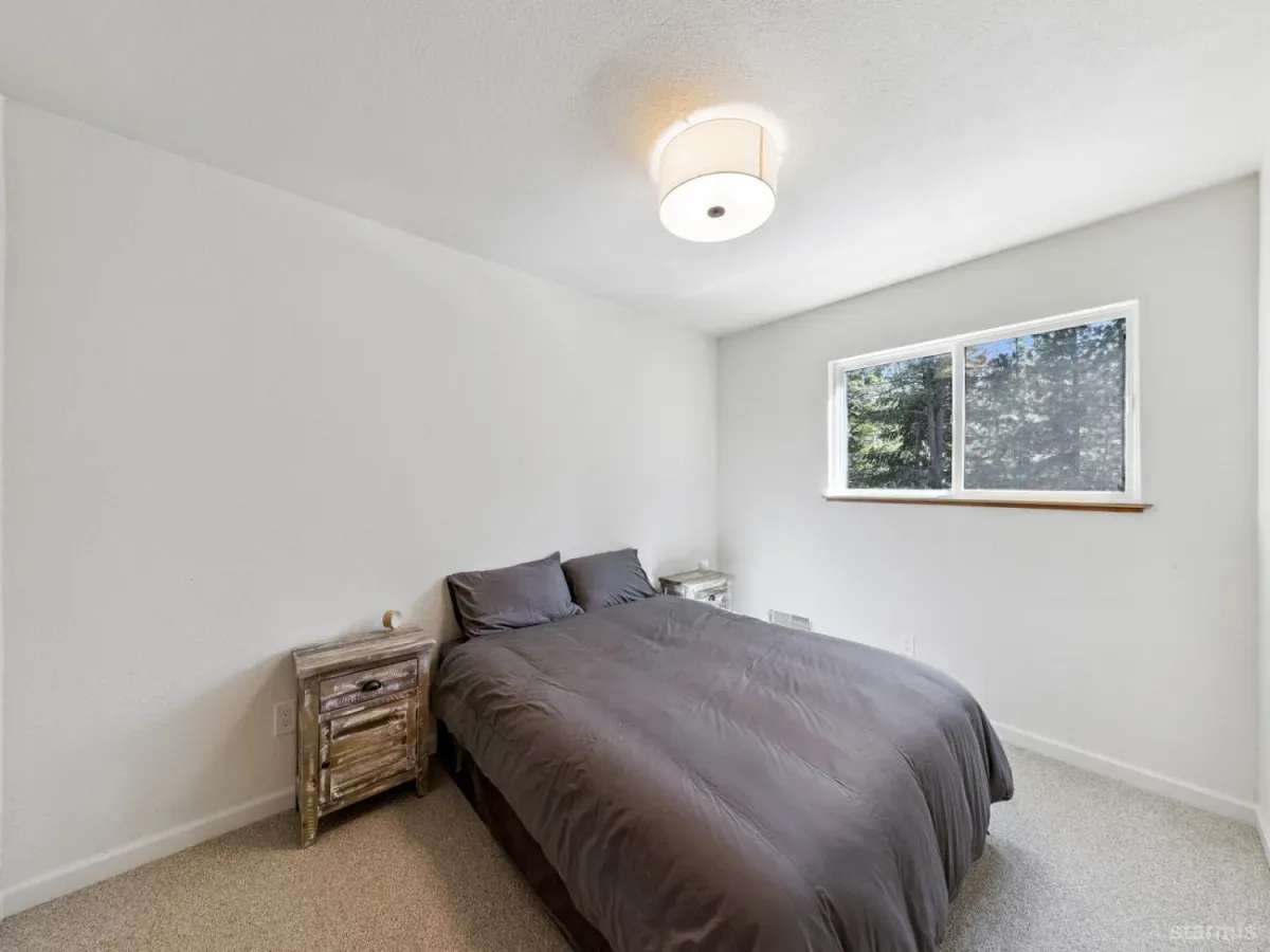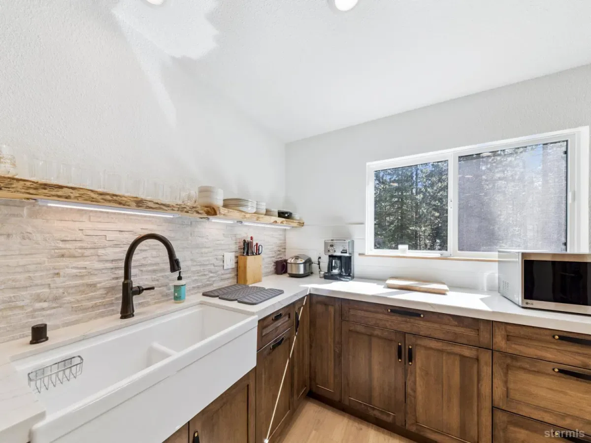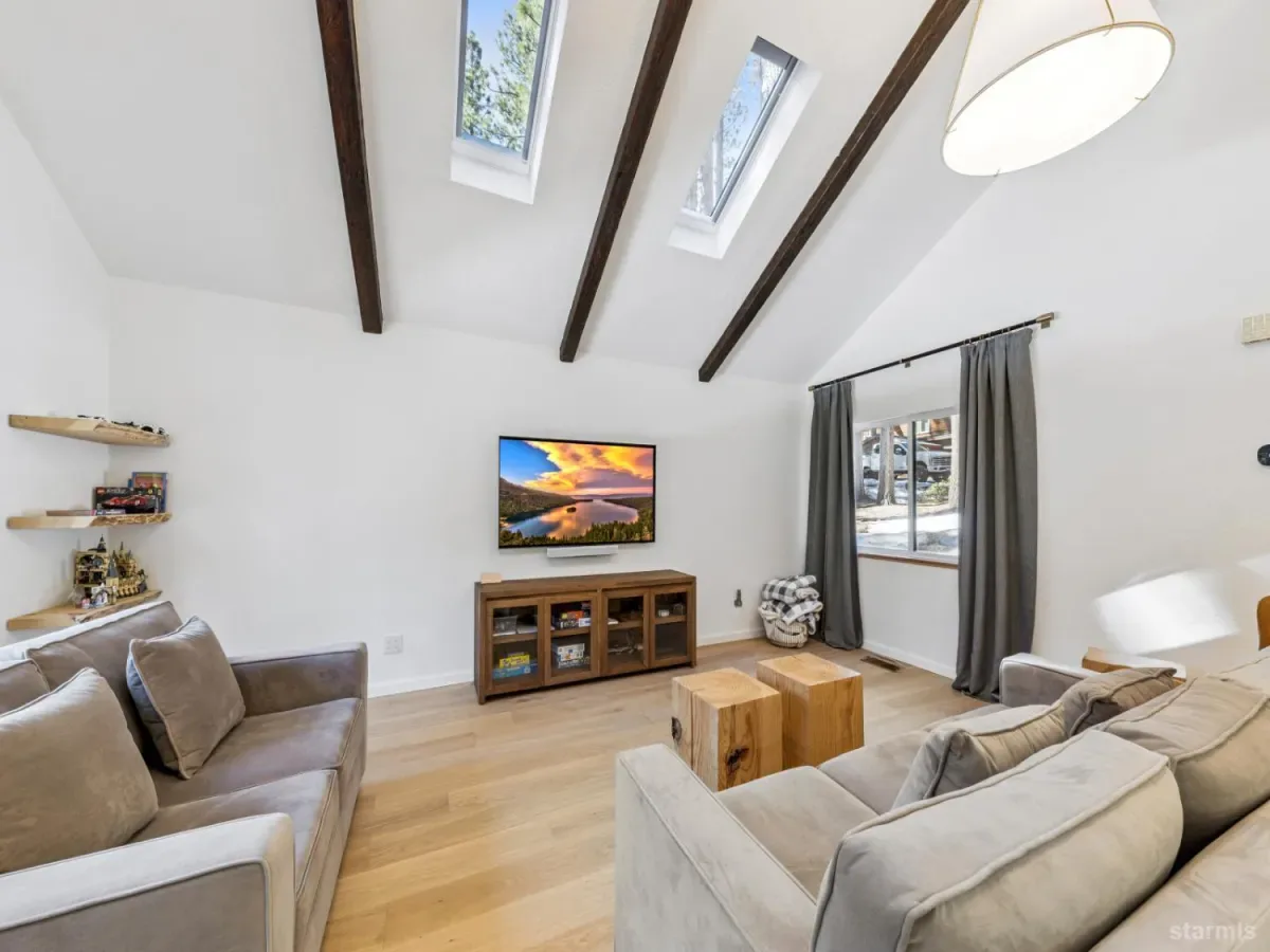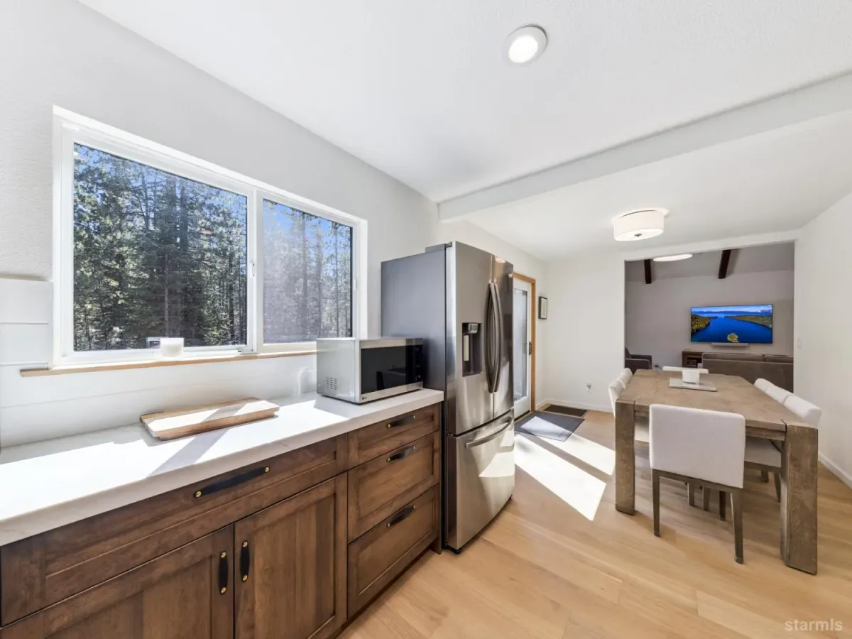 Completely renovated Tahoe home on a large 17,424 square foot lot with an exceptional backyard setting overlooking the trees. Located on a quiet dead-end street with access to miles of hiking and biking trails, this 3-bedroom, 2-bath home offers 1,888 square feet of thoughtfully updated living space along with plenty of parking, including a second asphalt parking pad for a boat or RV.The home has undergone a full renovation including a new roof with a full ice and water shield system, new windows, and high-quality interior finishes throughout. A functional mudroom welcomes you with a tile entry, built-in bench, coat rack, and closet before leading into the main living area. The living room features vaulted open-beam ceilings, skylights, a wood-burning fireplace with a reclaimed timber mantle, and beautiful white oak flooring.The kitchen is finished with custom alder cabinets with soft-close hardware, quartz countertops, stainless steel appliances, a live-edge shelf, and an induction cooktop with a custom hood.Both bathrooms have been fully remodeled with porcelain tile, quartzite slab counters, custom vanities, and updated fixtures. Upstairs, a spacious loft serves as a second living area and includes a wet bar with quartz counters while overlooking the main living space below.Additional upgrades include a new split-zone forced air heating system with a smart thermostat, EV charger, solar-powered blackout shades on the skylights, and Sonos speakers and more.The home is being offered fully furnished with high-end furnishings from Restoration Hardware and custom-made couches, making it a true turnkey Tahoe retreat