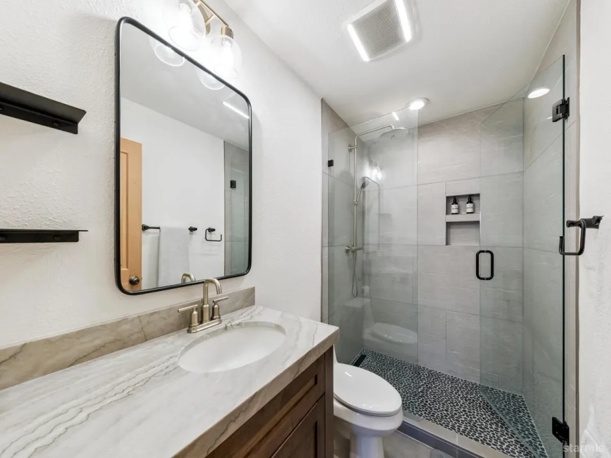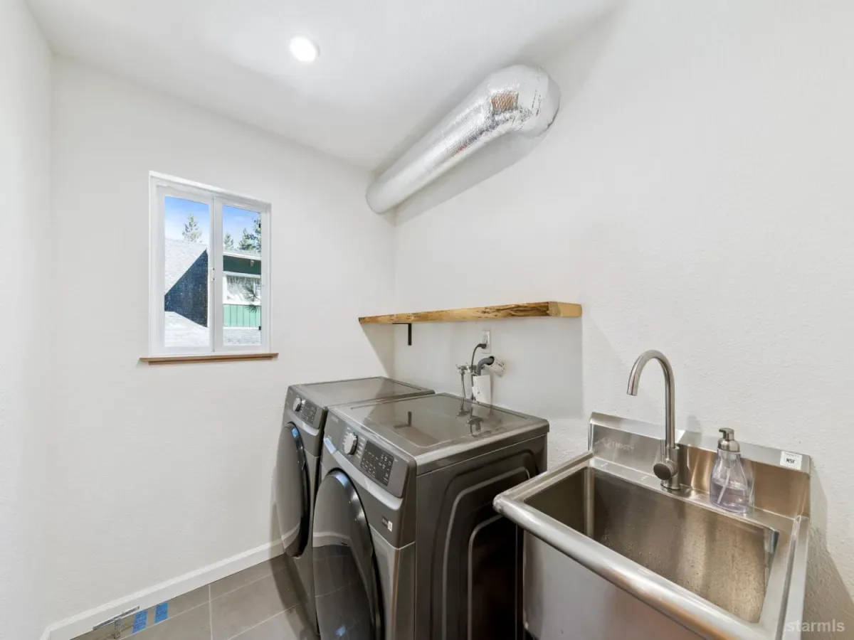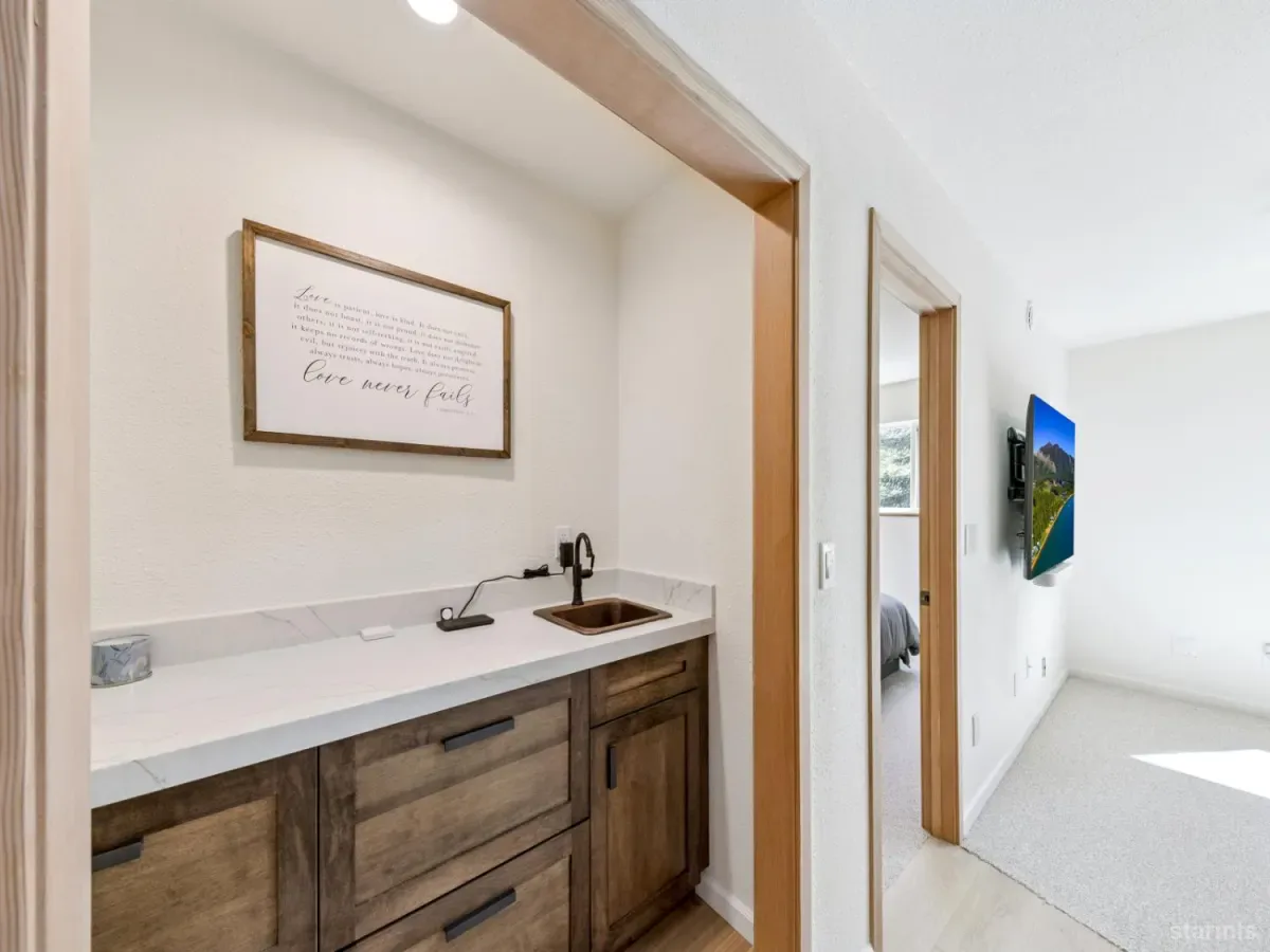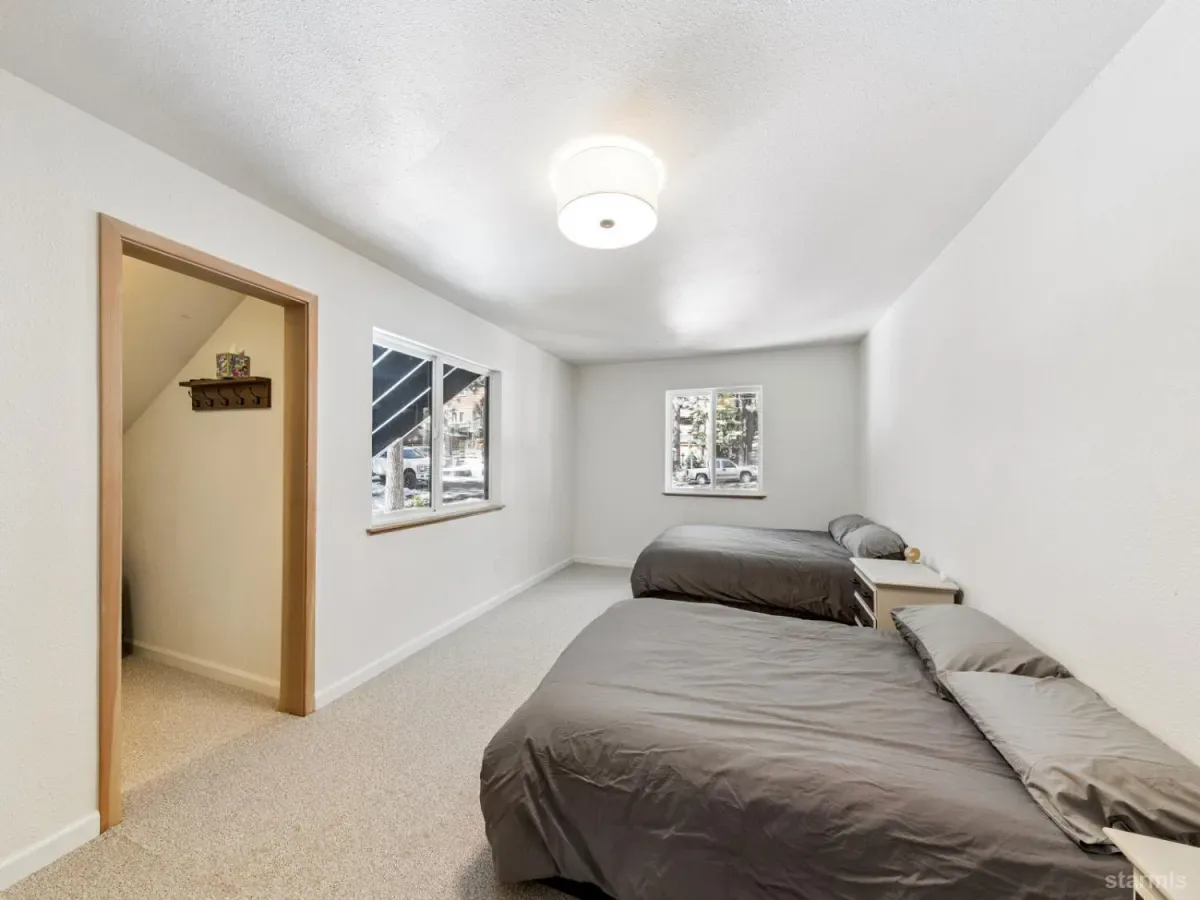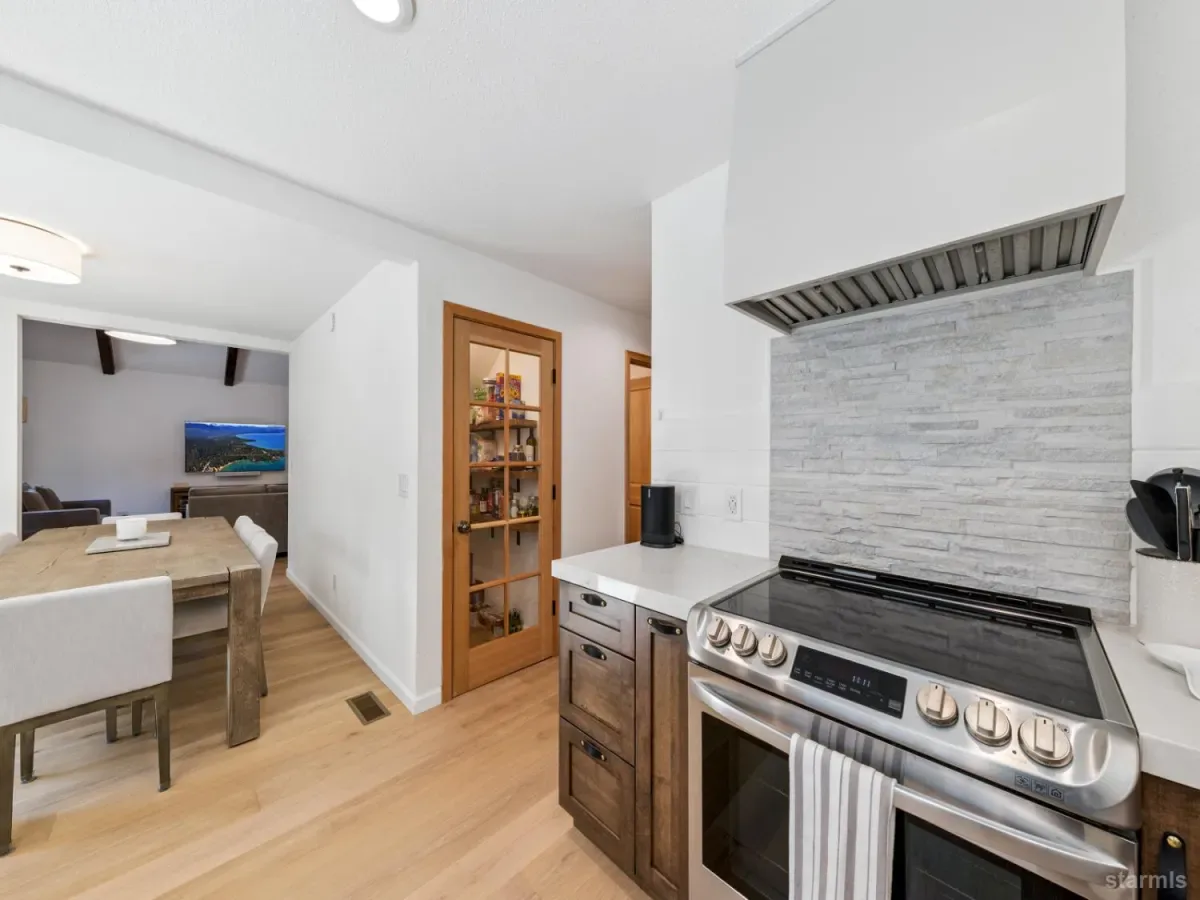 Completely renovated Tahoe home on a large 17,424 square foot lot with an exceptional backyard setting overlooking the trees. Located on a quiet dead-end street with access to miles of hiking and biking trails, this 3-bedroom, 2-bath home offers 1,888 square feet of thoughtfully updated living space along with plenty of parking, including a second asphalt parking pad for a boat or RV.The home has undergone a full renovation including a new roof with a full ice and water shield system, new windows, and high-quality interior finishes throughout. A functional mudroom welcomes you with a tile entry, built-in bench, coat rack, and closet before leading into the main living area. The living room features vaulted open-beam ceilings, skylights, a wood-burning fireplace with a reclaimed timber mantle, and beautiful white oak flooring.The kitchen is finished with custom alder cabinets with soft-close hardware, quartz countertops, stainless steel appliances, a live-edge shelf, and an induction cooktop with a custom hood.Both bathrooms have been fully remodeled with porcelain tile, quartzite slab counters, custom vanities, and updated fixtures. Upstairs, a spacious loft serves as a second living area and includes a wet bar with quartz counters while overlooking the main living space below.Additional upgrades include a new split-zone forced air heating system with a smart thermostat, EV charger, solar-powered blackout shades on the skylights, and Sonos speakers and more.The home is being offered fully furnished with high-end furnishings from Restoration Hardware and custom-made couches, making it a true turnkey Tahoe retreat