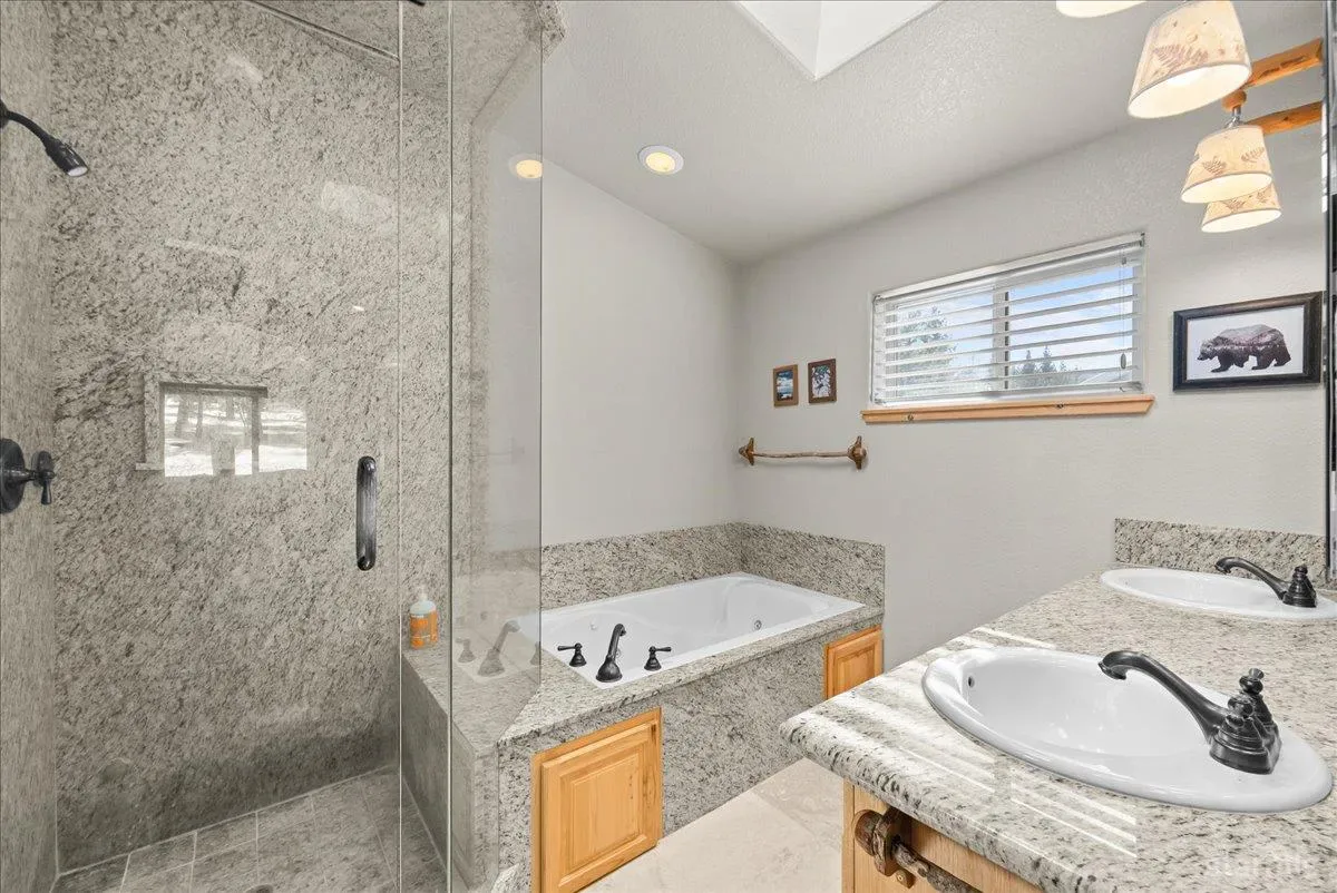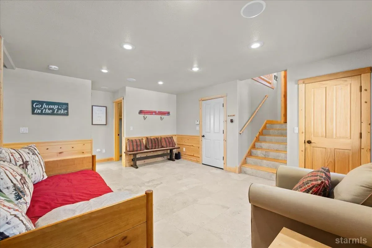 Experience refined mountain living in this Country Club Estates home that has been meticulously maintained and features timeless craftmanship throughout. Opening the double door entry reveals the quintessential Tahoe great room defined by soaring pine ceilings, warm hardwood, natural travertine floors and a signature peeled log staircase. The great room serves as the heart of the home centered around a beautiful granite boulder fireplace, breakfast bar, and a kitchen featuring warm alder cabinetry, granite slab counters and travertine floors. The expansive deck has picturesque views of the forest and mountains. Unwind in the primary suite. your personal hideaway complete with a cozy freestanding stove, a natural river rock hearth and custom built closet. The primary bath features a steam shower, a jetted soaking tub, radiant heated floors, and a natural light skylight. The lower level is a versatile guest retreat, featuring a cozy den, full bath, and two bedrooms. This space is grounded by heated travertine floors, and warm wainscoting. The third level Game Room is ready for action with a full size pool table, foosball, and a dart game setup for endless fun and competition. Heated floors in two baths, den and game room. Custom built in closet inserts in all three bedrooms. The entire inside is newly painted. Sold Furnished. The exterior is wrapped on all sides with beautiful well maintained cedar siding. Beyond parking the three car garage has an abundance of built in storage cabinet and workbench. Located on a third of an acre with two sides of the property are owned by Tahoe conservancy and BLM. Large Drive way accommodates multiple cars along with a three car garage. Close proximity to and minutes from ski resorts, shopping, restaurants, and casinos. This was a successful vacation rental prior to listing the property for sale. Luxury mountain retreat, turnkey rental, or forever home, this property defines the unrivaled Tahoe lifestyle!