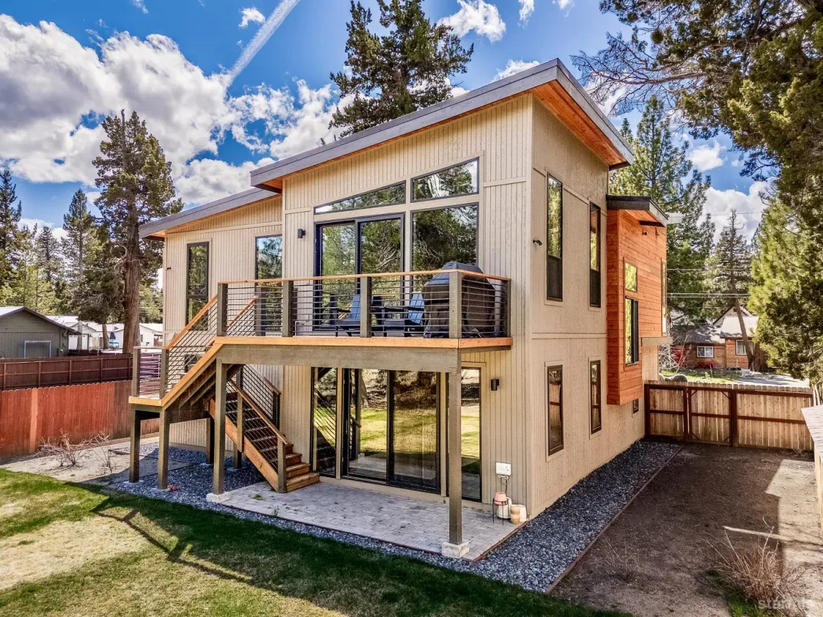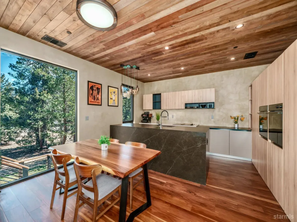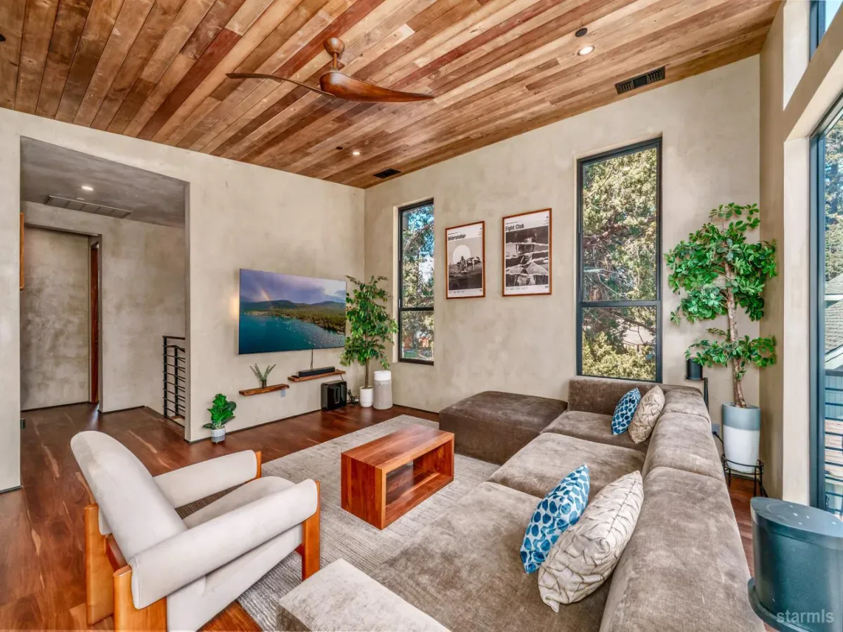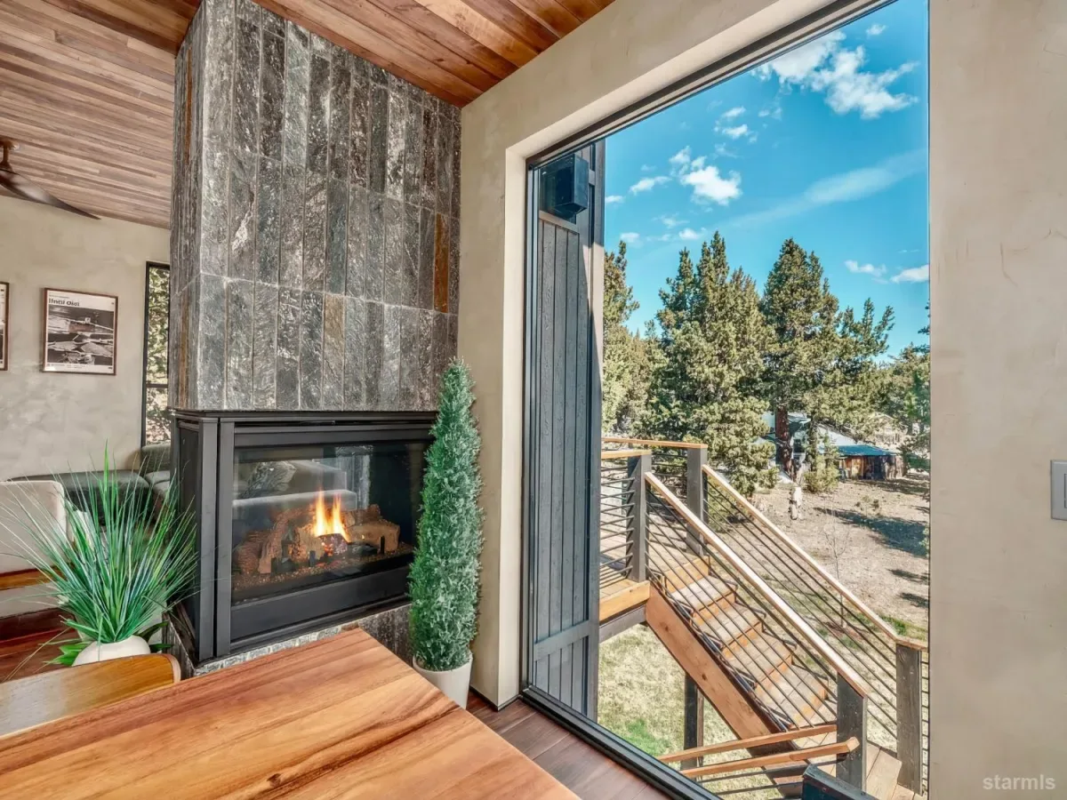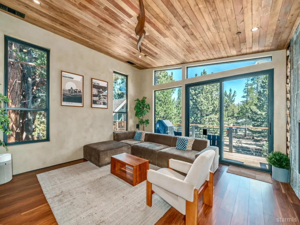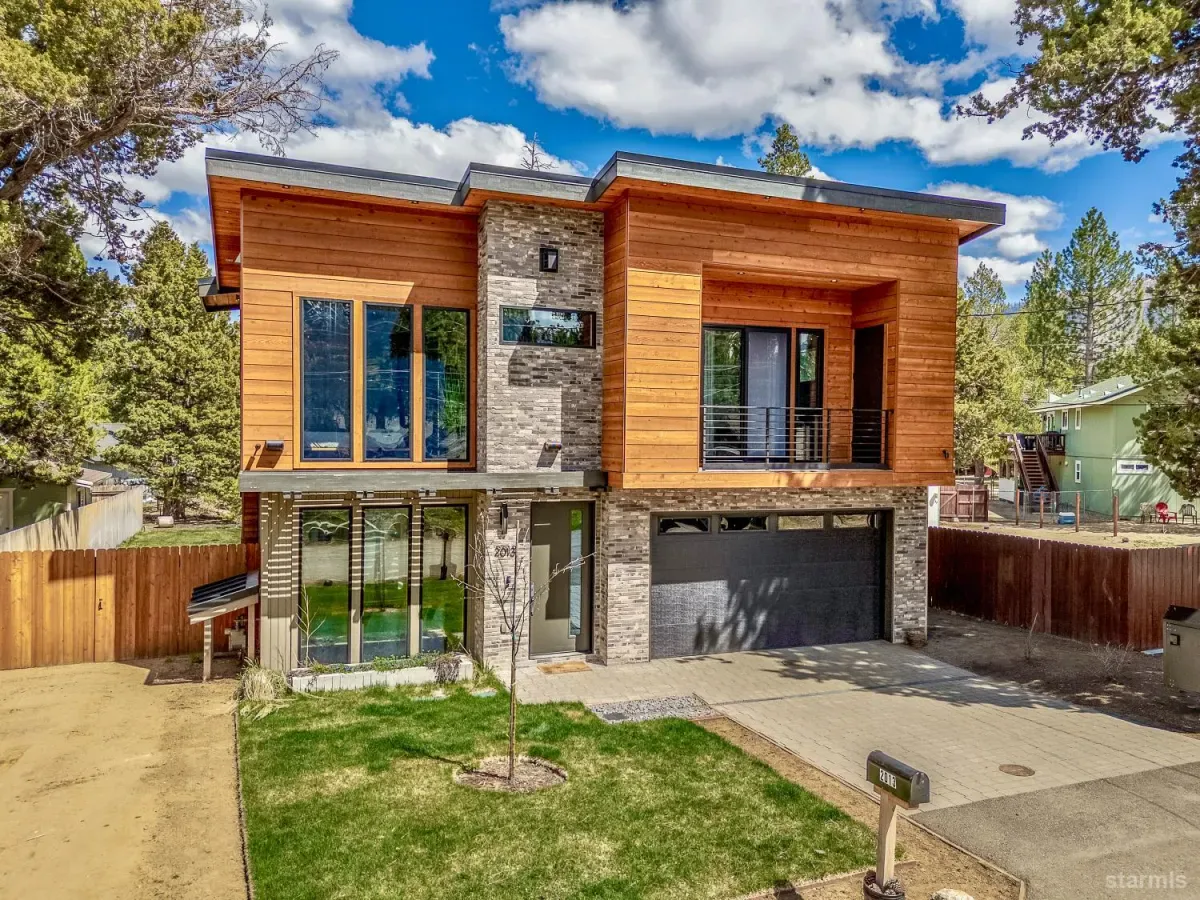 This contemporary South Lake Tahoe residence presents a refined expression of modern mountain living, where architectural precision meets understated luxury. Thoughtfully designed and impeccably finished, the home offers a luxurious retreat that harmonizes with its natural surroundings while providing the comfort and convenience expected of a newer, high quality build.Expansive windows and a carefully considered floor plan fill the interiors with natural light and forest views. Modern stone, tile, and micro cement finishes create a clean, sophisticated aesthetic, complemented by natural wood ceilings and custom European cabinetry that add warmth and depth throughout the home.The kitchen features integrated appliances and streamlined cabinetry, delivering both performance and visual cohesion. The great room, anchored by a dual fireplace and opening to a balcony, offers an elegant setting for entertaining or quiet evenings at home. A separate family room provides additional living space with direct access to the backyard.Outdoors, the property backs to unbuildable Forest Service land, ensuring lasting privacy and unobstructed views. Ideally situated near hiking and biking trails, a nearby golf course and country club, beaches, dining, shopping, and premier ski resorts, this home offers a rare combination of seclusion, design, and proximity to South Lake Tahoe’s most sought after amenities.