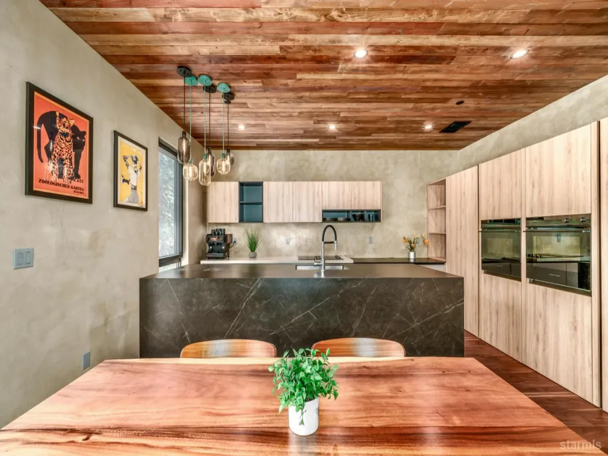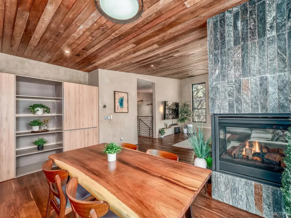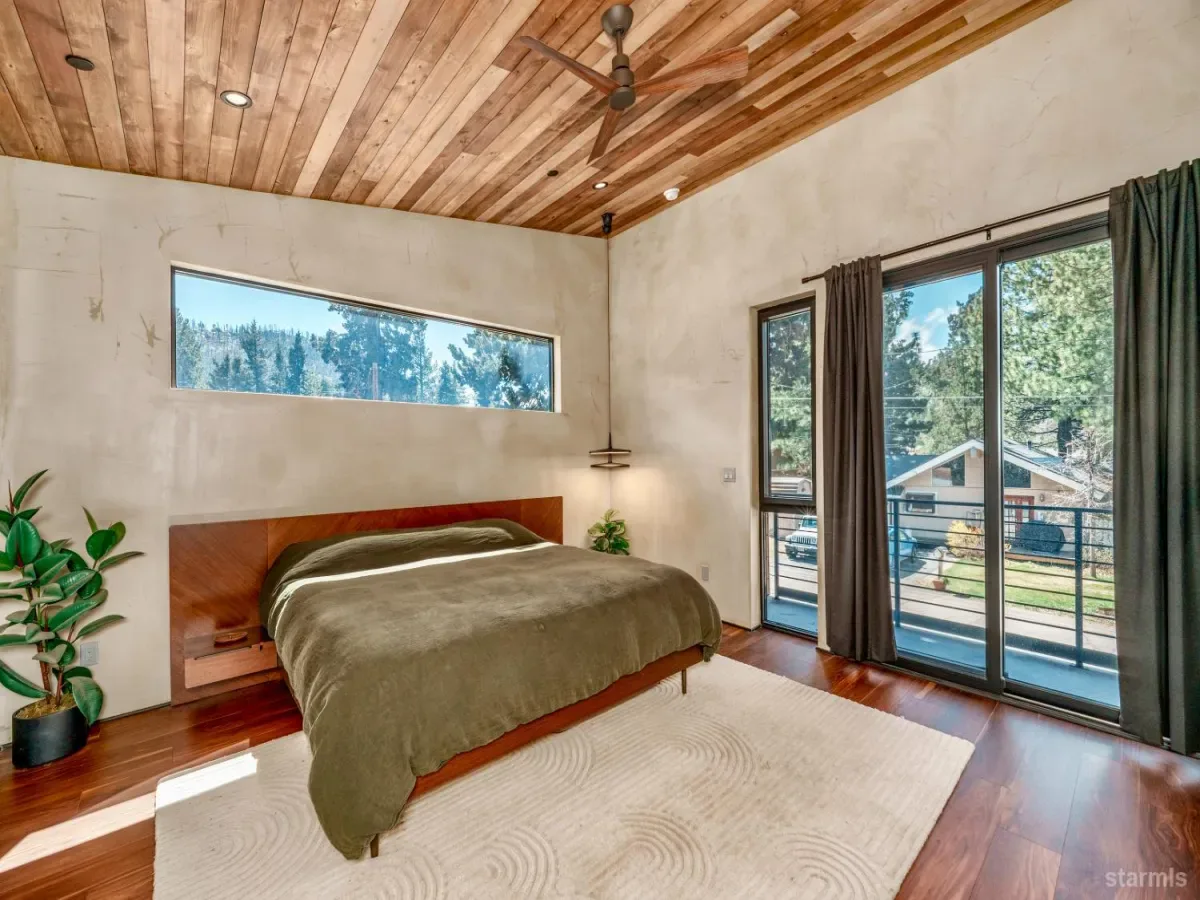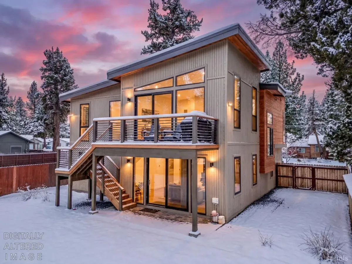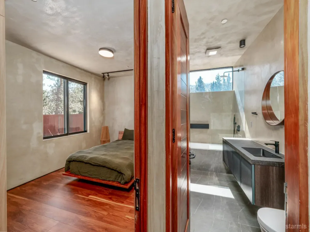 This contemporary South Lake Tahoe residence presents a refined expression of modern mountain living, where architectural precision meets understated luxury. Thoughtfully designed and impeccably finished, the home offers a luxurious retreat that harmonizes with its natural surroundings while providing the comfort and convenience expected of a newer, high quality build.Expansive windows and a carefully considered floor plan fill the interiors with natural light and forest views. Modern stone, tile, and micro cement finishes create a clean, sophisticated aesthetic, complemented by natural wood ceilings and custom European cabinetry that add warmth and depth throughout the home.The kitchen features integrated appliances and streamlined cabinetry, delivering both performance and visual cohesion. The great room, anchored by a dual fireplace and opening to a balcony, offers an elegant setting for entertaining or quiet evenings at home. A separate family room provides additional living space with direct access to the backyard.Outdoors, the property backs to unbuildable Forest Service land, ensuring lasting privacy and unobstructed views. Ideally situated near hiking and biking trails, a nearby golf course and country club, beaches, dining, shopping, and premier ski resorts, this home offers a rare combination of seclusion, design, and proximity to South Lake Tahoe’s most sought after amenities.