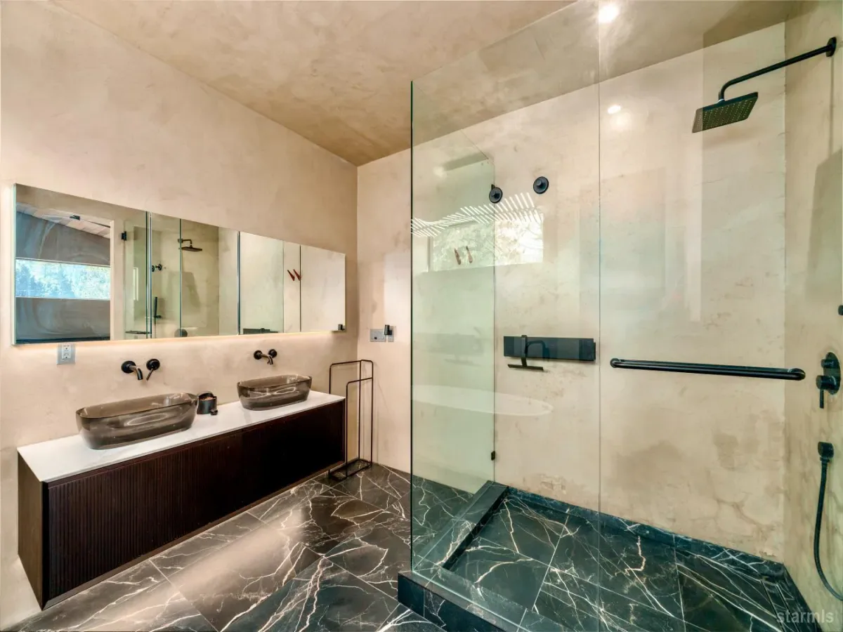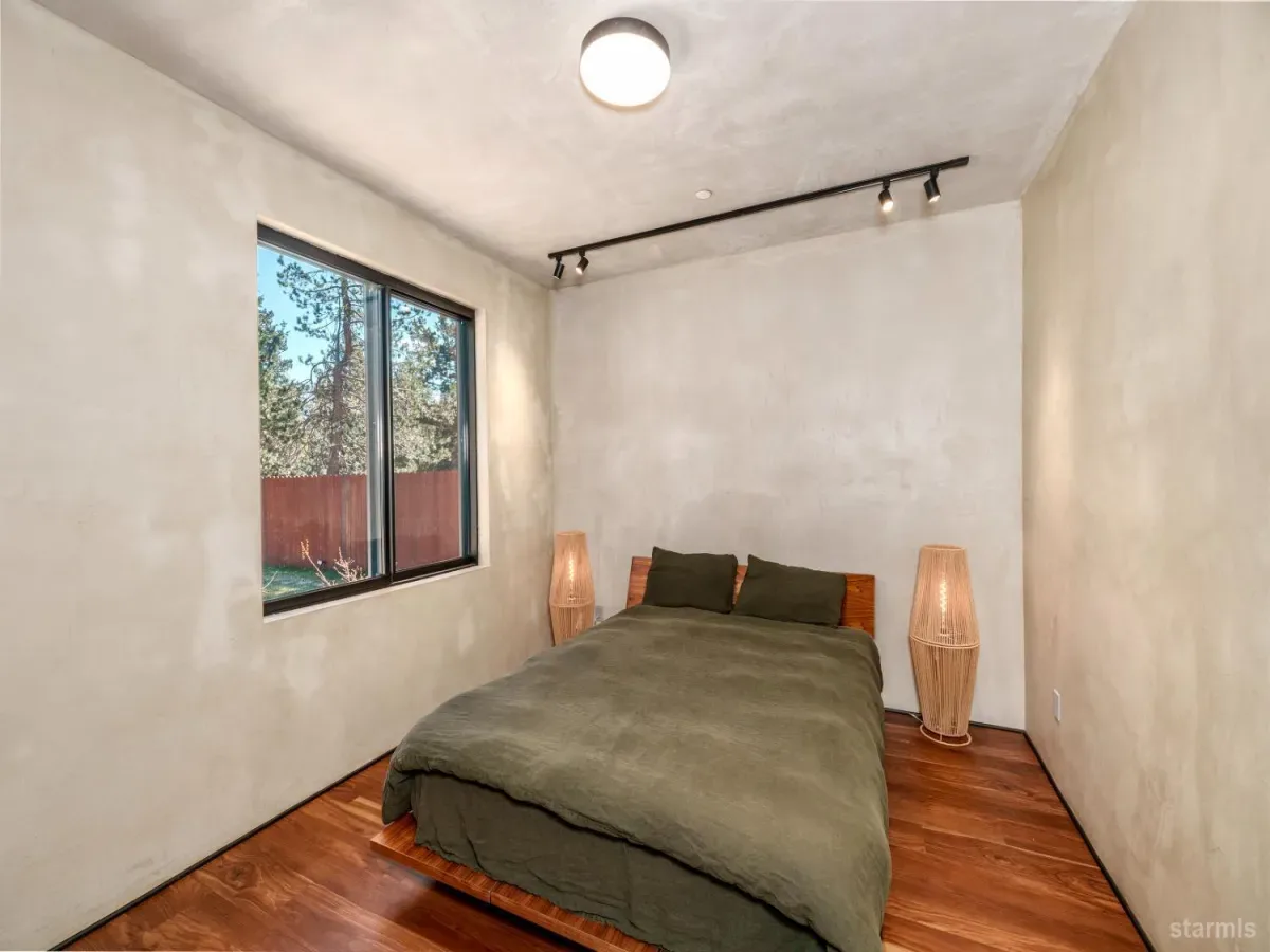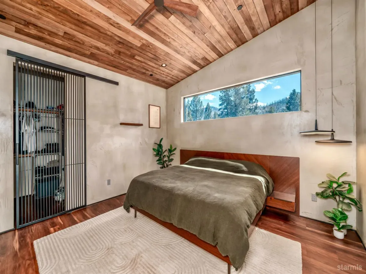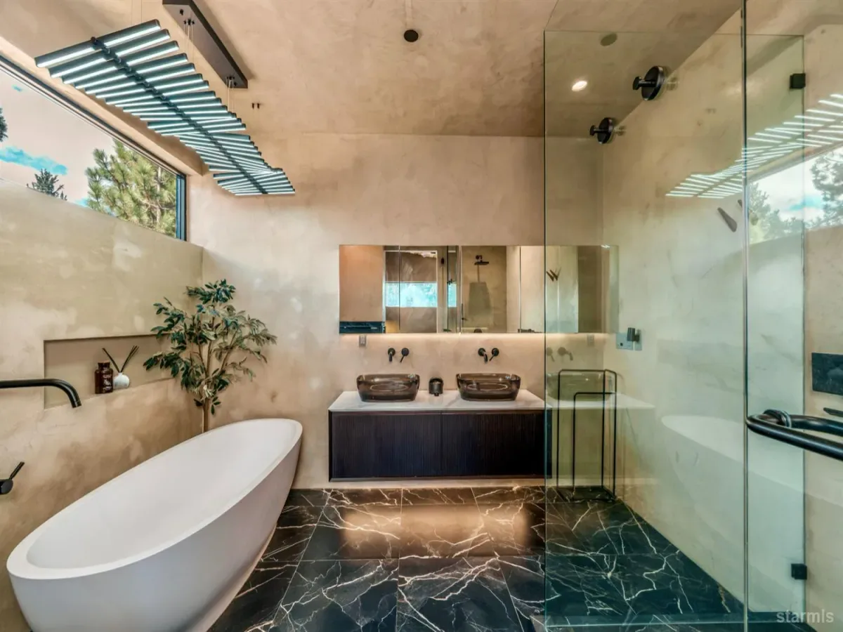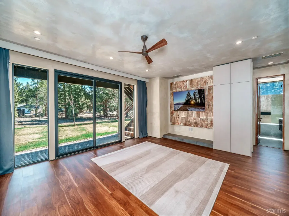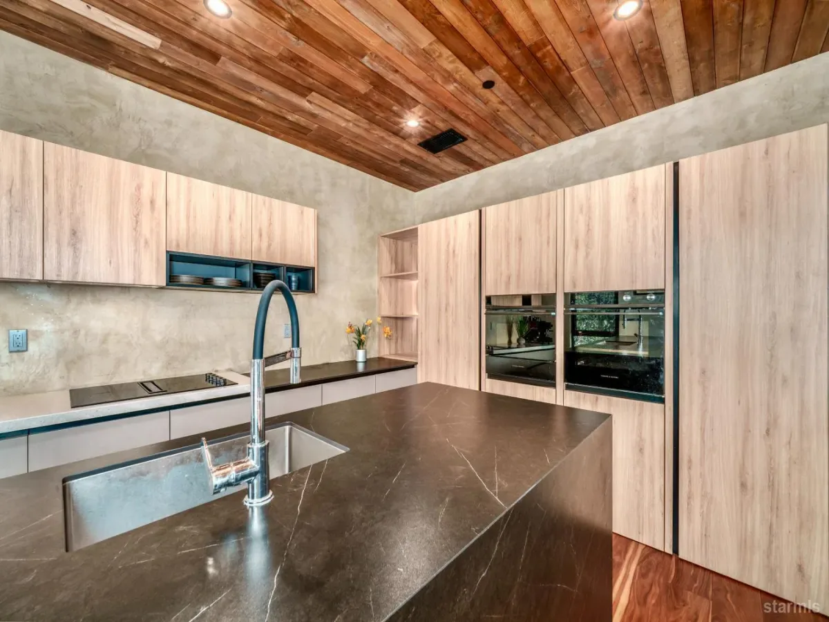 This contemporary South Lake Tahoe residence presents a refined expression of modern mountain living, where architectural precision meets understated luxury. Thoughtfully designed and impeccably finished, the home offers a luxurious retreat that harmonizes with its natural surroundings while providing the comfort and convenience expected of a newer, high quality build.Expansive windows and a carefully considered floor plan fill the interiors with natural light and forest views. Modern stone, tile, and micro cement finishes create a clean, sophisticated aesthetic, complemented by natural wood ceilings and custom European cabinetry that add warmth and depth throughout the home.The kitchen features integrated appliances and streamlined cabinetry, delivering both performance and visual cohesion. The great room, anchored by a dual fireplace and opening to a balcony, offers an elegant setting for entertaining or quiet evenings at home. A separate family room provides additional living space with direct access to the backyard.Outdoors, the property backs to unbuildable Forest Service land, ensuring lasting privacy and unobstructed views. Ideally situated near hiking and biking trails, a nearby golf course and country club, beaches, dining, shopping, and premier ski resorts, this home offers a rare combination of seclusion, design, and proximity to South Lake Tahoe’s most sought after amenities.