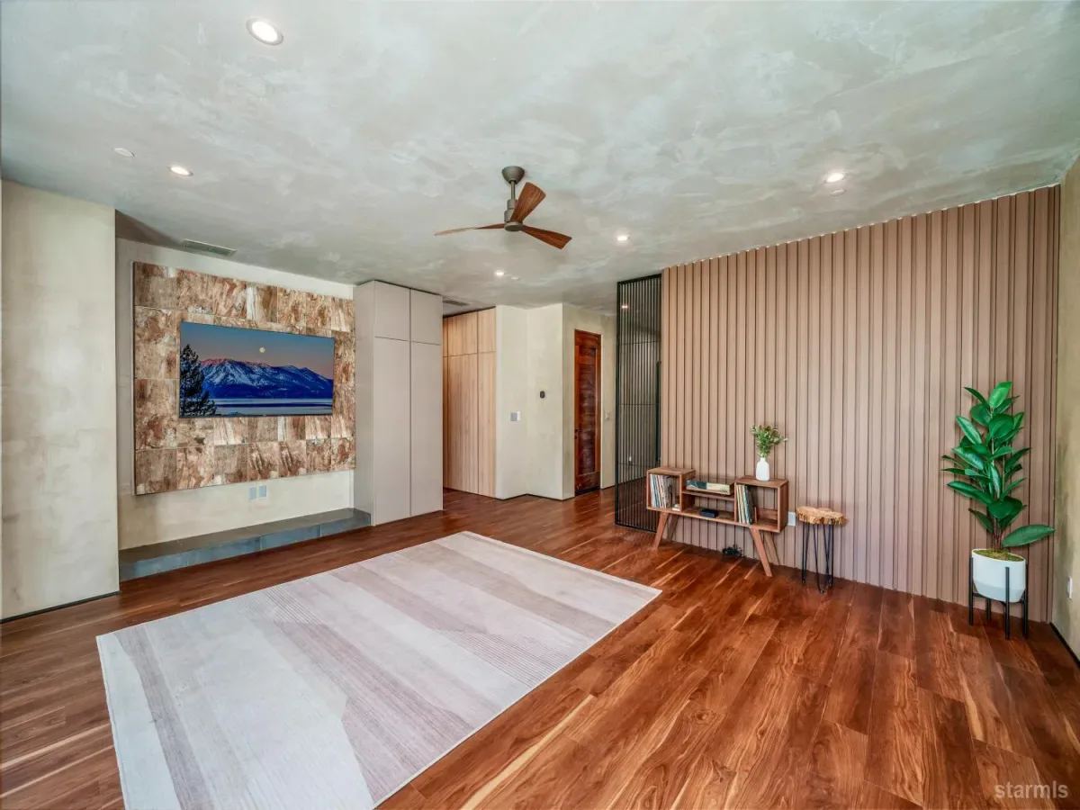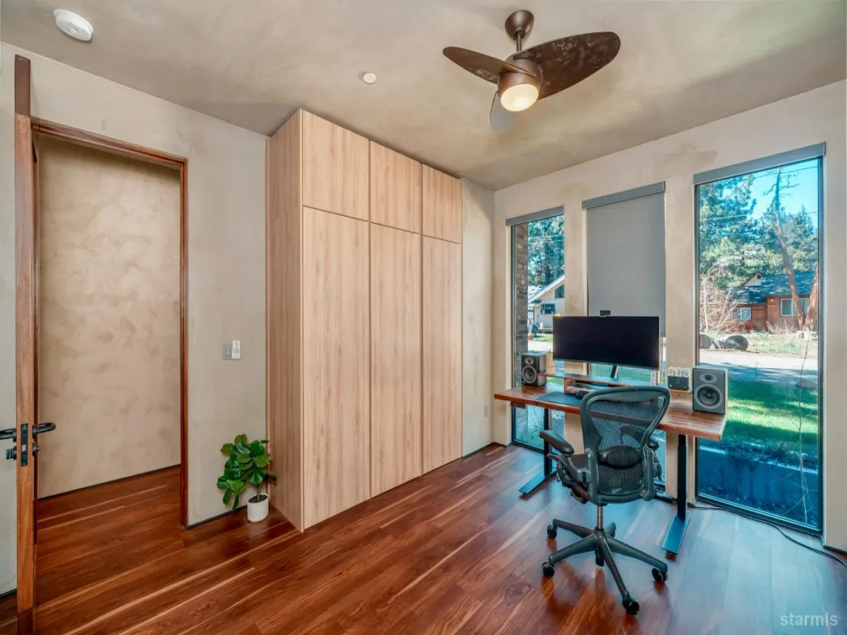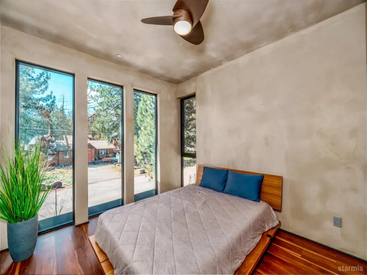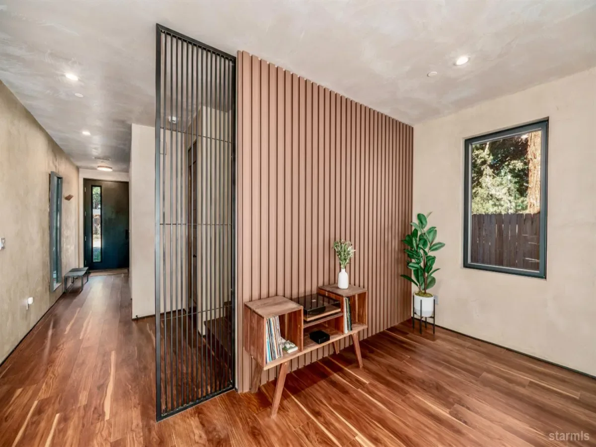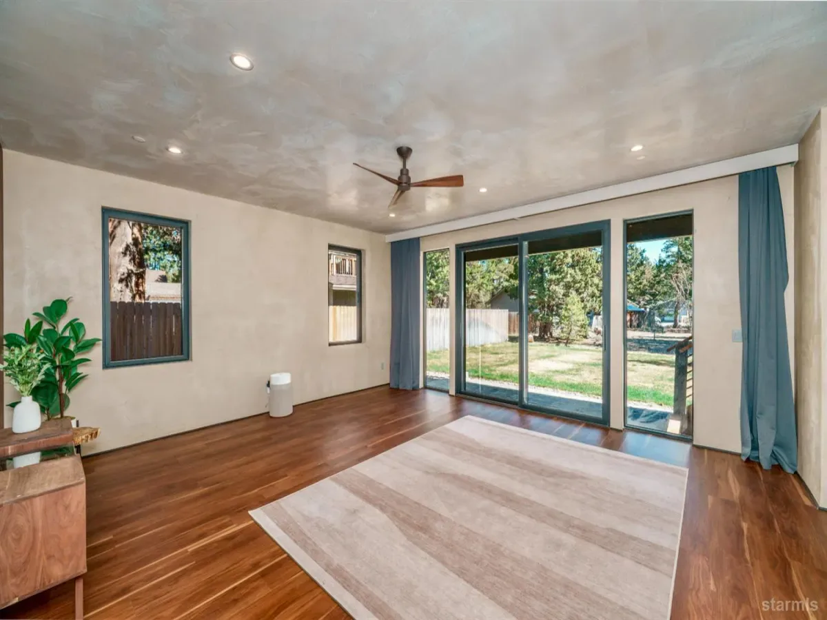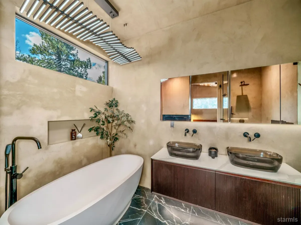 This contemporary South Lake Tahoe residence presents a refined expression of modern mountain living, where architectural precision meets understated luxury. Thoughtfully designed and impeccably finished, the home offers a luxurious retreat that harmonizes with its natural surroundings while providing the comfort and convenience expected of a newer, high quality build.Expansive windows and a carefully considered floor plan fill the interiors with natural light and forest views. Modern stone, tile, and micro cement finishes create a clean, sophisticated aesthetic, complemented by natural wood ceilings and custom European cabinetry that add warmth and depth throughout the home.The kitchen features integrated appliances and streamlined cabinetry, delivering both performance and visual cohesion. The great room, anchored by a dual fireplace and opening to a balcony, offers an elegant setting for entertaining or quiet evenings at home. A separate family room provides additional living space with direct access to the backyard.Outdoors, the property backs to unbuildable Forest Service land, ensuring lasting privacy and unobstructed views. Ideally situated near hiking and biking trails, a nearby golf course and country club, beaches, dining, shopping, and premier ski resorts, this home offers a rare combination of seclusion, design, and proximity to South Lake Tahoe’s most sought after amenities.