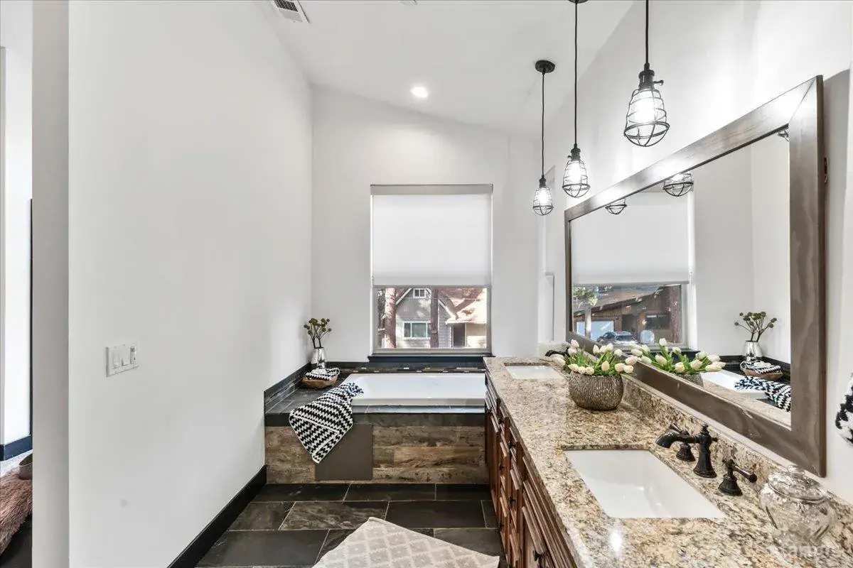 Discover modern mountain luxury in this newer custom-built residence, perfectly situated just minutes from Lake Tahoe’s beaches, scenic bike trails, and world-class ski resorts. Thoughtfully designed with upstairs living, this stunning four-bedroom, three-bathroom home blends contemporary comfort with sleek mountain modern design.The upper level showcases an oversized custom kitchen that is both ideal for entertaining and a true chef’s dream, featuring rich honey-glazed alder cabinetry, slab granite countertops, stainless steel appliances, and generous counter space. Expansive windows flood the home with natural light, enhancing the open-concept great room with laminate hardwood flooring throughout and a gas fireplace, perfect for cozy nights at home.Step outside to the large upper deck, ideal for afternoon BBQs and outdoor gatherings, with stairs leading to the backyard below. The primary suite on this level offers a true retreat, complete with a walk-in closet, private deck, and a spa-inspired bathroom featuring a jetted soaking tub, stall shower, and dual vanities. A full hall bath and an additional bedroom with walk in closet complete the main living level.Downstairs, a spacious secondary living area awaits, highlighted by a second gas fireplace, two generously sized bedrooms, and a third full bathroom, ideal for guests or extended family. Each bathroom is beautifully appointed with custom tile work, natural stone accents, and slab granite countertops.After a day of Tahoe adventure, unwind in the private hot tub just off the lower deck. Additional highlights include a 50-amp outlet in the garage ready for an EV charger, an on-demand water heater, paving stone driveway, bear box, and a large level yard, a blank canvas ready for your personal vision.Enjoy the ultimate Tahoe lifestyle with beaches, shopping, and restaurants just minutes away, plus endless forest trails perfect for morning walks or biking adventures right from your front door. This exceptional home offers luxury, comfort, and location all in one.