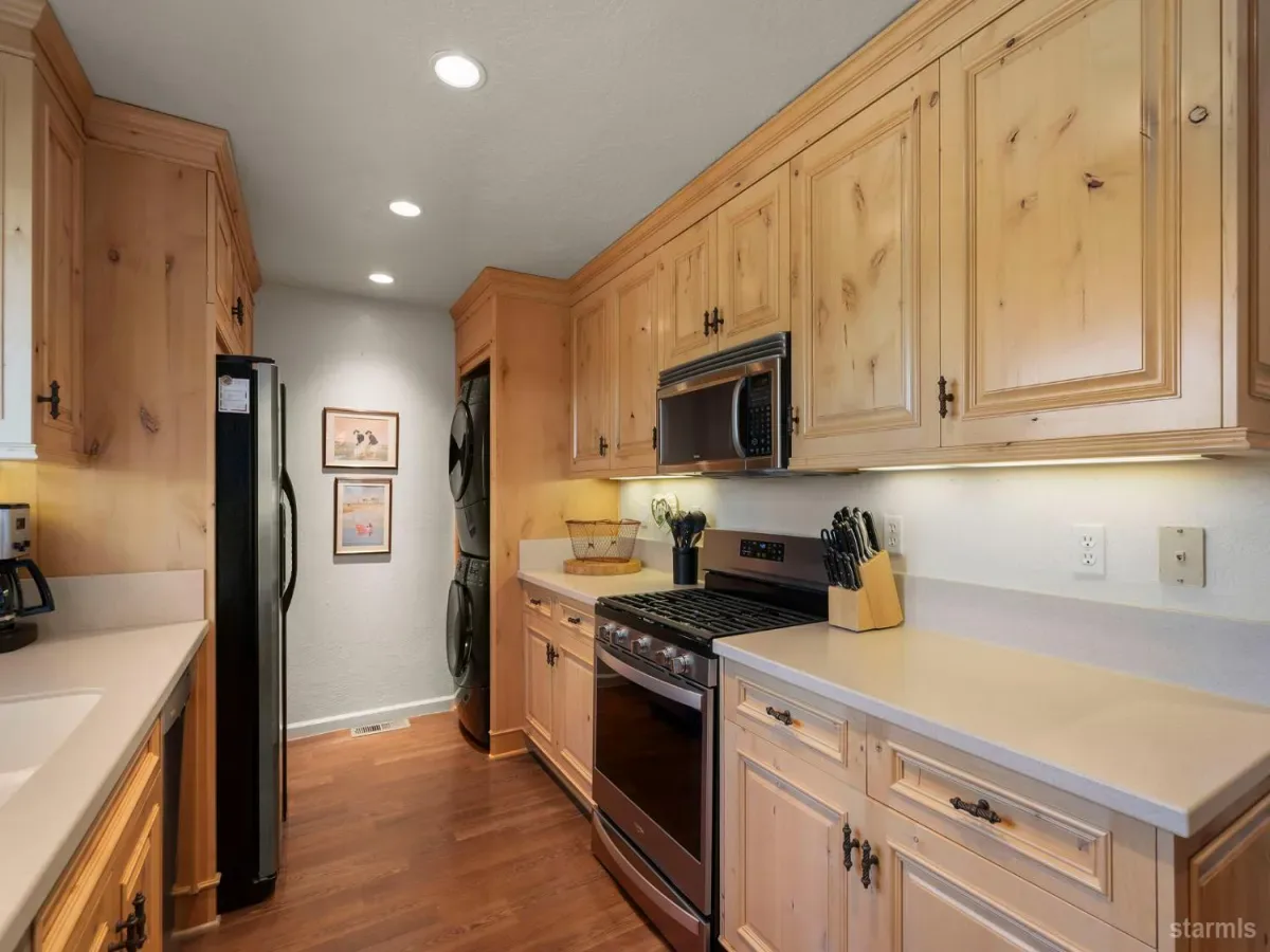 Spacious Mountain Alpine Chalet Located in Tahoe Tyrol on the gentle hill side halfway between Vail’s Heavenly Resort World Class Skiing and Tahoe’s exciting State Line Entertainment with lots of restaurants and shopping options, and only 4 miles to Nevada Beach. Four bedrooms, three bathrooms, extra-large two car garage, numerous decks and patios, peaceful setting backing to open space, with filtered view of Lake Tahoe.Enter the great room with open beamed, vaulted wood ceilings, and a wood burning fireplace. Step into the kitchen and dining area with peaceful forest setting, and filter lake views. A full bathroom, plus one large bedroom completes this main floor. Upstairs are two more bedrooms, a full bath with sauna, and two more cozy patios.Kitchen has beautifully upgraded cabinets and Corian tops. All baths have Corian tops and upgraded fixtures. Oversized two car garage. Guest Quarters behind the garage complete the fourth bedroom and third bathroom. Also enjoy the Tahoe Tyrol pool, spa, and clubhouse, all for a low HOA fee. This is your perfect Tahoe getaway.