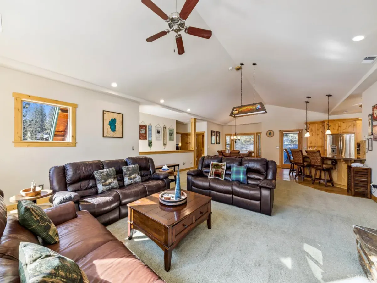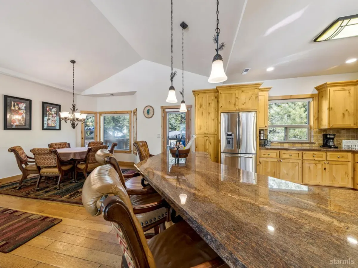Spacious two-story home in the desirable Christmas Valley area set on a sunny, level 10,019 sq ft lot. Built in 2009, this 4-bedroom, 2.5-bath home offers 2,831 sq ft with an upstairs living layout designed for comfort and entertaining.The expansive great room features vaulted ceilings, a gas fireplace wrapped in custom ledgestone, and knotty alder wrapped windows that bring in natural light and forest views. The kitchen is well equipped with shaker-style alder cabinetry, granite slab counters, GE Monogram stainless steel appliances, and a commercial-style gas range.The primary suite includes an en-suite bathroom with a dual-sink granite vanity, custom travertine tile, and a jetted tub. Downstairs offers a second living area with sliding glass doors leading to a covered deck and a fully fenced, landscaped backyard.Located near miles of hiking and biking trails, with convenient access to Sierra-at-Tahoe Resort, and just a short drive to the beaches of Lake Tahoe, this home offers a great balance of space, comfort, and access to year-round outdoor recreation.