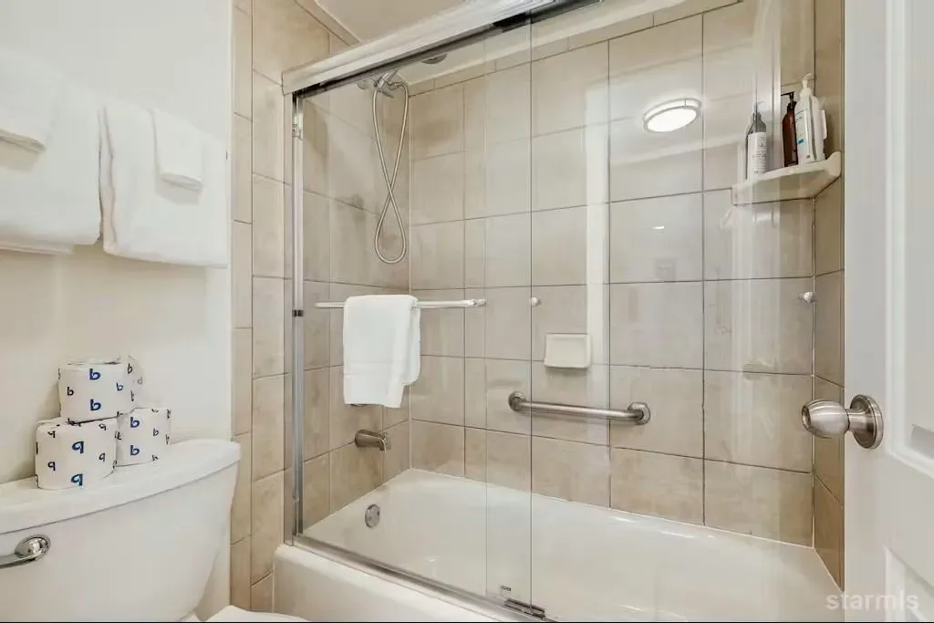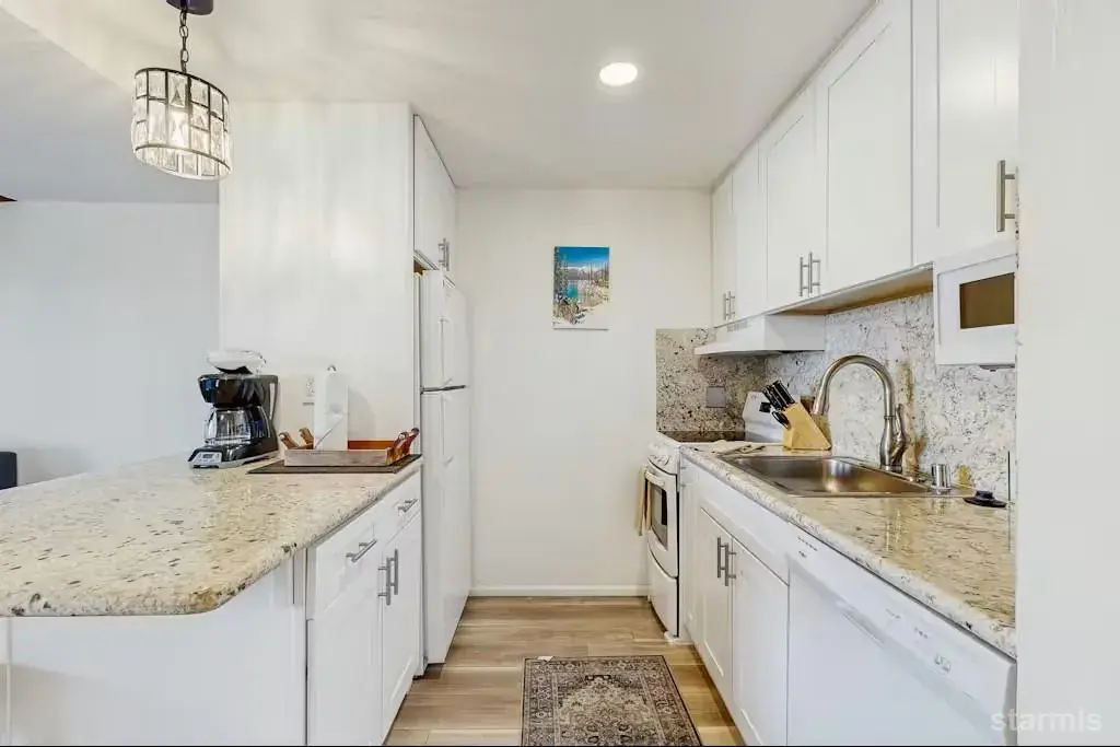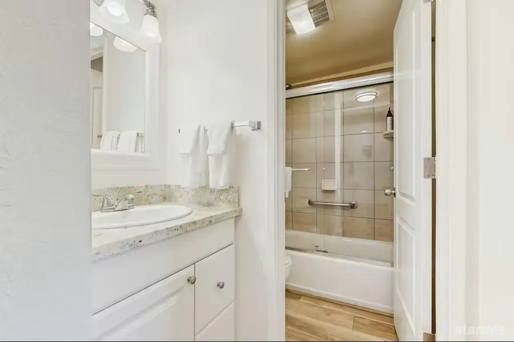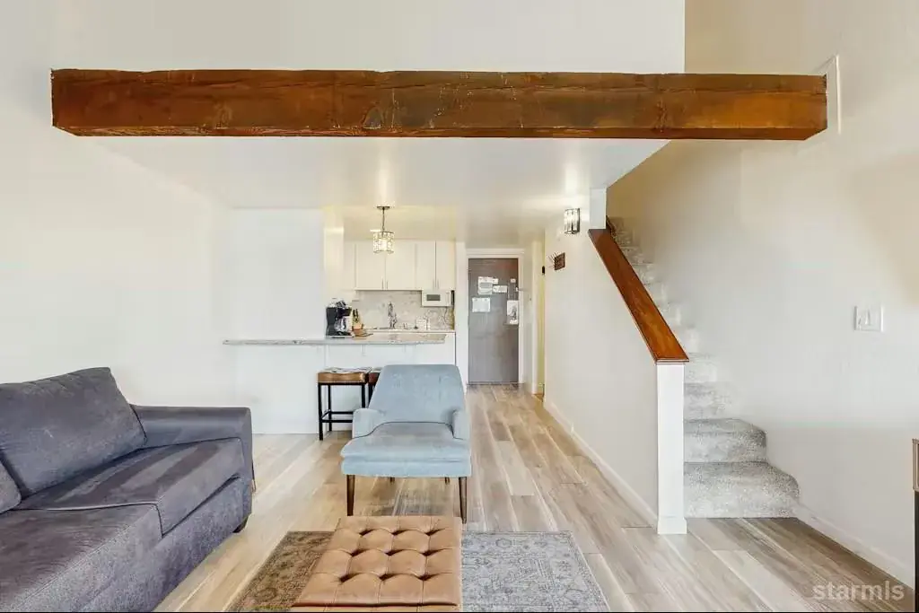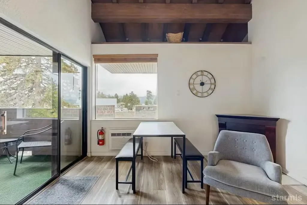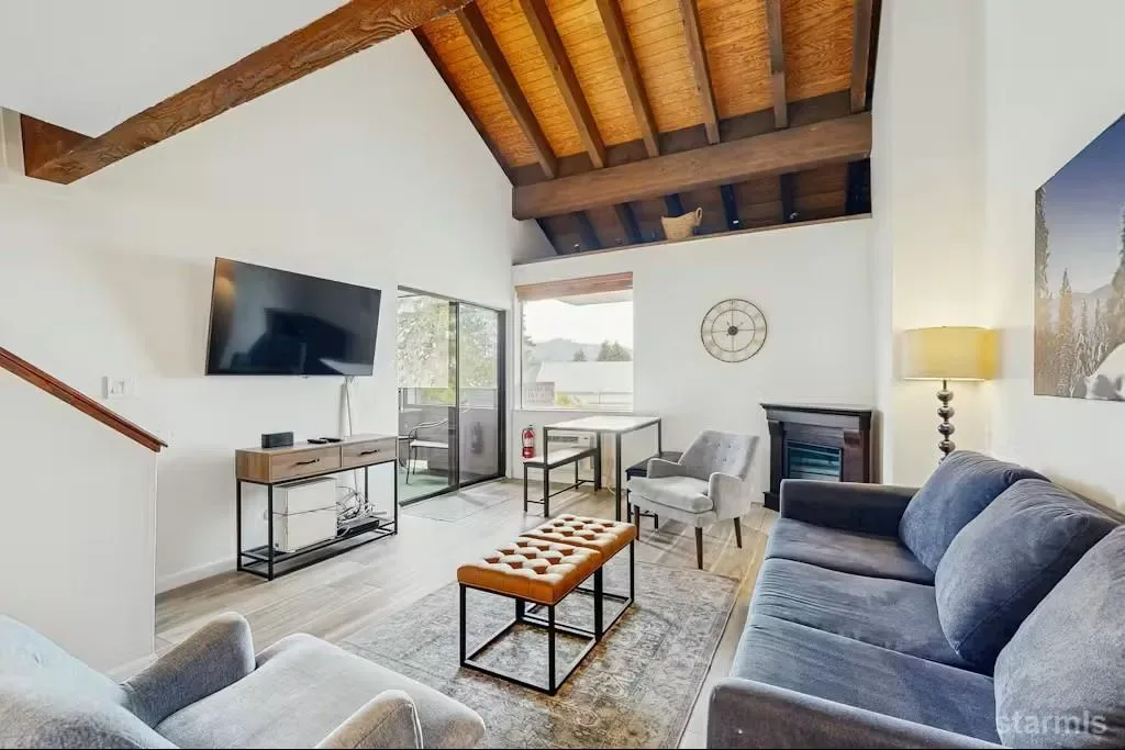 This fully furnished top‑floor condo in Lakeland Village features open‑beam vaulted ceilings and a private balcony with views of Mount Tallac and a peek of Lake Tahoe. Lakeland Village offers more than 1,000 feet of South Lake Tahoe’s best sandy beach, a new HOA pier, and a beachside pool and hot tub.The main lodge building includes a year‑round heated pool, an additional hot tub, two saunas, a small fitness center, and a subterranean parking garage with unassigned parking. The interior hallways are heated and offer elevator access, and the building was recently upgraded with durable fiber‑cement siding.Inside the condo, you’ll find solid‑surface laminate flooring, granite countertops, beautiful white shaker cabinetry, and tasteful furnishings throughout. The second bedroom is a loft with open‑beam vaulted ceilings and its own half bath, adding extra space and flexibility.This is an ideal home‑away‑from‑home an affordable second‑home retreat where you can escape the valley heat and enjoy year‑round activities. The condo is just a two‑minute stroll along paved stone pathways to the crystal‑clear waters and sandy beach of South Lake Tahoe.If you’d like to offset ownership costs, the condo is approved for short‑term vacation rentals, giving you excellent flexibility for both personal use and investment potential.