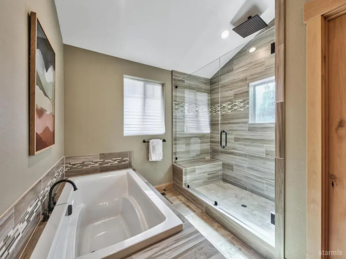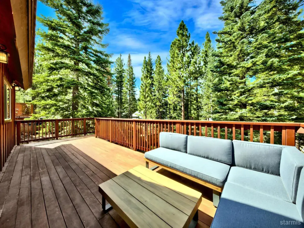 Bordering one of Tahoe’s most recreation-rich forest corridors, this mountain home claims a level 10,000-sf lot in the North Upper Truckee neighborhood, just moments from trail access leading toward Echo Summit. The wide front elevation delivers excellent curb appeal with a 3-car garage, generous covered entry, and varied rooflines. Lap cedar siding, cedar shingles, and stone accents provide a classic Tahoe aesthetic. The south-facing front draws strong natural light, while the fully fenced, flat backyard offers easy year-round usability. A split-level entry sets up an ideal flow, leading to upstairs living with cathedral ceilings, an exposed ridge beam, and a substantial stone fireplace. Warm tones and distressed acacia hardwood flooring elevate the main level. The open layout connects the living room to a large dining area, built-in wine bar, and a well-appointed kitchen with a central L-shaped island, farmhouse sink, two dishwashers, built-in commercial refrigerator, and a walk-in pantry. The upper-level primary suite is oversized and comfortable, featuring its own stone fireplace, a large walk-in closet, and a bath with an extensive dual vanity, 72-inch soaking tub, and stall shower. The lower level centers around a welcoming family room with a third fireplace and direct access to the yard, dual rear decks, and the new 7-person hot tub. Three additional bedrooms and two full baths, including a secondary suite, complete this floor. Multiple outdoor areas create easy indoor-outdoor living and great connectivity to the backyard. Tastefully furnished, the home blends comfort, scale, and timeless Tahoe style in a recreation-rich setting.