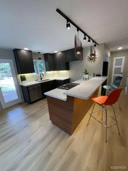 Escape to the quiet, coveted corners of Gardner Mountain with this completely reimagined home. An alpine sanctuary where Hygge meets Tahoe Blue. A study in serene, Scandinavian-inspired living just moments from Tahoe’s pristine forests and celebrated beaches. Stepping inside, you’ll feel the vibe of a redesign rooted in simplicity and light. This 2 bedroom, 1 bathroom home has been completely and thoughtfully remodeled, creating a haven where every detail contributes to a feeling of hygge. The heart of the open concept home is an updated kitchen, including crisp quartz countertops, refreshed cabinetry and stainless appliances. The grand bar, wrapped in exotic Sapele wood, invites morning coffee, dining and entertaining. The adjacent, sparkling new bathroom offers a unique textural surprise underfoot with a custom Japanese pebble floor in Tahoe Blue colors, a deep soaking tub with timeless shower tile. Sunlight streams through the new dual pane windows, illuminating the blend of mid-century modern touches that warm the Scandinavian palette think clean wood tones, geometric finesse, and purposeful fixtures. For cozy Tahoe nights, the living area features a modern fireplace with gas insert, offering instant warmth and ambiance without the fuss. The newly paved driveway leads to an oversized garage featuring a custom, full 8′ tall by 10′ wide Martin garage door, providing generous, easy access for full size vehicles and exceptional storage. Beyond the home, two brand new redwood decks offer both a perfect backyard sun-drenched spot, plus a friendly front covered porch facing a Conservancy lot. The huge, fully fenced backyard provides a private realm for pets or quiet enjoyment, with plenty of space for an ADU or offset costs with a VHR permit which are now being issued in South Lake Tahoe. This is more than a remodel; it’s a foundation for a simplified life.