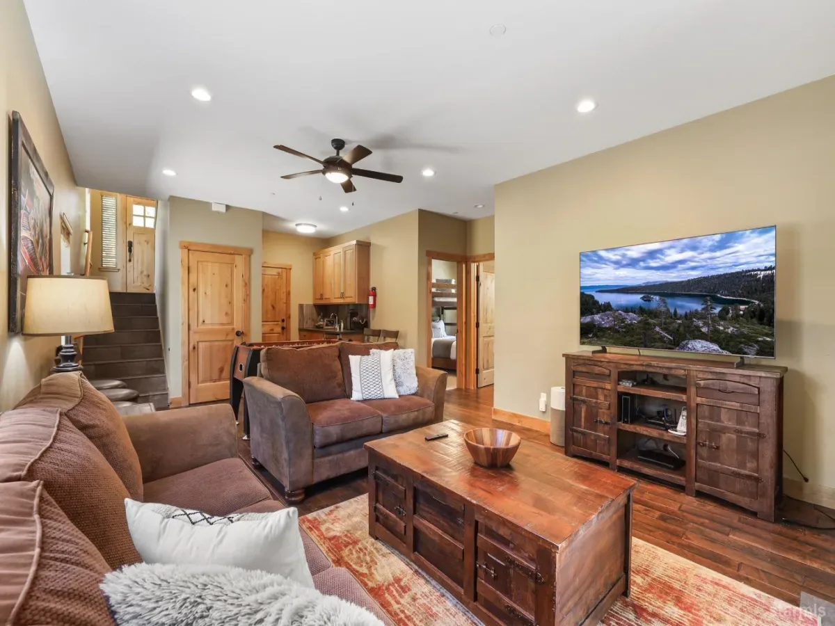This beautiful sunny Tahoe home is located adjacent to Forest Service land and across the street from the Truckee river. This home is offered truly turn key including all the furnishings, appliances, electronics and artwork. Enjoy all the comforts for peaceful mountain living and close to all the fun. The Great room has soaring vaulted ceilings, a delightfully inviting stone fireplace and a large balcony to take in the fresh Tahoe air. The open floorplan allows for entertaining with a huge dining and bar area and a bbq deck right out the door. The finishes include Solid Birch hardwood floors, sophisticated stone and beautiful tile work throughout. The tastefully designed kitchen is equipped with quartz slab countertops, alder cabinetry and a 36 inch gas range. The primary suite features a large bedroom with sitting area complete with lots of windows and a spacious bath with a classy freestanding tub and elegant tile. Downstairs you will find 2 more bedrooms, a full bath and family/game room with wet bar and access to the 2 car garage. This home is the perfect mountain retreat and has been well maintained and comes with a hot tub. Easy access to everything Tahoe has to offer!