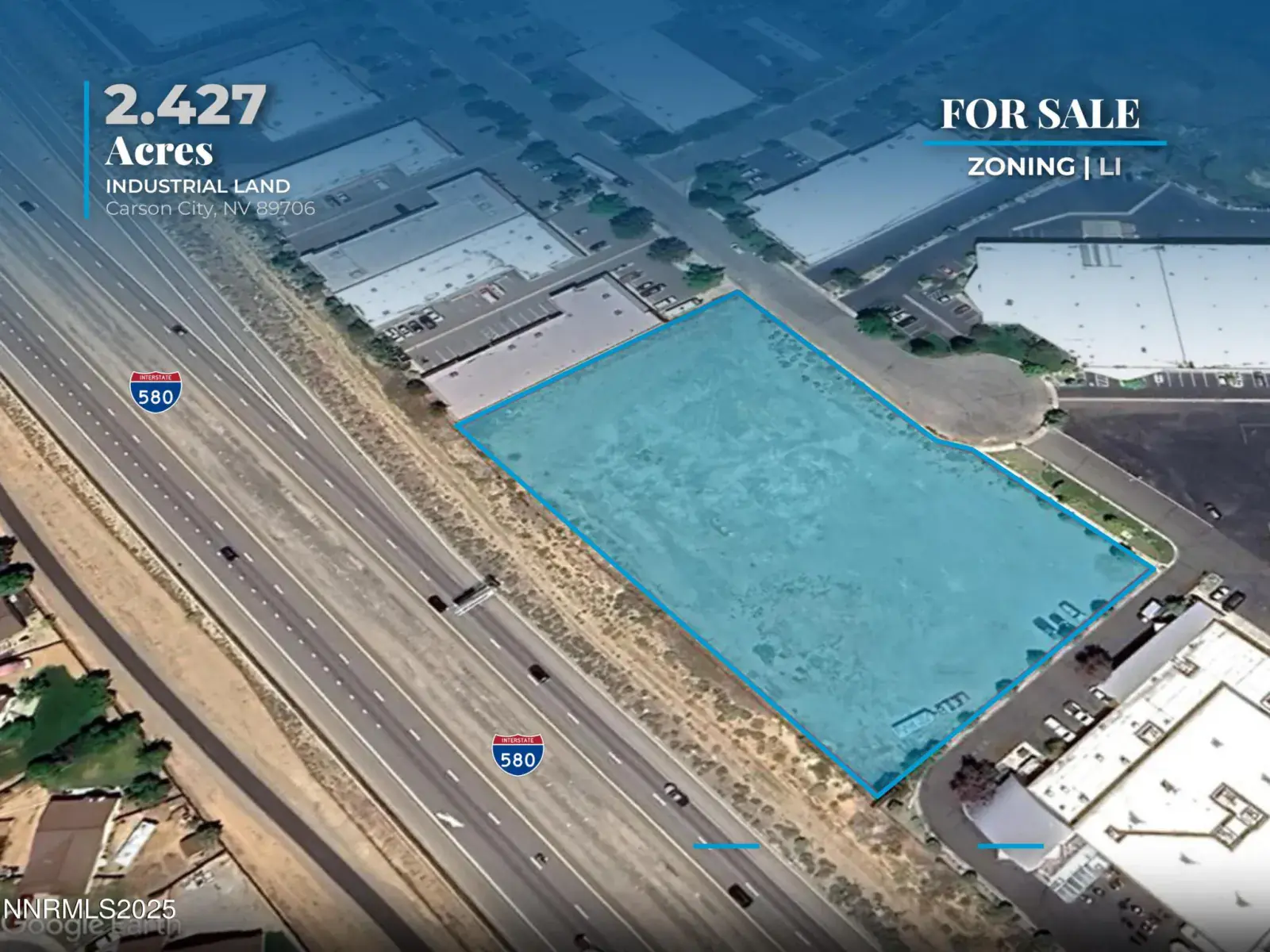 Located on Research Way in Carson City, this 2.427-acre commercial parcel offers an exceptional development opportunity with excellent visibility and access from I-580. Priced at 1,350,000, the property is zoned Limited Industrial (LI), allowing for a wide range of retail and wholesale uses such as storage units, equipment rental, flex space, distribution centers, office, restaurant, hotel, and fitness facilities. The site features approximately 434 feet of frontage along I-580, which sees an average of 40,500 vehicles per day (2023), and an additional 220 feet of frontage on Research Way. All utilities are available at the site, and water and sewer hookup charges are reasonable with no need to purchase water rights. The property is level, shovel-ready, and easy to develop, with the potential to subdivide. Conveniently located adjacent to the 40,000 square foot Battle Born Harley Davidson facility, this parcel is ideal for businesses seeking visibility, access, and flexibility in one of Carson City’s most active commercial corridors.