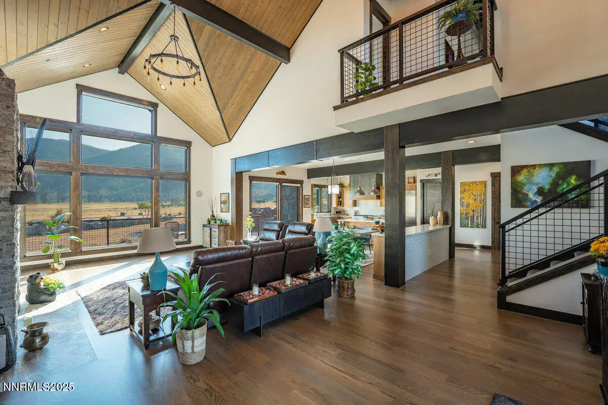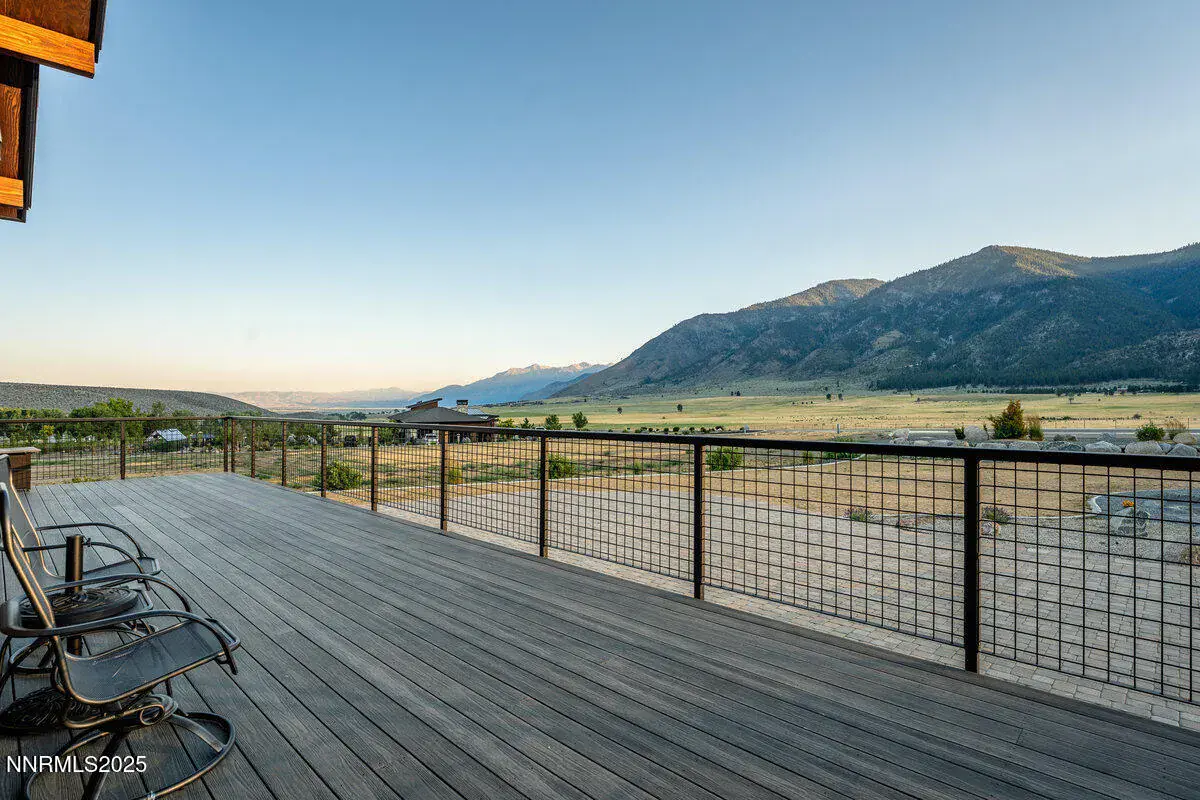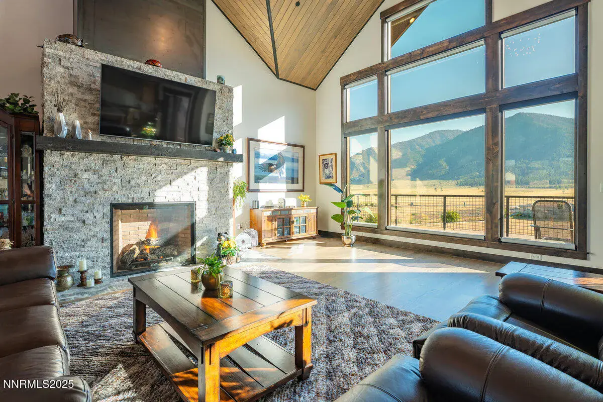 Secured behind the private gates of Coyote Ranch Estates, this newly built custom home sits on 2 acres with breathtaking views of Jacks Valley Ranch and the Sierra Nevada Mountains. This architectural masterpiece boasts a seamless blend of modern elegance and traditional design elements. Upon entry, you are greeted by a grand great room featuring solid hardwood floors, soaring vaulted ceilings, and expansive windows that frame panoramic views. With a newly formed HOA, Seller is offering one year prepayment of HOA dues. A stunning hardwood ceiling and metal trim accentuate the room’s grandeur, while a state-of-the-art built-in surround sound system, electric shade system, and easy access to the expansive fortress deck and paver patio enhance the home’s entertainment capabilities. The chef’s kitchen is a true focal point, outfitted with top-of-the-line commercial-grade KitchenAid dual-fuel range, cooktop, 48″ refrigerator, and built-in microwave. The solid Adler wood cabinetry complements the striking quartzite countertops, and the Kohler undermount sink adds both style and function. The main-level master suite offers a serene retreat with mesmerizing views, a luxurious custom bathroom with a large standalone steam-shower system, a freestanding bathtub, heated floors, and power mirrors. Upstairs features an additional ensuite bedroom and family room with half bath, Brazilian Tiger Wood flooring, a full bar with built-in refrigerator, and another stunning hardwood ceiling complete the upper level. This home also features an oversized three-car garage with electric vehicle charging capabilities, as well as beautifully landscaped grounds with ornamental trees, shrubs, and grasses. Granite rock boulder walls and an elegant water feature further enhance the property’s appeal. Coyote Ranch Estates is a boutique community of just 16, two acre homesites, offering privacy, security, and convenience—minutes from the historic town of Genoa, Genoa Lakes and Ranch golf courses, Minden-Tahoe Private Airport, the areas super stores and a short drive to Lake Tahoe This is more than a home—it’s a lifestyle.