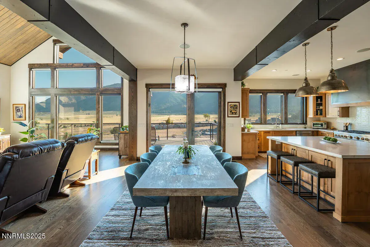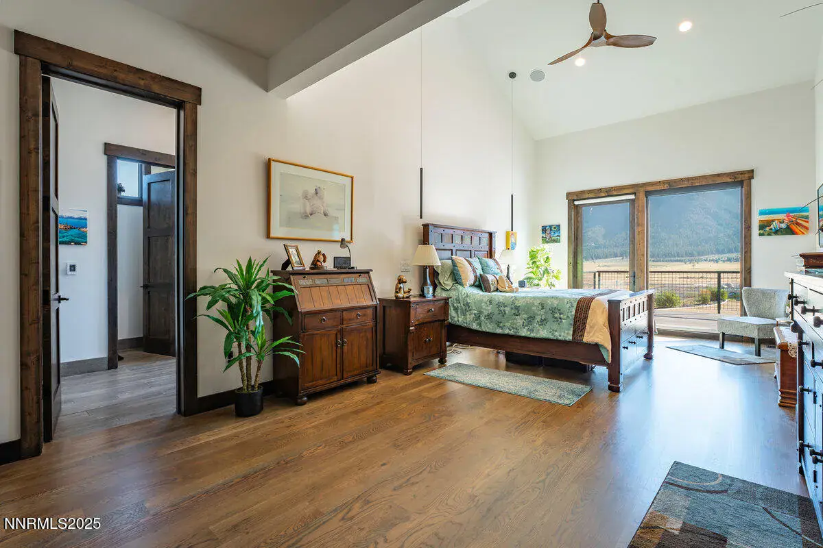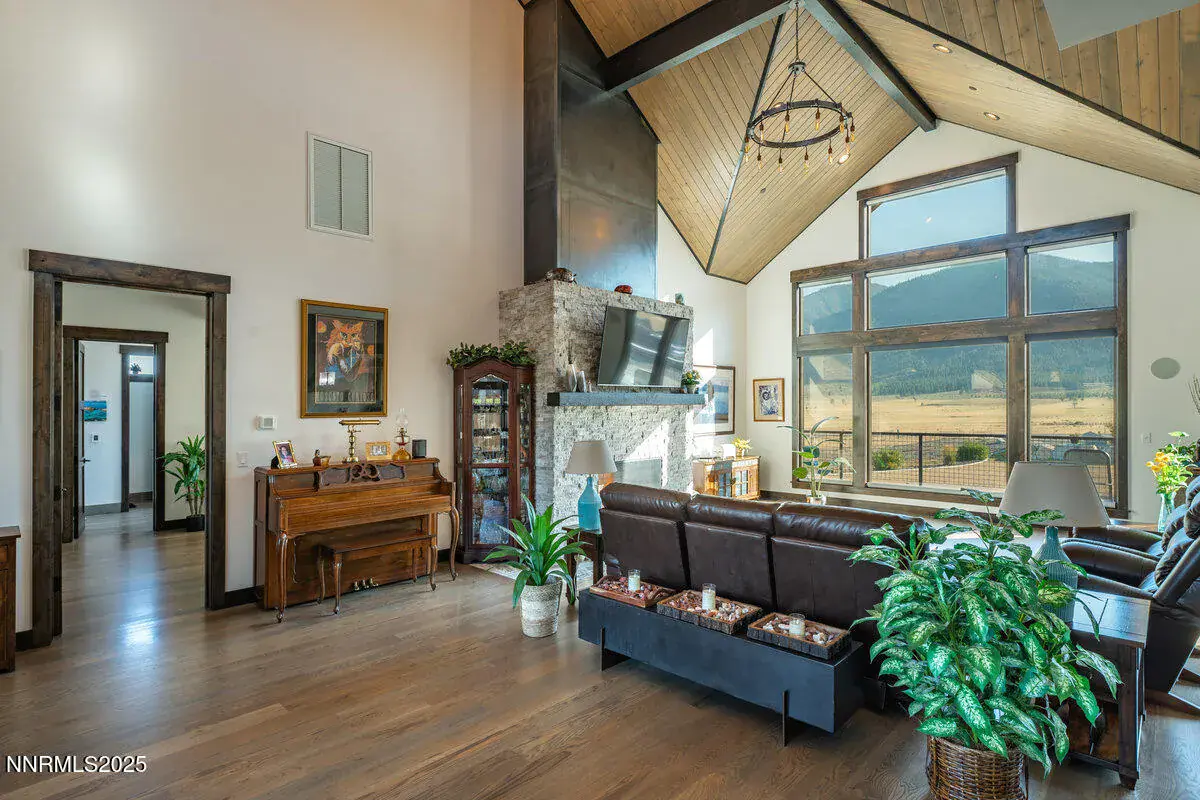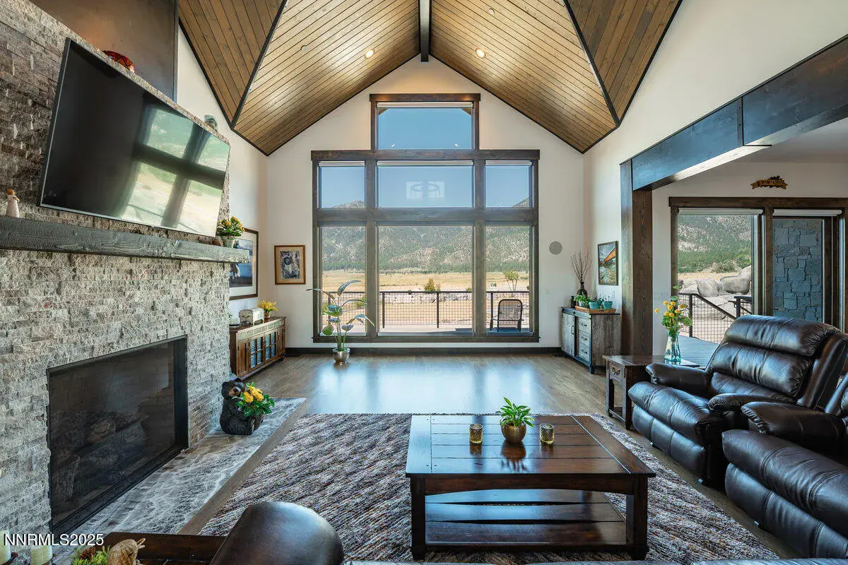 Secured behind the private gates of Coyote Ranch Estates, this newly built custom home sits on 2 acres with breathtaking views of Jacks Valley Ranch and the Sierra Nevada Mountains. This architectural masterpiece boasts a seamless blend of modern elegance and traditional design elements. Upon entry, you are greeted by a grand great room featuring solid hardwood floors, soaring vaulted ceilings, and expansive windows that frame panoramic views. With a newly formed HOA, Seller is offering one year prepayment of HOA dues. A stunning hardwood ceiling and metal trim accentuate the room’s grandeur, while a state-of-the-art built-in surround sound system, electric shade system, and easy access to the expansive fortress deck and paver patio enhance the home’s entertainment capabilities. The chef’s kitchen is a true focal point, outfitted with top-of-the-line commercial-grade KitchenAid dual-fuel range, cooktop, 48″ refrigerator, and built-in microwave. The solid Adler wood cabinetry complements the striking quartzite countertops, and the Kohler undermount sink adds both style and function. The main-level master suite offers a serene retreat with mesmerizing views, a luxurious custom bathroom with a large standalone steam-shower system, a freestanding bathtub, heated floors, and power mirrors. Upstairs features an additional ensuite bedroom and family room with half bath, Brazilian Tiger Wood flooring, a full bar with built-in refrigerator, and another stunning hardwood ceiling complete the upper level. This home also features an oversized three-car garage with electric vehicle charging capabilities, as well as beautifully landscaped grounds with ornamental trees, shrubs, and grasses. Granite rock boulder walls and an elegant water feature further enhance the property’s appeal. Coyote Ranch Estates is a boutique community of just 16, two acre homesites, offering privacy, security, and convenience—minutes from the historic town of Genoa, Genoa Lakes and Ranch golf courses, Minden-Tahoe Private Airport, the areas super stores and a short drive to Lake Tahoe This is more than a home—it’s a lifestyle.