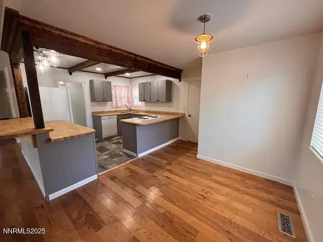 Welcome to this unique home! 3 bedrooms and 2 bathrooms, 1480 square feet of open living space. Wood flooring throughout, new paint throughout; this home is move in ready! The kitchen has been recently updated with faux wood beams and a butcher block breakfast bar. Both bathrooms have been updated with unique features. The front yard is designed as a pollinator garden. An extra storage room on the side yard will fit all your gardening tools and supplies. Don’t miss out on this home in a quiet cul-de-sac.
