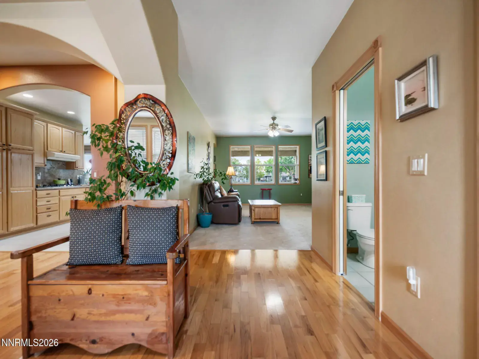 Beautiful Custom Home on the Fairway Welcome to this stunning custom home perfectly situated on the 15th fairway of the Dayton Valley Golf Course. Thoughtfully designed and meticulously maintained, this residence offers both elegance and comfort in every detail. Step inside to find a formal living and dining room, along with a warm and inviting family room featuring a cozy gas fireplace, built-in wine/liquor cabinet, and an entertainment center. The open kitchen is a chef’s delightāboasting natural oak cabinetry, a pantry, granite slab counters, a center island with wine rack, 5 burner cooktop and includes the refrigerator. Hardwood floors flow beautifully through the foyer, hallway, office, dining room, family room, and breakfast nook, while tile flooring accents the kitchen, bathrooms, and laundry room. The spacious primary suite is a true retreat, complete with his and her walk-in closets with custom built-ins, a luxurious jetted tub, separate tile-surround shower, and block glass windows that provide both style and natural light. Natural wood door and window frames, custom draperies, and wood blinds add timeless character throughout.Additional highlights include a finished garage with a full wall of white storage cabinets, utility sink, and water softener. Outside, enjoy a charming tool shed and a raised-bed garden perfect for flowers or vegetables, all while soaking in the serene golf course and mountain views. This home blends refined finishes with practical features, making it a rare gem in the Dayton Valley Golf Course community.