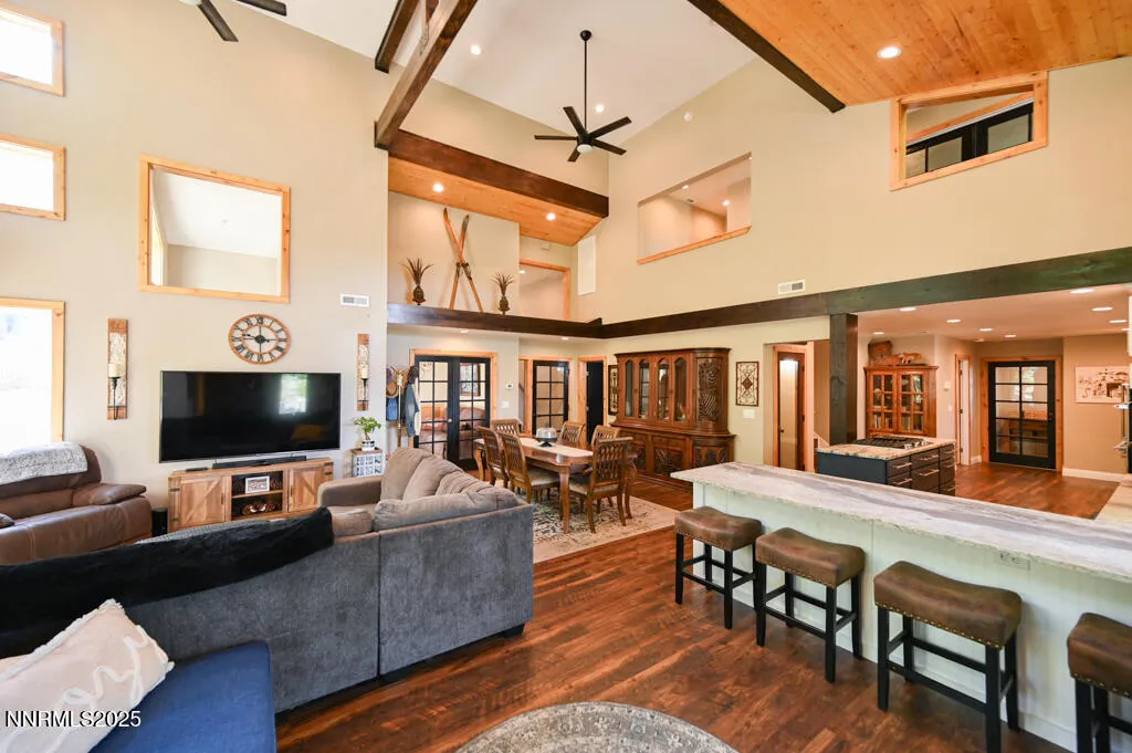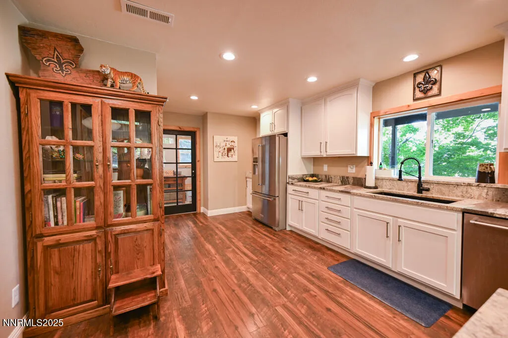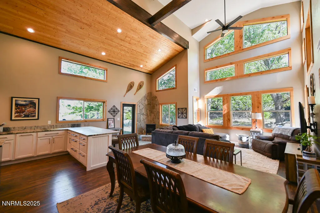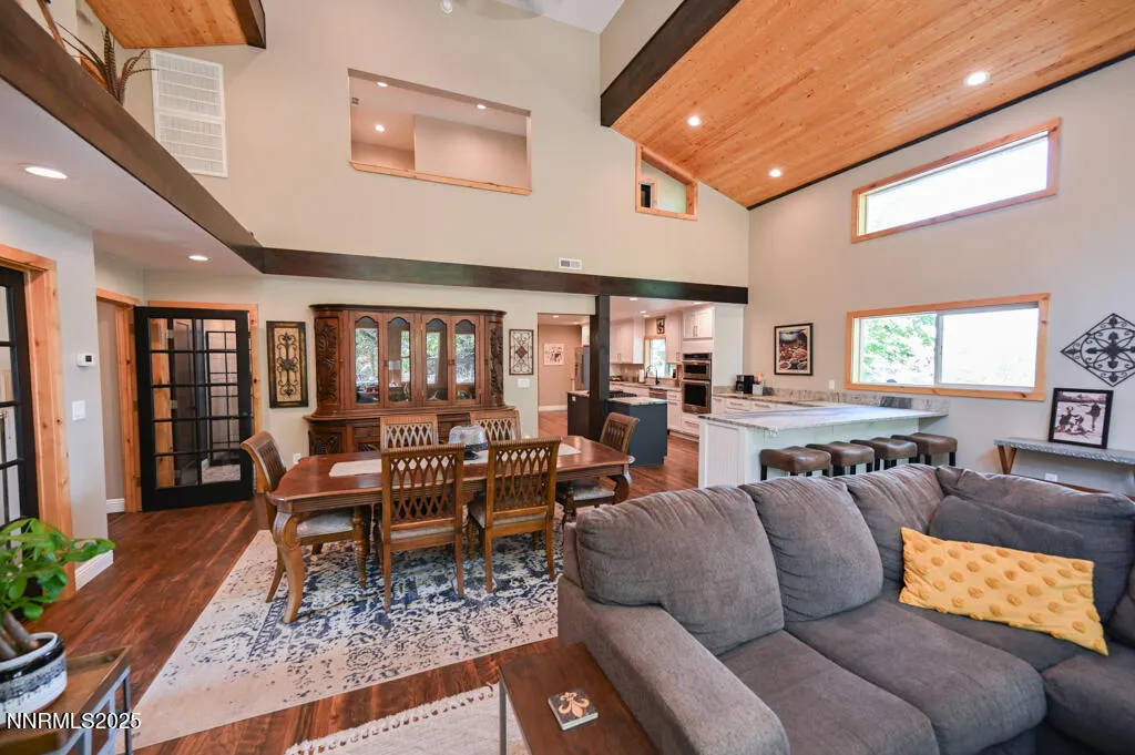 Motivated Seller! Dreaming of mountainside living? Look no further than this unique home nestled amongst the trees in a highly desired foothill neighborhood at the base of the Sierra Nevada Mountains. This elevated, one acre property boasts stunning mountain and valley views in a peaceful setting. The custom home underwent a complete renovation/addition in 2019. Features include: LVP flooring throughout, fully remodeled kitchen and bathrooms, brand new HVAC, double pane vinyl windows and sliders, custom wood window trim and ceilings, Hardie Plank cement siding, and a new roof. Landscaping is a raw canvas awaiting the new owners’ personal touches. Enter the home into a gorgeous great room that encompasses the kitchen, living, and dining rooms. Vaulted ceilings, exposed wood beams, French doors, and beautifully detailed windows allow tons of natural light and mountain vibes. Large open kitchen includes custom cabinetry with abundant storage, leathered granite countertops, cooktop island, peninsula bar seating, stainless steel KitchenAid appliances, and walk in pantry. Also, on the first floor is a bedroom with full en suite bath, laundry room, a versatile flex room that can be a bedroom, office, or sitting room, There is a full bathroom off of the great room that is perfect for guests. Upstairs you will find the spacious primary bedroom retreat with its own private deck. The primary bathroom has a freestanding tub, double vanity, spa-like shower, and a sizeable adjoining closet. Ideal location is 10 minutes to old town Minden with shopping, restaurants, and schools. 15 minutes to Stagecoach/Boulder ski lifts at Heavenly Resort. 20 minutes to Lake Tahoe and Stateline casinos and under an hour to Reno Tahoe International Airport. Don’t miss out on this property! Schedule your showing today. Seller is a licensed Nevada Real Estate agent.