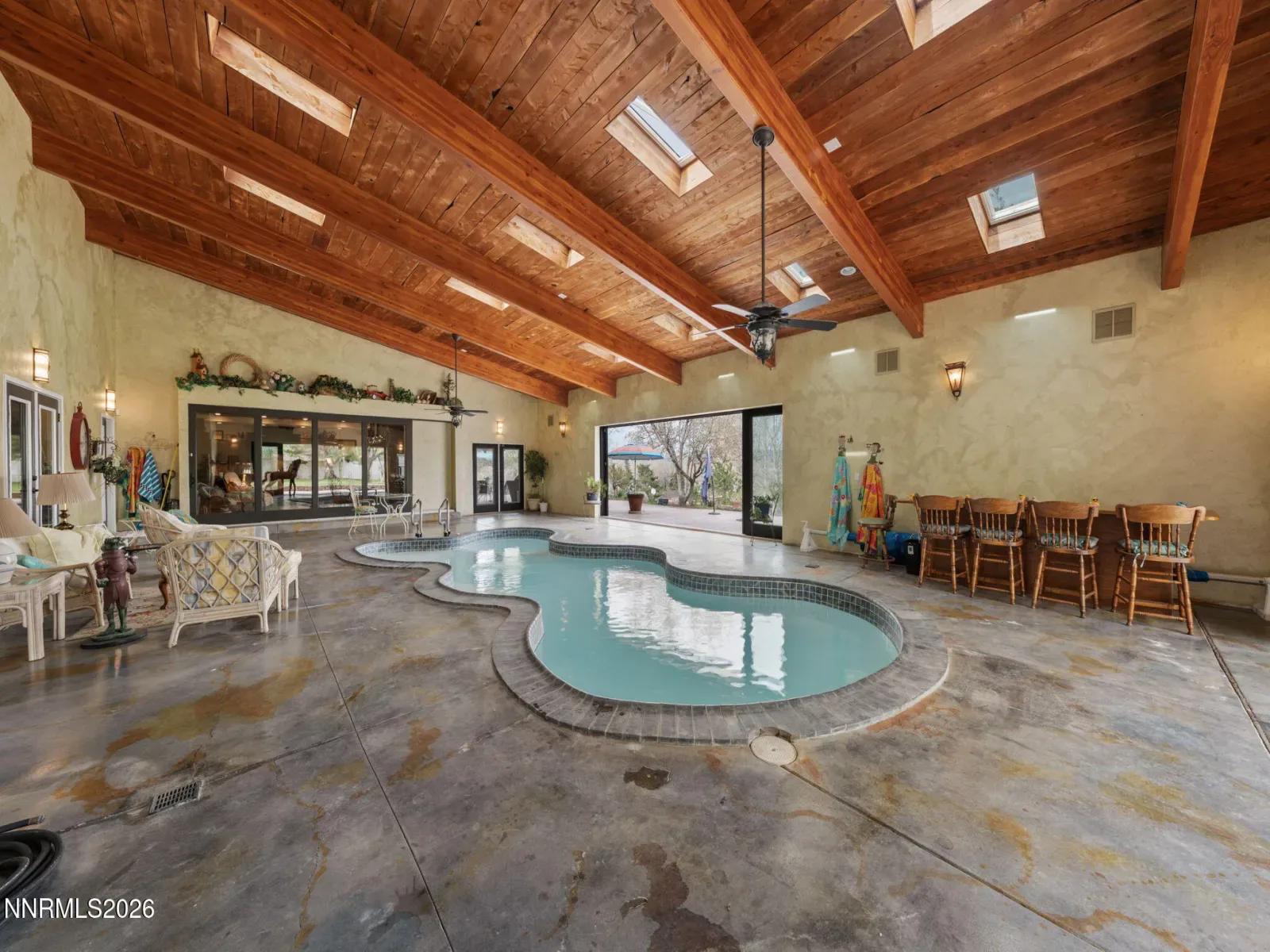 A Rare Gem in the Heart of Carson Valley…Tucked away in a serene, ultra-private setting, this stunning custom estate offers the perfect blend of luxury, comfort, practicality, horse property all within town limits. Thoughtfully designed and meticulously landscaped, perfect for all garden enthusiast, the property unfolds like a personal retreat, with every detail curated to impress and inspire. As you approach, you’re welcomed by lush gardens, mature trees, and a tranquil fountain that sets the tone for this exceptional home. Step inside to find, wood beams that crown the soaring ceilings, complementing the rich textures and refined finishes throughout. Multiple fireplaces create cozy gathering spaces, from the grand living room to the inviting master suite. The chef’s kitchen is a dream come true featuring a massive island, high-end appliances, and a walk-in pantry fit for any culinary enthusiast. The home was designed for both entertaining and everyday comfort, with seamless indoor-outdoor flow. Sweeping views of Carson Valley Golf course while relaxing on the covered patio, complete with a fireplace, ample space to host and ADA accesable. Cool off in the in-ground pool, or warm it up in the hot tub. This one-of-a- kind property also includes a barn, workshop, RV garage, and a spacious three-car garage perfect for hobbyists, collectors, or anyone needing room to roam and store. With every amenity thoughtfully considered, this home truly checks all the boxes. Whether you’re seeking a private sanctuary, an entertainer’s paradise, or a functional family compound, this extraordinary home offers it all and it’s right in town.
