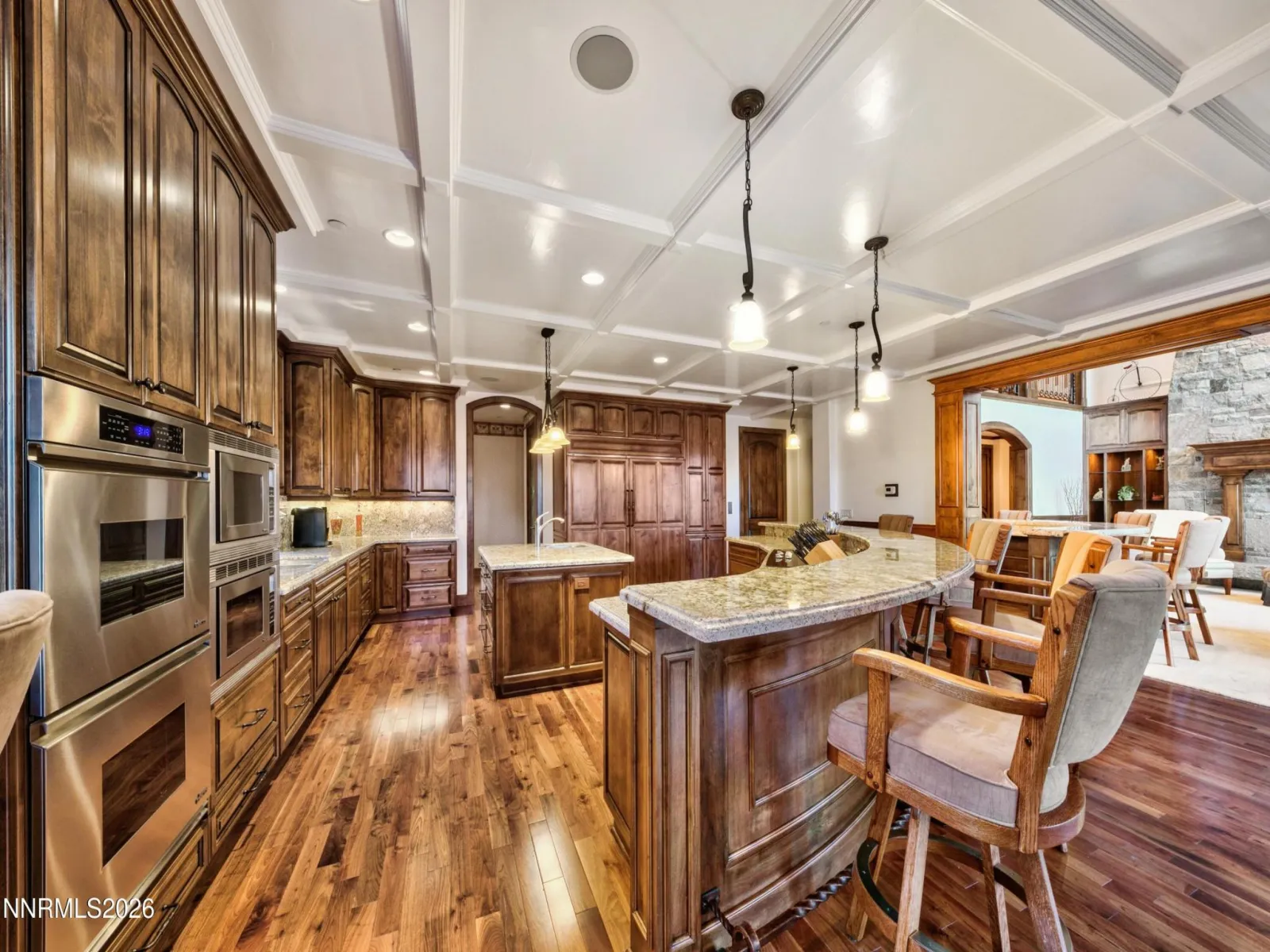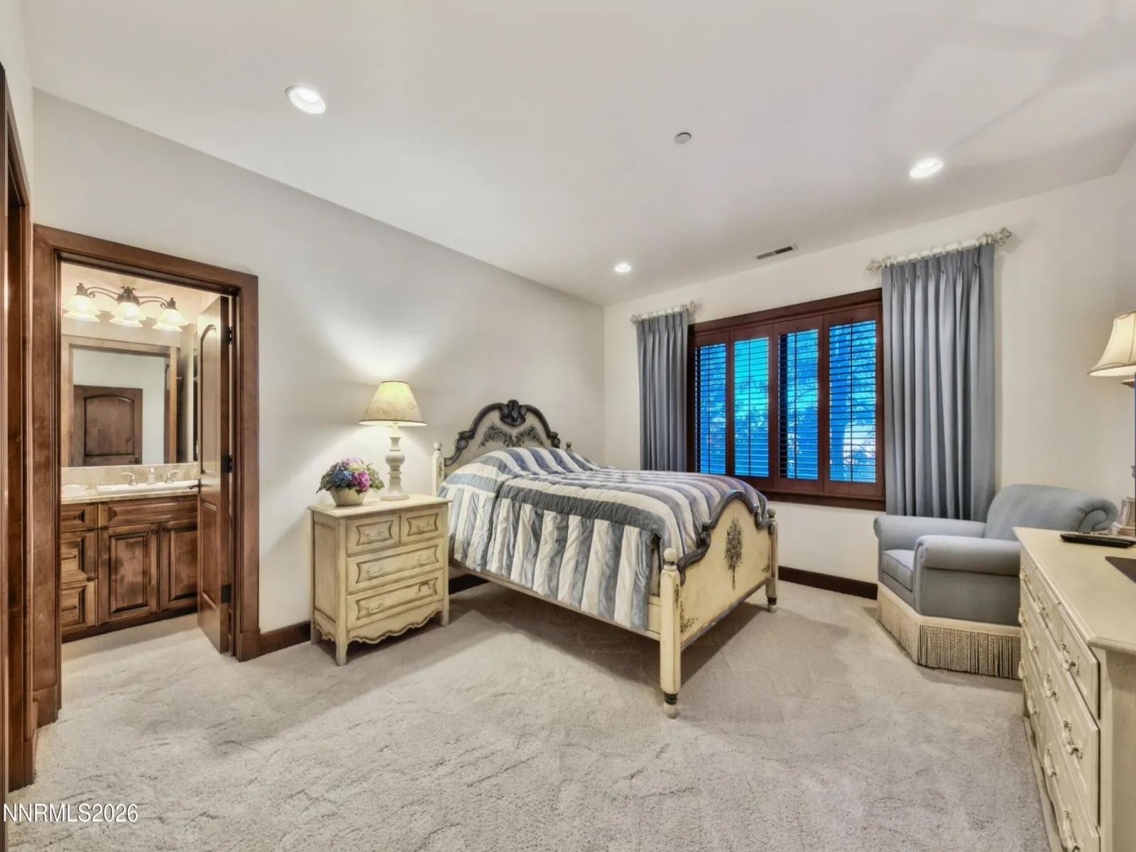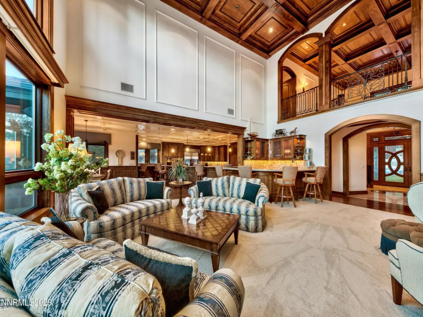 Enjoy a private estate in a prestigious gated community of Jobs Peak Ranch. This beautiful masterpiece is nestled among tall pines with dramatic views of the majestic Sierra Nevada Mountains. Minutes from world-class skiing, golf and beautiful Lake Tahoe, Carson City and Reno. The grand entry with A porte-cochere welcomes you to a stunning grand foyer adorned with dual curved stairways with hand forged iron railings. Tumbled Travertine floor with marble center medallion design. You’ll be captivated by its grandeur and elegance that transitions into a spacious living area, featuring floor-to-ceiling windows, stone fireplace and radiused wet bar. The open-concept design allows for a seamless flow between the living area, dining space, and the gourmet kitchen. The kitchen is a chef’s dream equipped with top-of-the-line stainless steel appliances, clear select alder wood custom cabinets with granite countertops throughout. Large radiused eating bar and island with prep sink. Sub Zero refrigerator and freezer, warming drawer, 2 dishwashers, double ovens and 2 microwaves. Large pantry with custom cabinetry. It also boasts a breakfast bar overlooking the serene landscape with access to a large outdoor deck with built-in BBQ. Remote-control window shades throughout. The 8,158-sq ft of superior construction & design built by Jack Hall Construction. The main floor offers a Master wing downstairs with separate his and hers offices, bathrooms and walk-in closets with built-in dressers. The 2nd floor has 4 bedrooms with full baths and elevator access. Private entrance to guest quarters above the garage with 3 bedrooms and 2 full baths, family room, dining area, game room and laundry. Other notable features include imported hand chiseled stone architectural features, elevator, Pella triple pane windows with blinds, high efficiency foam insulation, fully fire sprinklered, fully wired for home automation. The emergency backup generator powers the entire house. An oversized 4-car garage. This exceptional property offers a rare blend of luxury, privacy, and natural beauty, nestled within one of the region’s most coveted gated communities.