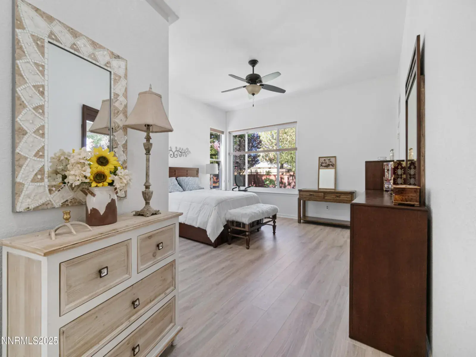 Custom Quality Home. Pleasantview neighborhood. Single story split floor plan, formal entry, wide hallways. Outstanding window coverings. Gorgeous Hickory wood floors. Formal dining room features electric fireplace. Spacious Primary Suite with large jetted tub and a separate tile shower, double sinks, two large walk in closets and a safe. Two additional bedrooms on the opposite home side A 3 car finished garage, includes insulated doors, single side has air conditioning, fan, TV, Telephone hook ups. RV parking storage with a wide gate and hookups. Professional landscaping front and rear with drip irrigation. Private back yard with a lattice patio, shade screen, a Rose Garden and small grass area. Also raised vegetable beds. NO HOA. Immaculate home. This spacious home features a gas log fireplace in the living area for cozy seating. A wall mounted TV with surround sound / outdoor patio speakers. Bar with wine rack, refrigerator and dry sink. Kitchen has ceramic cook-top, built in stainless microwave & oven, french door refrigerator/ bottom freezer. A Garden window with high rise faucet, sink with a cutting board. Loads of beautiful cabinets with slide out shelves. Instant hot water is also featured. Large laundry room with great folding area. House wired for security system. Truly a dream come true home. No state income tax in Nevada. Just 50 miles to Reno Tahoe International Airport. World class Snow Skiing just up the mountains. Local hiking, mountain bike trails, parks, superior Library services, Historical Museums and Douglas Community Center & Senior Center all nearby.