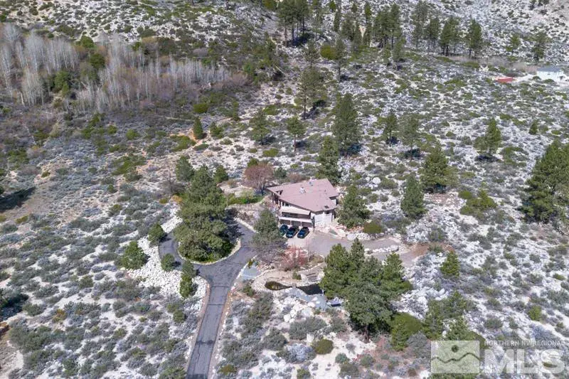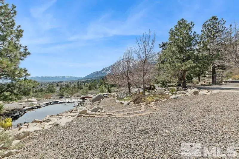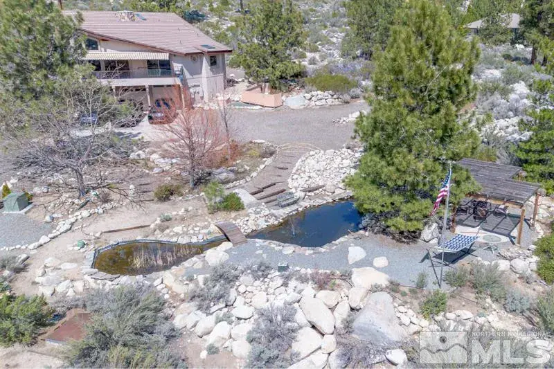 Welcome home to your private oasis on 5.45 acres! Backing up to National Forest, no HOA. This home is ADA friendly. With an electric chair lift to either floor. Driving up your private driveway. You’re greeted with two ponds filled with goldfish. A large waterfall and creek. The circular courtyard features grass and two pine trees over 150 ft high. Three weddings have been held there. The front of the home is artfully landscaped with beautiful flowers, trees and rose bushes. Once in the front door.,   The grand entry features beautiful granite/marble flooring & a large rock wall. 360° views of Carson Valley & the Sierra Mountains surround the home. Take in the beautiful views & serene sound of the cascading waterfall from the deck. Outside the master bedroom or the great room. The master bathroom has a full jacuzzi tub with private views of the Carson Valley. Conduct business in private study/library. Home includes a full security system. Original Architectural plans are available to the purchaser.