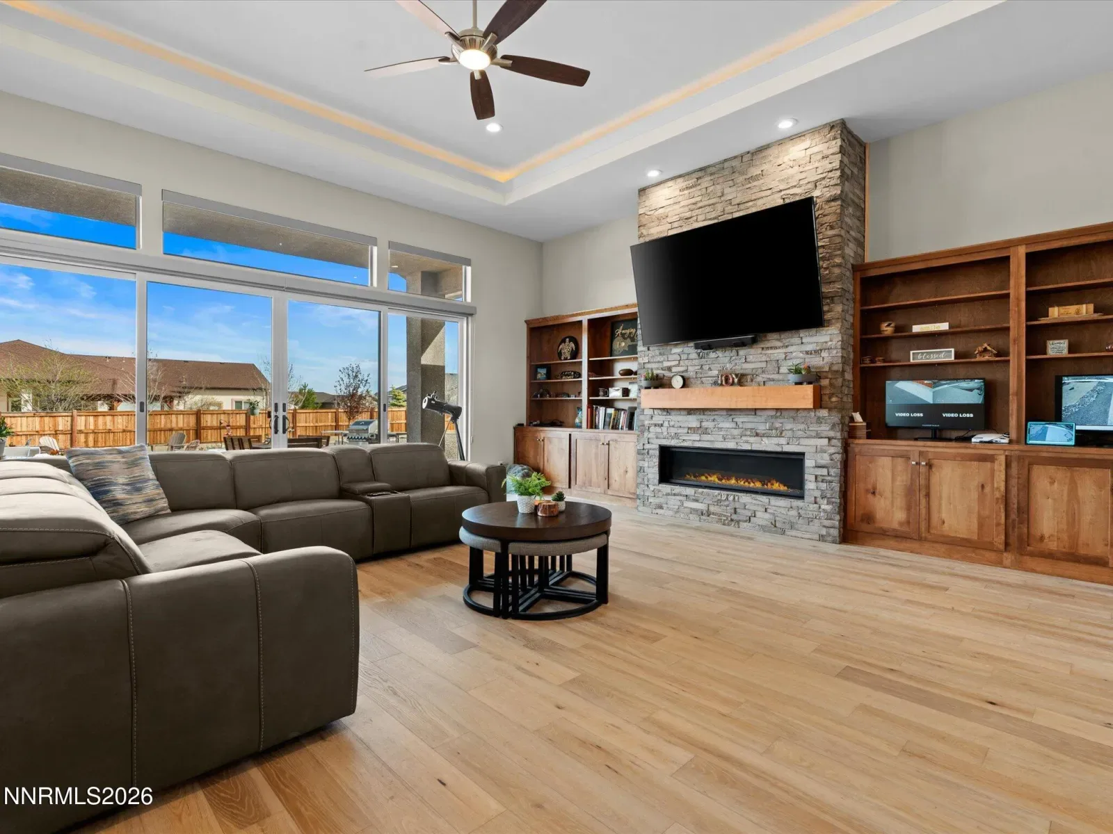 Quality-built custom home in Rain Shadow Estates featuring high-end finishes, thoughtful design, and extensive upgrades throughout. Situated on over half an acre, this property offers a spacious setting with room for additional improvements while maintaining a clean, well-designed landscape. The exterior showcases stucco construction with natural stone accents, a paver driveway, and professionally designed landscaping that complements the surrounding mountain setting. The backyard features an extended paver patio with a custom heart-shaped design, open sky views, and ample space for future additions such as a large lap pool, detached garage, or expanded outdoor living area. Inside, the home features European burnt oak hardwood flooring, upgraded hand-troweled wall texture, custom cabinetry, and built-in storage in the great room surrounding a natural stone fireplace. The open layout offers comfortable living spaces with attention to detail throughout. The kitchen is well appointed with quartz countertops, tile backsplash, double ovens, built-in refrigerator, upgraded appliances, a large walk-in pantry, and generous workspace for cooking and entertaining. A spacious laundry room provides additional storage and functionality. Bathrooms include upgraded tile finishes consistent with the quality found throughout the home. Garage space is exceptional, featuring a finished 44-foot deep RV garage in addition to an oversized two-car garage, along with additional RV parking on the side of the home. The garage also includes custom built-in cabinetry, water softener system, and an extensive whole-home generator installed in 2026. The floor plan offers excellent separation of living areas, with a private primary suite and additional bedrooms positioned for flexibility of use. Located in Rain Shadow Estates, this property offers custom construction, upgraded materials, generous lot size, and a newer custom home setting in the Carson Valley area.