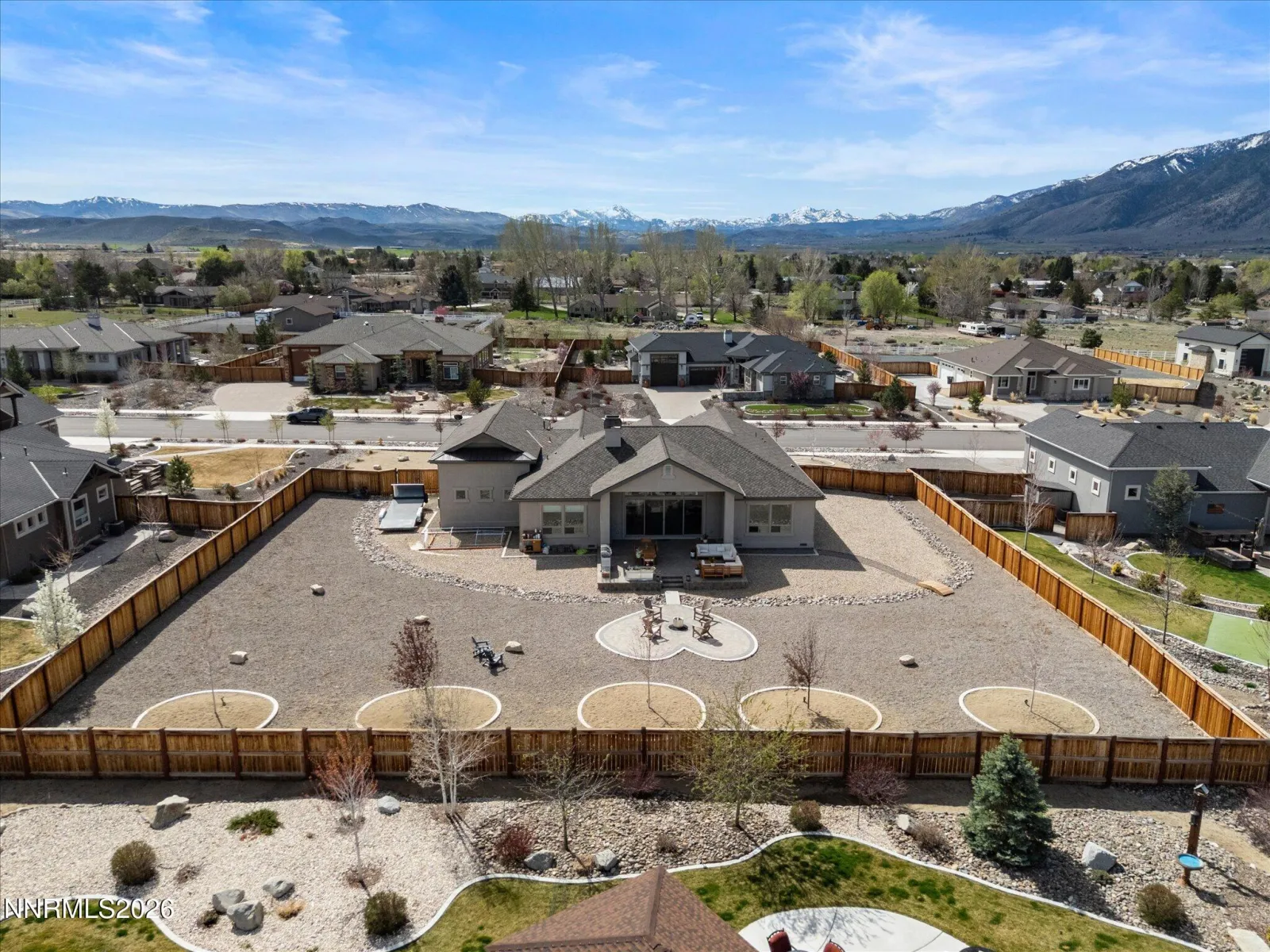 Quality-built custom home in Rain Shadow Estates featuring high-end finishes, thoughtful design, and extensive upgrades throughout. Situated on over half an acre, this property offers a spacious setting with room for additional improvements while maintaining a clean, well-designed landscape. The exterior showcases stucco construction with natural stone accents, a paver driveway, and professionally designed landscaping that complements the surrounding mountain setting. The backyard features an extended paver patio with a custom heart-shaped design, open sky views, and ample space for future additions such as a large lap pool, detached garage, or expanded outdoor living area. Inside, the home features European burnt oak hardwood flooring, upgraded hand-troweled wall texture, custom cabinetry, and built-in storage in the great room surrounding a natural stone fireplace. The open layout offers comfortable living spaces with attention to detail throughout. The kitchen is well appointed with quartz countertops, tile backsplash, double ovens, built-in refrigerator, upgraded appliances, a large walk-in pantry, and generous workspace for cooking and entertaining. A spacious laundry room provides additional storage and functionality. Bathrooms include upgraded tile finishes consistent with the quality found throughout the home. Garage space is exceptional, featuring a finished 43-foot deep RV garage in addition to an oversized two-car garage, along with additional RV parking on the side of the home. The garage also includes custom built-in cabinetry, water softener system, and an extensive whole-home generator installed in 2026. The floor plan offers excellent separation of living areas, with a private primary suite and additional bedrooms positioned for flexibility of use. Located in Rain Shadow Estates, this property offers custom construction, upgraded materials, generous lot size, and a newer custom home setting in the Carson Valley area.