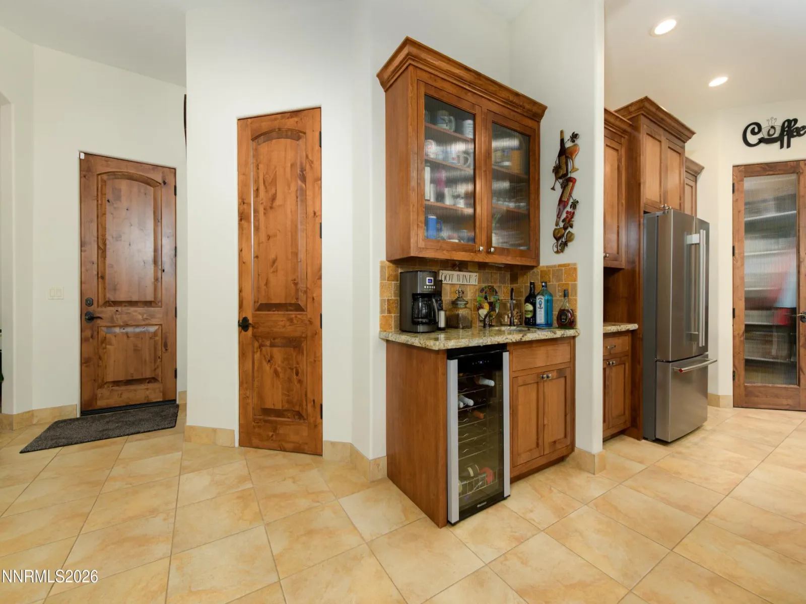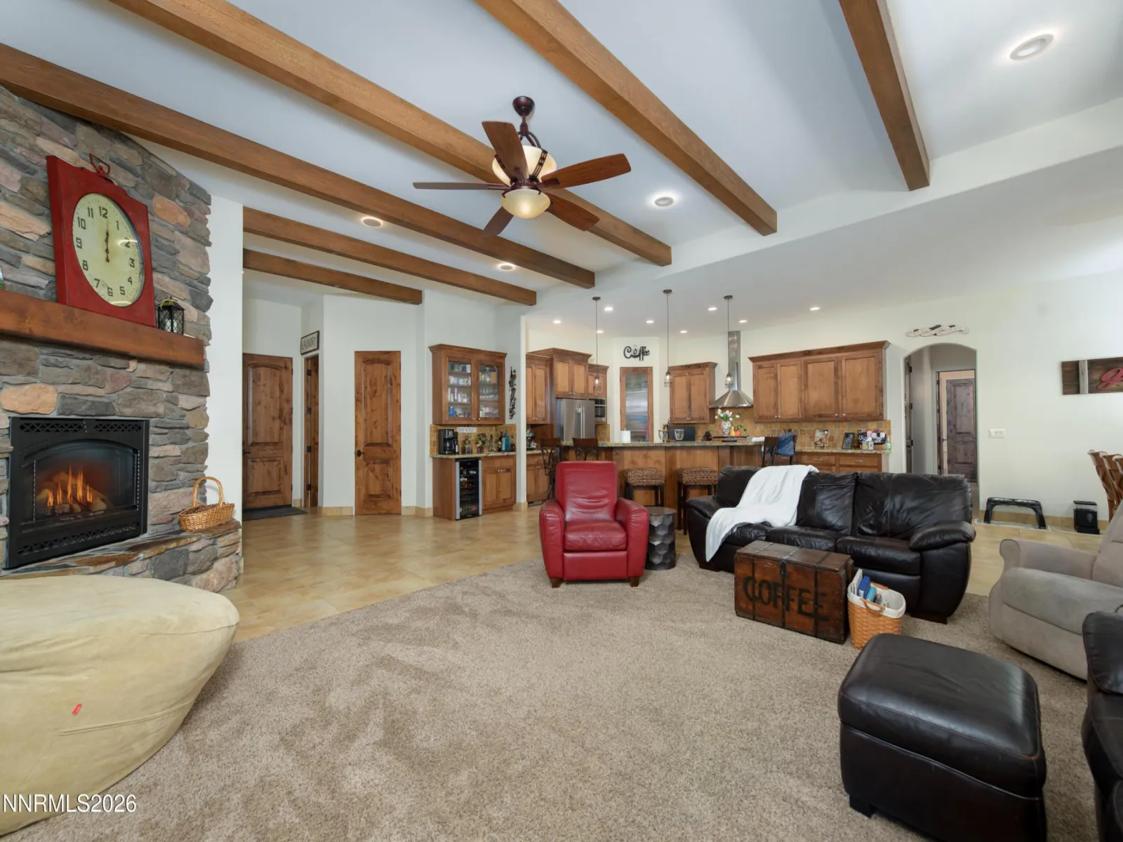 Experience the pinnacle of Rocky Terrace living in this masterfully crafted 2,732 sq. ft. estate, where a “no-expense-spared” philosophy meets timeless elegance. The home’s heart is a breathtaking great room anchored by 10-12′ ceilings, massive rustic beams, and a floor-to-ceiling gas log masonry fireplace. Every inch reflects uncompromising quality, from the 8′ solid alder doors and coffered ceilings to the old-world drywall finishes and rich travertine flooring. The kitchen is a masterpiece featuring custom alder cabinetry, granite counters, a dedicated wine fridge, and breakfast bar. Top-tier appliances replaced just one year ago include a dual-fuel gas stovetop with an electric rotisserie/convection oven and a matching convection microwave. Elevate the atmosphere with integrated mood lighting throughout the great room, primary suite, and hallways. Step outside to a private oasis where the landscape serves as a masterpiece. Surrounded by premium pavers and professionally landscaped grounds, the rear patio offers a covered, unobstructed, front-row seat to the majesty of Job’s Peak. The expansive views of the Sierra Nevada create a peaceful sanctuary. Beyond the aesthetics, the home is engineered for maximum performance and efficiency. 1,251 sq. ft. fully finished 4-car garage, ideal for enthusiasts. High-efficiency 3-multi-zoned HVAC, upgraded insulation, and a 50-year roof. 75-gallon water heater featuring a recirculating hot water system for immediate comfort. Located in the highly sought-after Rocky Terrace subdivision, this home offers a quiet, established residential character just minutes from the heart of Gardnerville and approximately 20 minutes from world-class recreation of South Lake Tahoe & Heavenly Ski Resort, 45 Minutes to Reno, and 25 minutes to Hope Valley, Ca for the abundance of recreational activities.