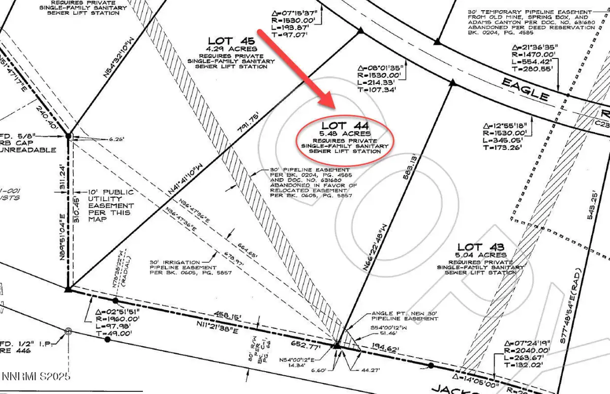 5.48 acres, lot 44, has great views and is minimally sloped resulting in lower excavation costs. Sewer lift station required.