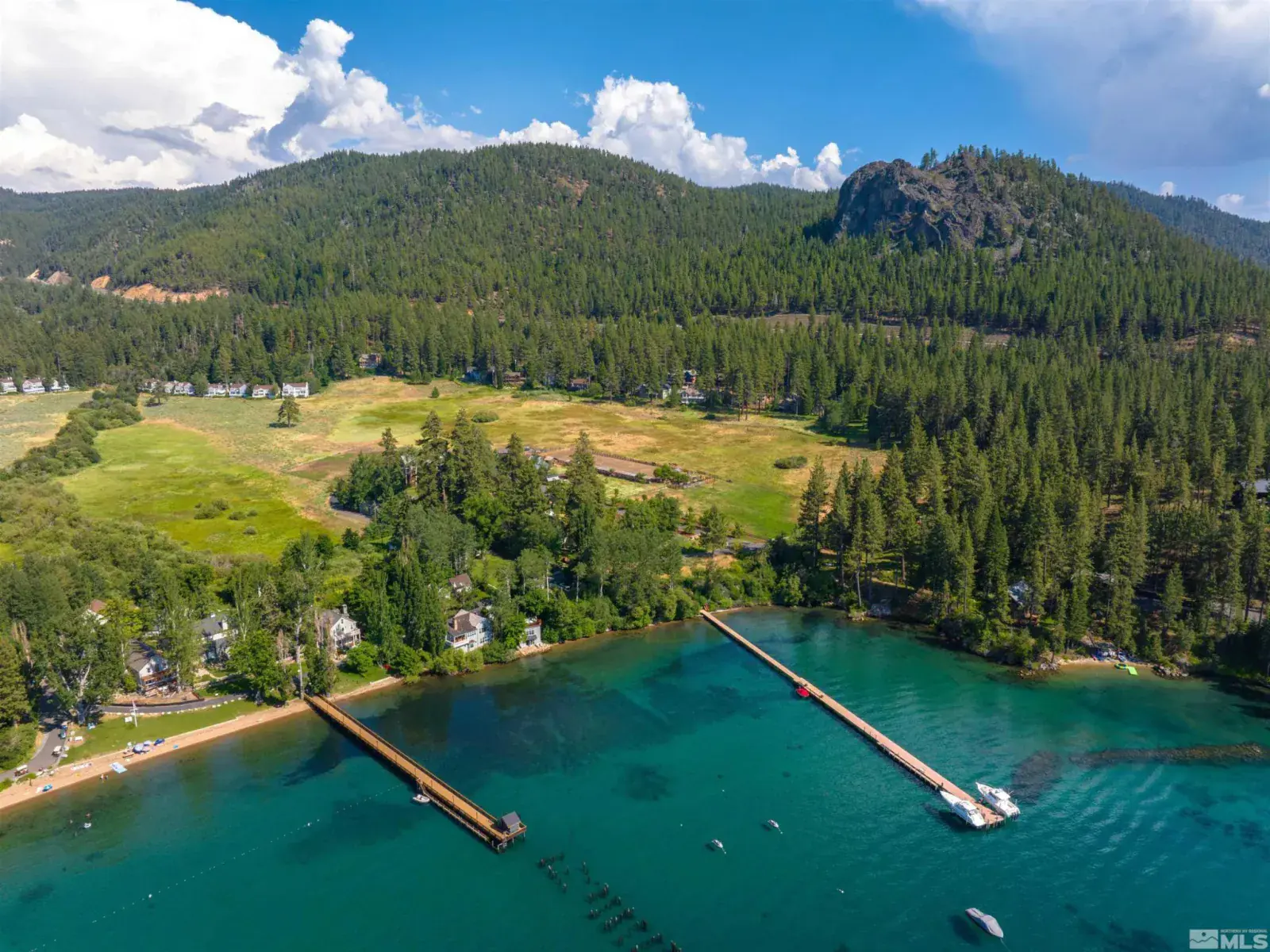 Shakespeare Shores is a rare opportunity to own one of three lakefront parcels within the iconic Shakespeare Ranch Properties, located in historic Glenbrook, NV-Lake Tahoe’s only gated lakeside golf course community. This gem features rare lakefront amenities with 139′ of lake frontage, sandy beach, access to a 465 ft. pier-one of the longest private deep water piers on Lake Tahoe, a buoy and approved plans for a lakeside cabana with rooftop deck. The opportunities to personalize this property are endless!, The approximately 1.2 acre property is zoned for five or more houses and currently has six historic cabins built in 1900 offering redevelopment potential. There is a total of 2,871 sq ft of living space with six bedrooms, six bathrooms, five kitchens or kitchenettes, four living areas, one enclosed porch, and five decks. In a world where opportunities like this are few and far between, it’s a once-in-a-lifetime chance to build your dream within the legacy Shakespeare Ranch Properties inside historic Glenbrook in tax-friendly Nevada. This property is not in the Glenbrook Homeowners Association, however, owners inside Glenbrook have the right to join the Glenbrook Golf and Tennis Clubs which includes a 9-hole course, clubhouse and tennis courts. The adjoining lakefront parcel, 1951 Glenbrook Road, MLS #268410 is available to purchase combining two parcels with a total of 2.74 AC for $35,000,000.