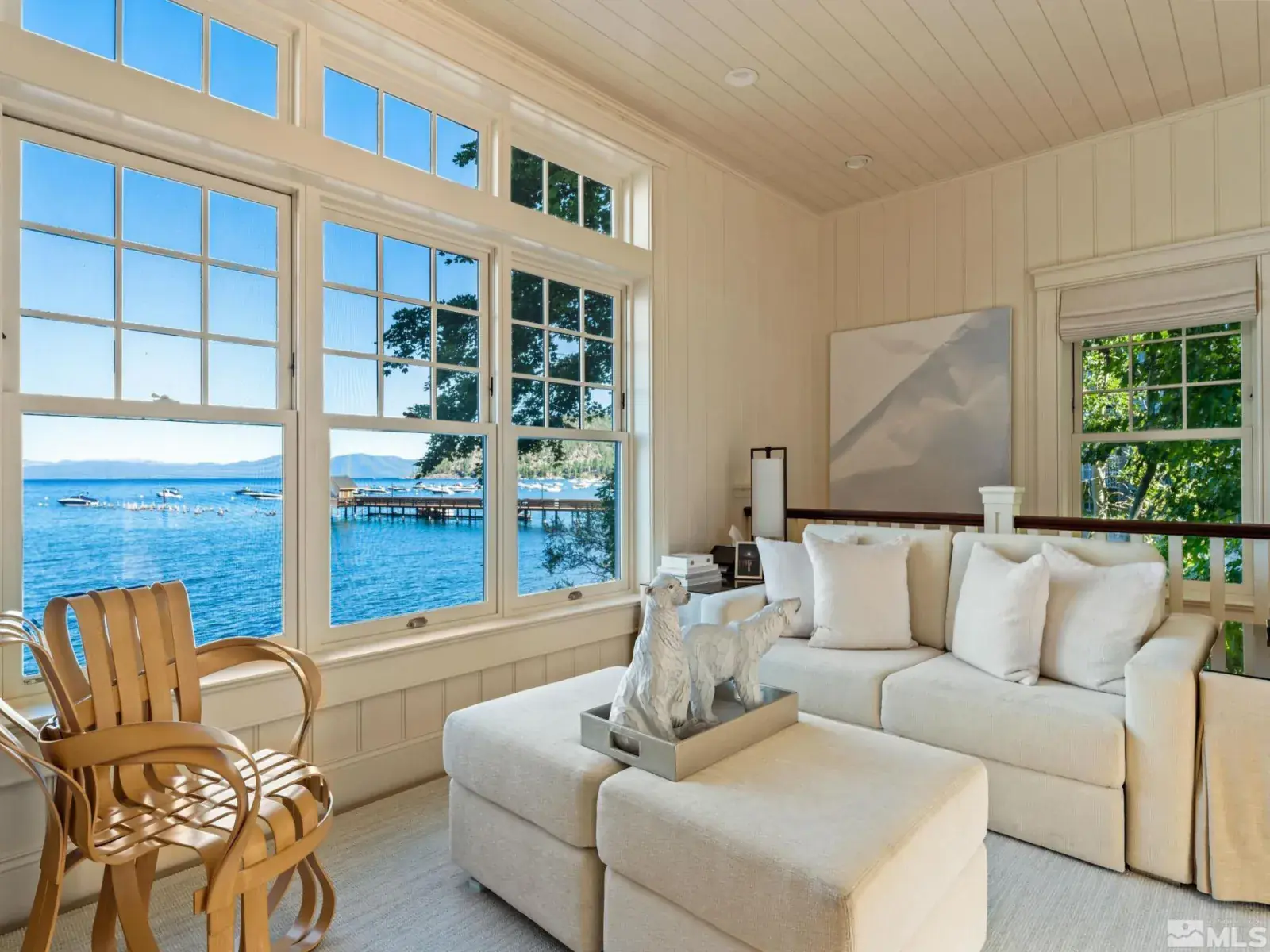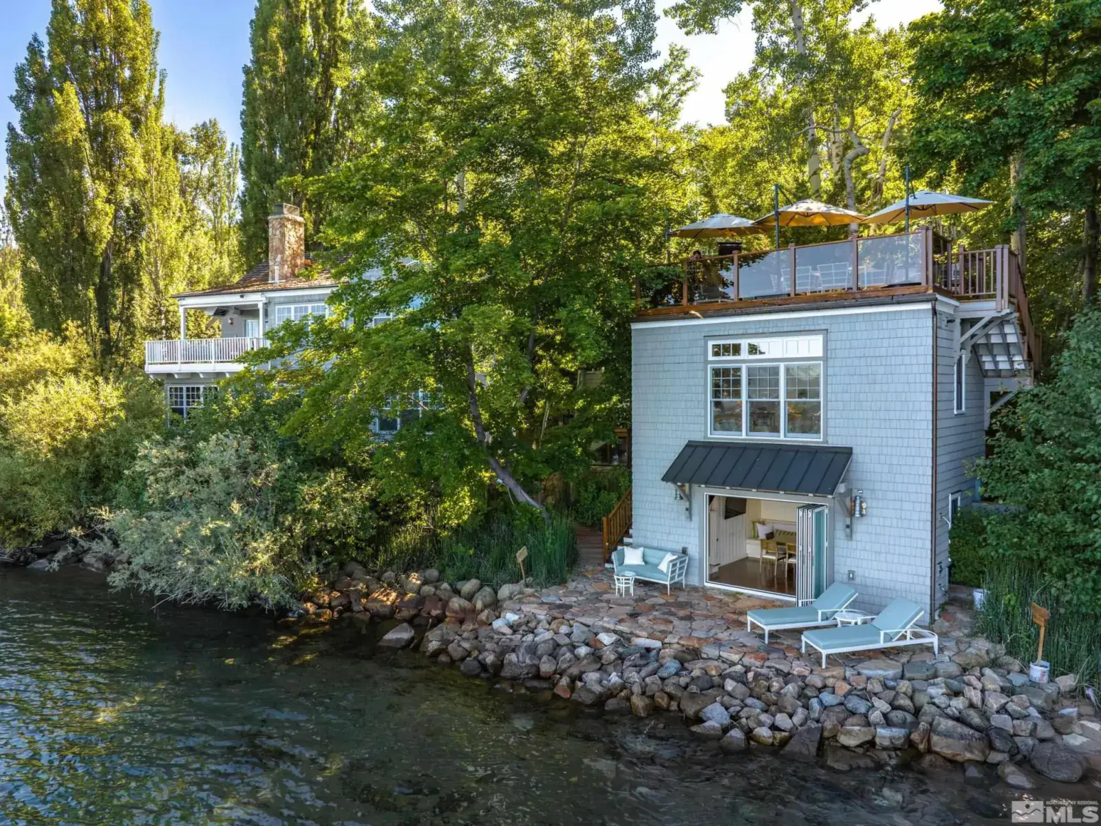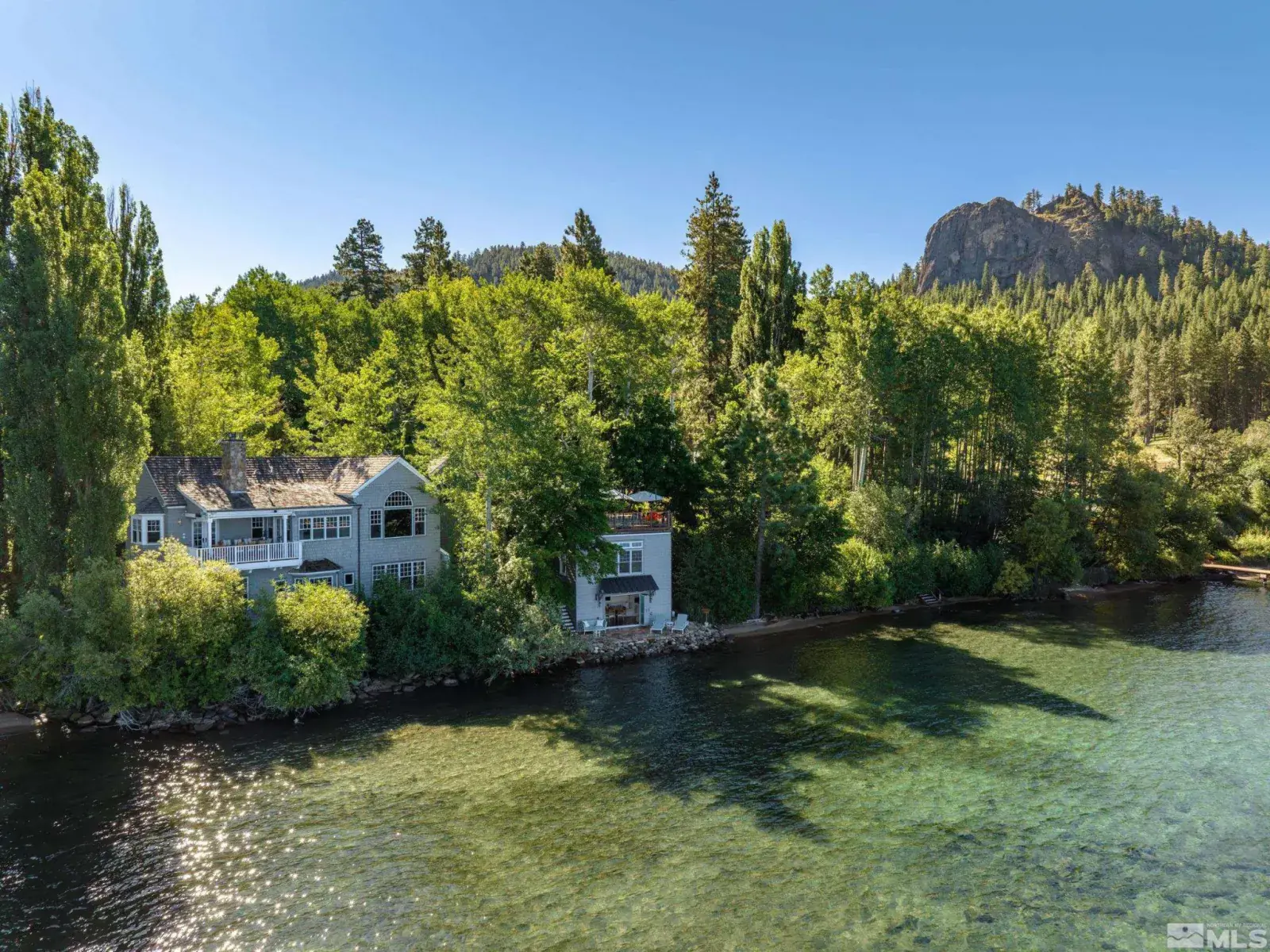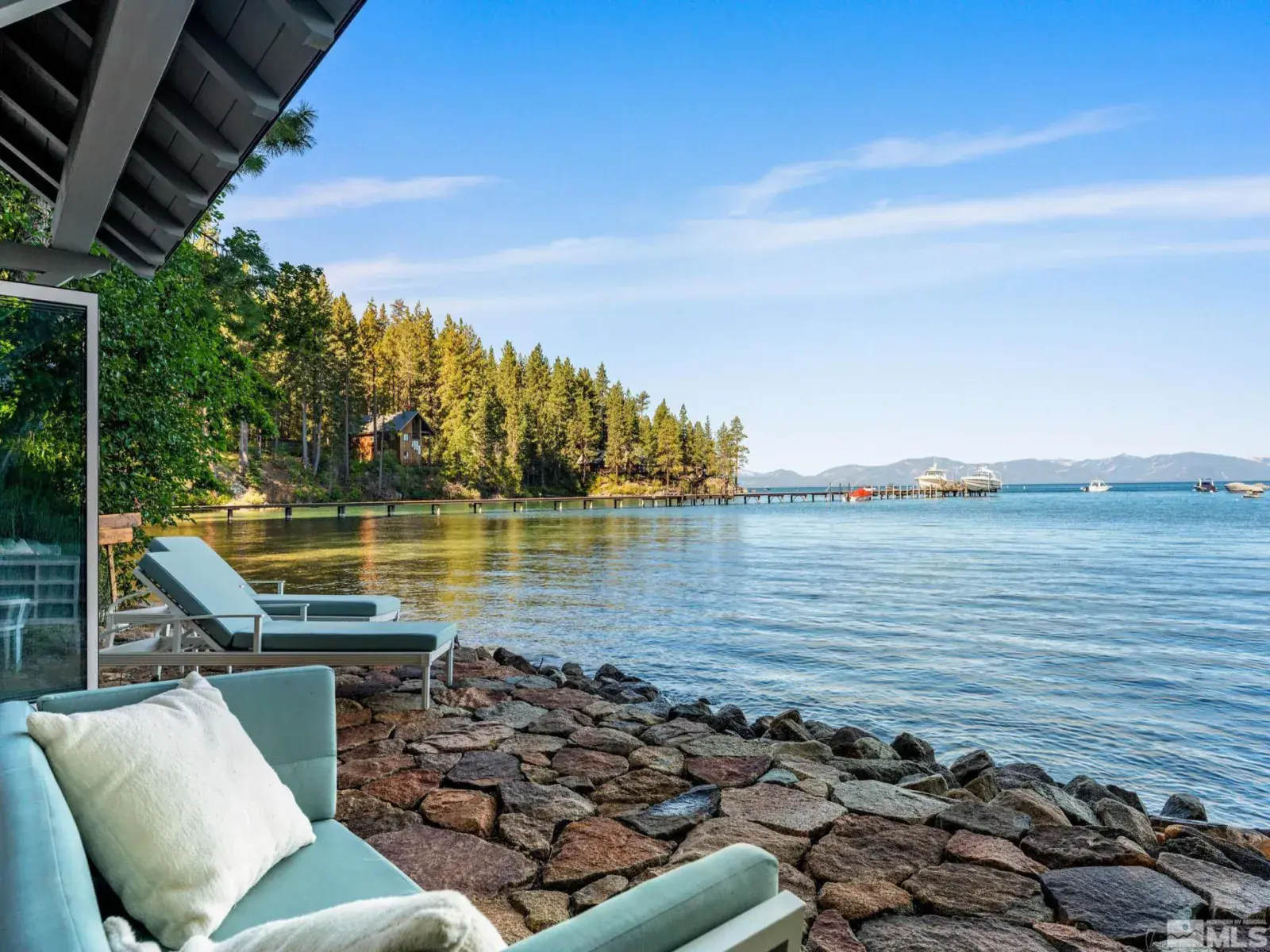 Water’s Edge is an extraordinary lakefront retreat nestled within the exclusive gates of the iconic Shakespeare Ranch Properties in historic Glenbrook, NV-Lake Tahoe’s only gated lakeside golf course community. Designed in a New England style, this beautifully appointed residence with lakeside cabana sits directly on the water’s edge with panoramic views of Lake Tahoe and the Sierra. Access to the 465 ft. pier, one of the longest in Lake Tahoe, with buoy makes this rare lakefront the ultimate perfection!, A luxurious 690 sq. ft. two-story lakeside cabana, seamlessly connects the main house by a wrap-around teak deck. The cabana has a stunning rooftop deck, sitting room, and wet bar – it’s the perfect space for entertaining or relaxing while tipping your toes in the water. The 4,150 square foot main residence on .71 acres with 174 linear feet of lake frontage features three private en-suite bedrooms, a media room/office, living room, formal dining, 2-car garage and multiple patios, covered and undercovered. The living room, formal dining room, and kitchen flow together within an expanding space featuring exposed beams and trusses. Expansive windows showcase where the crystal-clear waters meet the horizon in a mesmerizing dance of light and tranquility. Adjacent to the cozy breakfast nook, a charming covered porch offers a peaceful spot for morning coffee providing a connection to the serene lakeside surroundings. Water’s Edge is not just a home – It’s a lifestyle offering a rare opportunity to live in harmony with nature while enjoying the finest comforts of modern living in tax-friendly Nevada. This property is NOT in the Glenbrook Homeowners Association. Residents of the Glenbrook community have the option to join the Glenbrook Golf and Tennis Clubs which includes a 9-hole course, clubhouse and tennis courts.