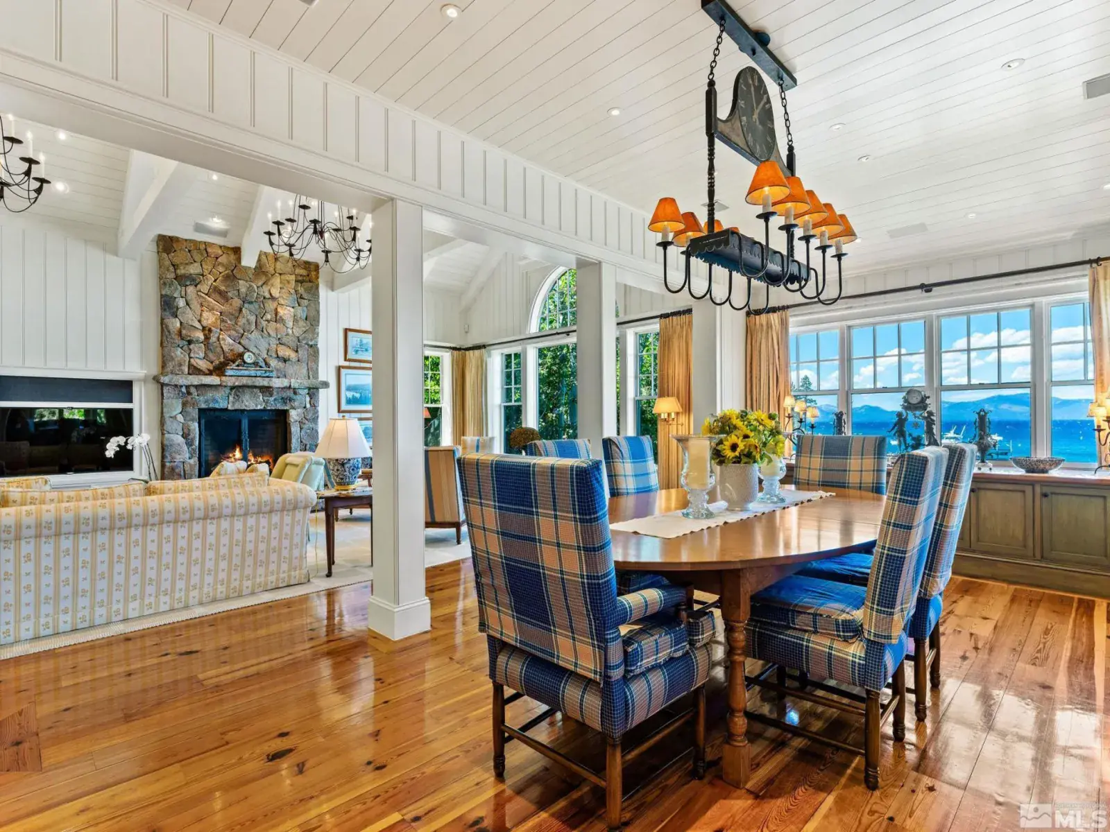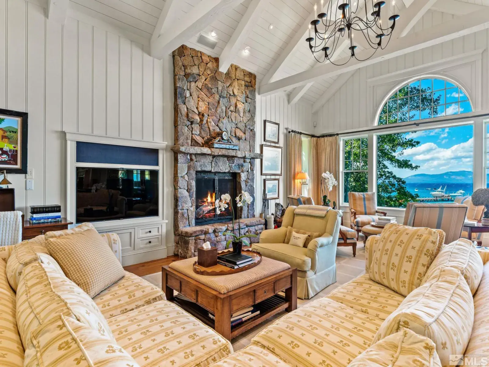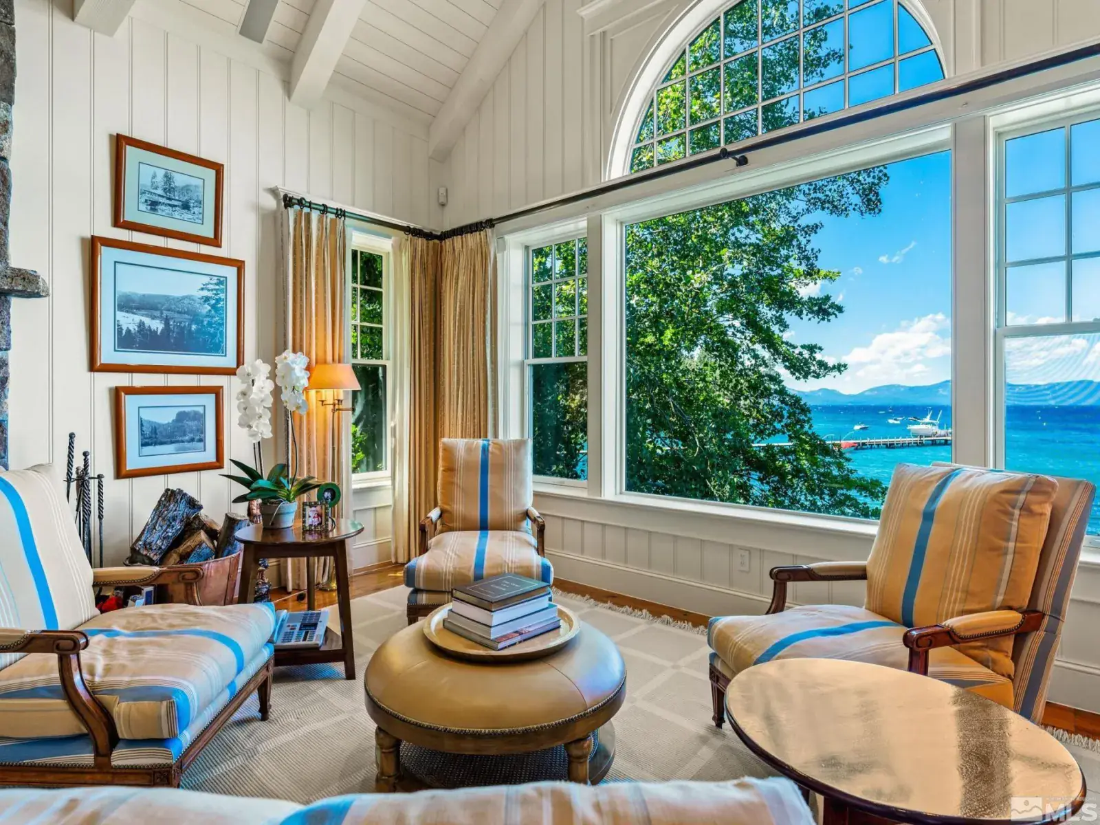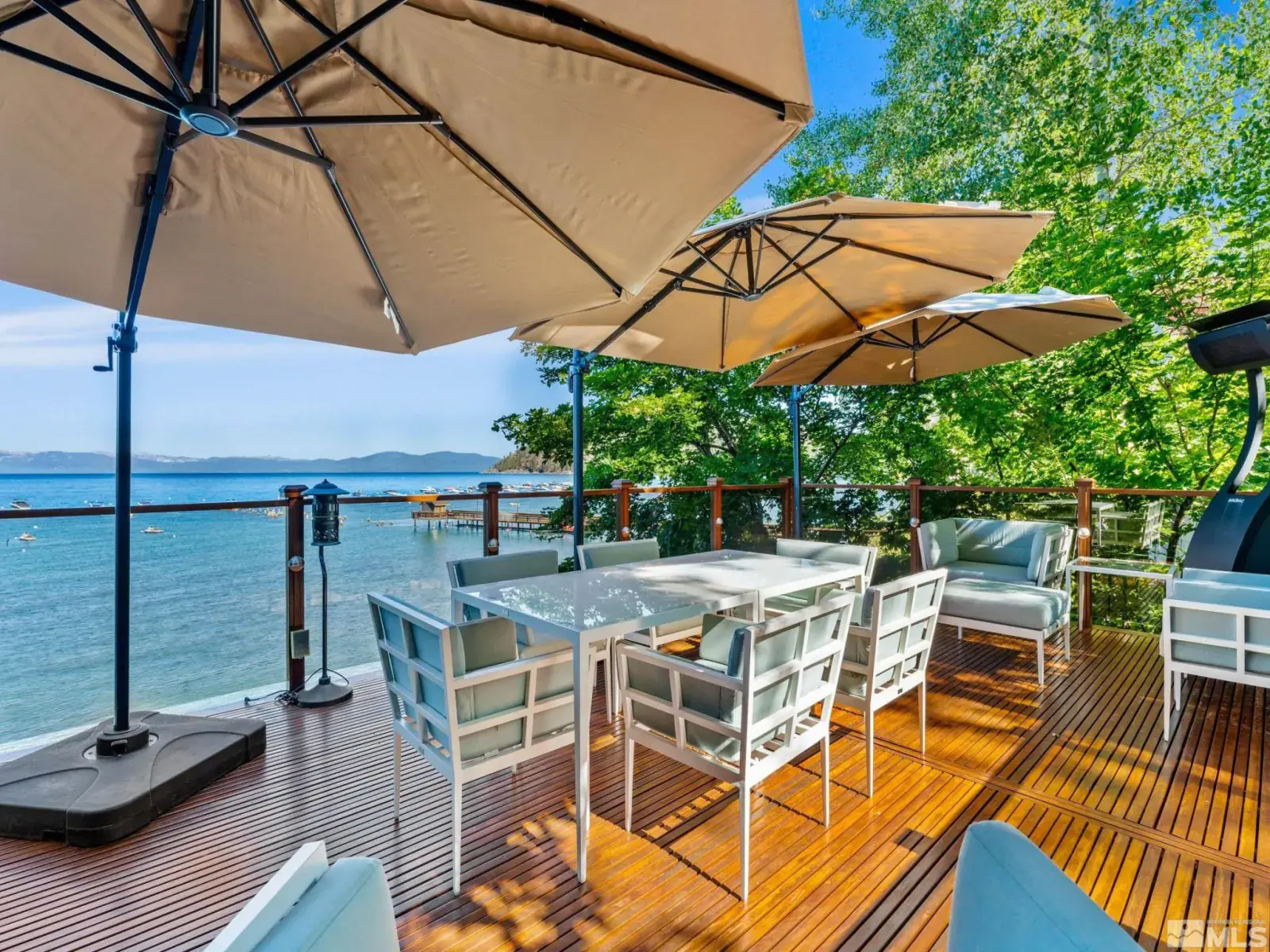 Water’s Edge is an extraordinary lakefront retreat nestled within the exclusive gates of the iconic Shakespeare Ranch Properties in historic Glenbrook, NV-Lake Tahoe’s only gated lakeside golf course community. Designed in a New England style, this beautifully appointed residence with lakeside cabana sits directly on the water’s edge with panoramic views of Lake Tahoe and the Sierra. Access to the 465 ft. pier, one of the longest in Lake Tahoe, with buoy makes this rare lakefront the ultimate perfection!, A luxurious 690 sq. ft. two-story lakeside cabana, seamlessly connects the main house by a wrap-around teak deck. The cabana has a stunning rooftop deck, sitting room, and wet bar – it’s the perfect space for entertaining or relaxing while tipping your toes in the water. The 4,150 square foot main residence on .71 acres with 174 linear feet of lake frontage features three private en-suite bedrooms, a media room/office, living room, formal dining, 2-car garage and multiple patios, covered and undercovered. The living room, formal dining room, and kitchen flow together within an expanding space featuring exposed beams and trusses. Expansive windows showcase where the crystal-clear waters meet the horizon in a mesmerizing dance of light and tranquility. Adjacent to the cozy breakfast nook, a charming covered porch offers a peaceful spot for morning coffee providing a connection to the serene lakeside surroundings. Water’s Edge is not just a home – It’s a lifestyle offering a rare opportunity to live in harmony with nature while enjoying the finest comforts of modern living in tax-friendly Nevada. This property is NOT in the Glenbrook Homeowners Association. Residents of the Glenbrook community have the option to join the Glenbrook Golf and Tennis Clubs which includes a 9-hole course, clubhouse and tennis courts.
