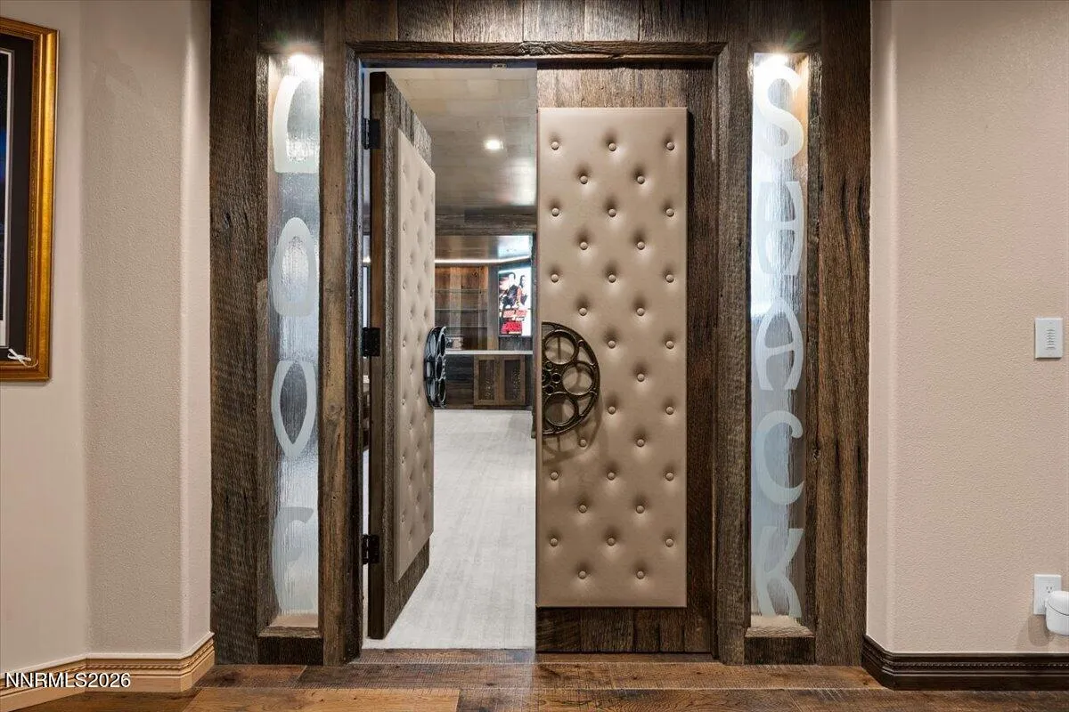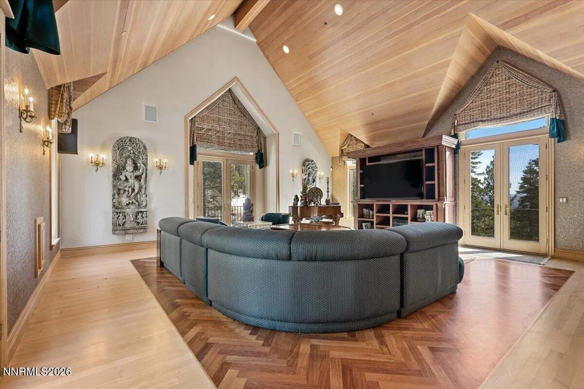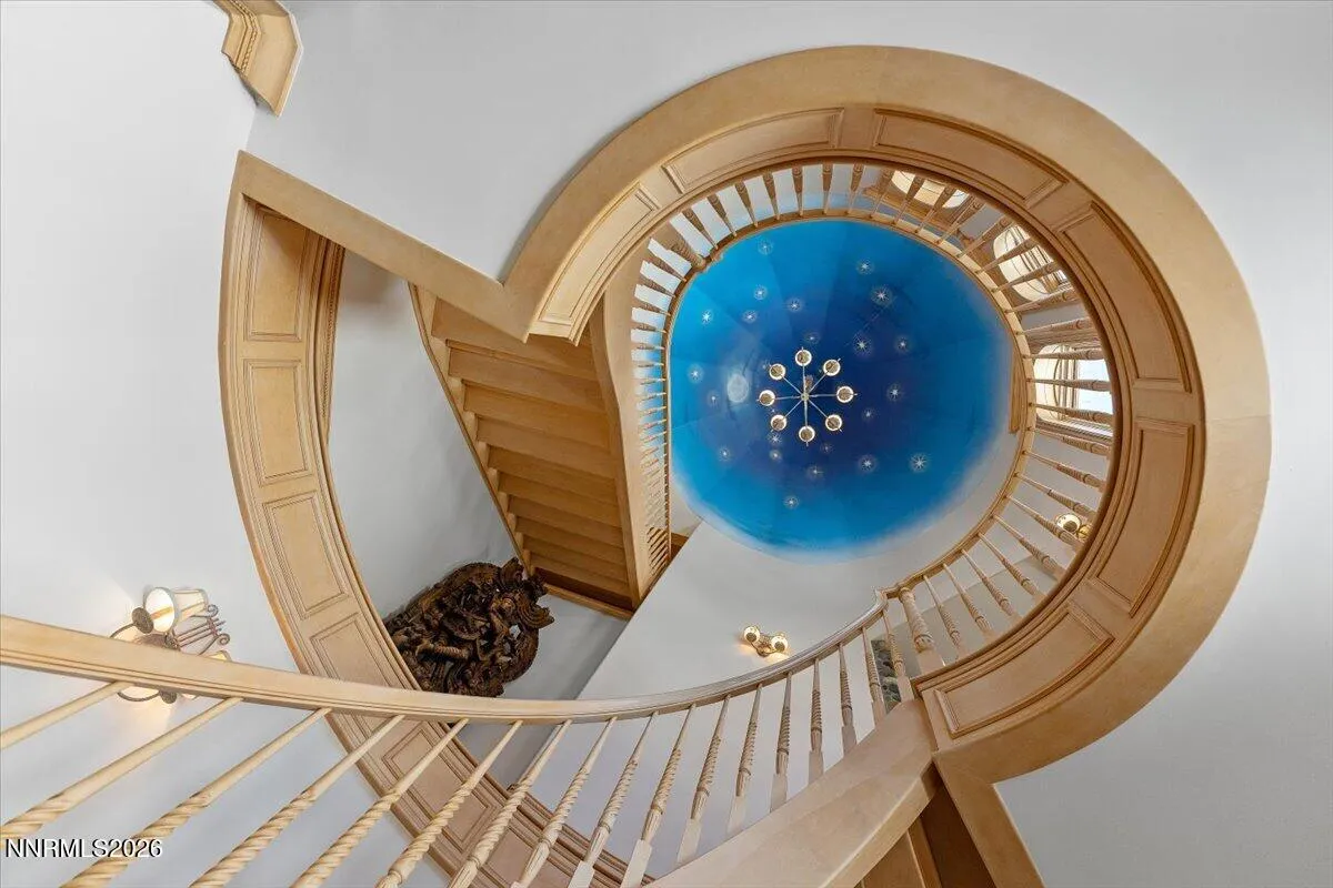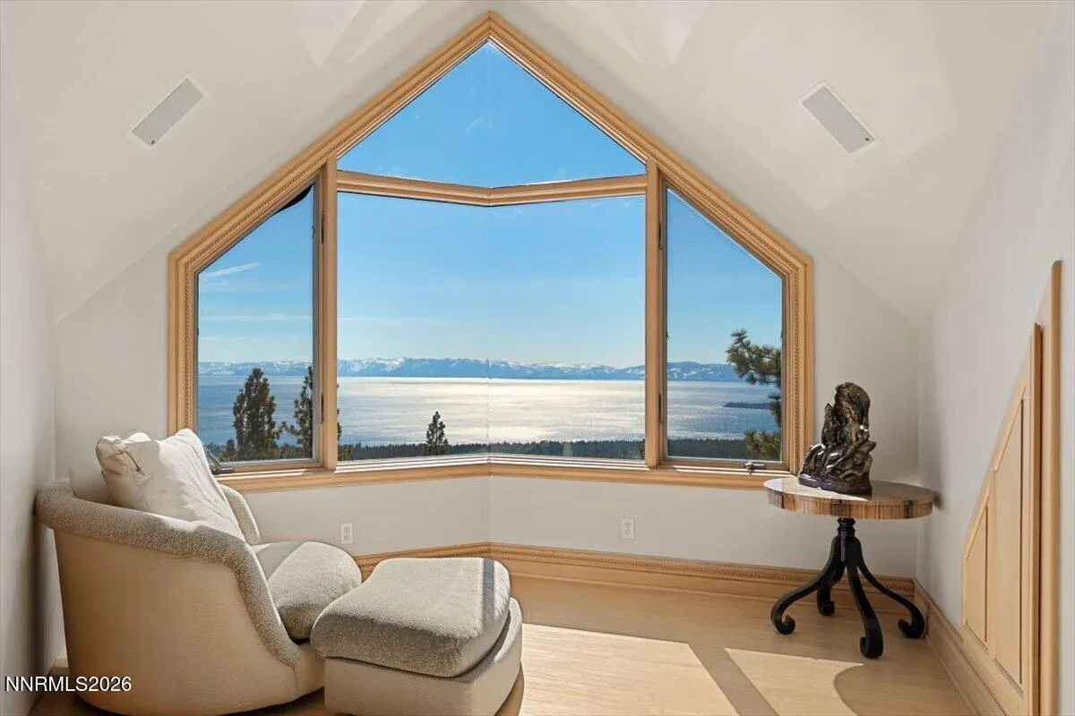Above the eastern shore of Lake Tahoe, this estate has been a private world for more than six decades. For over forty of those years, a Rock and Roll Hall of Famer and Songwriter Hall of Famer called this nearly 20,000 sqft estate home. The estate is surrounded by 6 acres placed into conservation by the family to preserve the landscape and prevent future development. This protected land secures the setting by preserving the privacy, the views, and the natural surroundings as they exist today. The estate starts with an elegant wrought iron entry gate, the entry door is a hand-carved 10 inch solid wood Ganesha door presides over the stone arch entry. Inside, an indoor koi pond flows at the base of a spiral staircase beneath a hand-painted celestial dome, a home built around an inner life as much as an exterior one. Eight en-suite bedrooms, plus the primary suite. A professional chef’s kitchen, a private cinema, a wine cellar and tasting room, a gym, a boardroom, a cedar sauna and steam room, and multiple gathering spaces across three floors make this one of the most extensively appointed estates on the lake. Secure in its own wing of the estate, the primary suite opens directly to a private lake-view deck with the Sierra Nevada across the water. This is an opportunity to own a piece of American music history, set above one of the world’s most celebrated lakes. The land surrounding it has been protected in perpetuity, the privacy absolute. The home stands as a fully contained world, thoughtfully designed and extensively appointed. Every detail reflects the life within it.