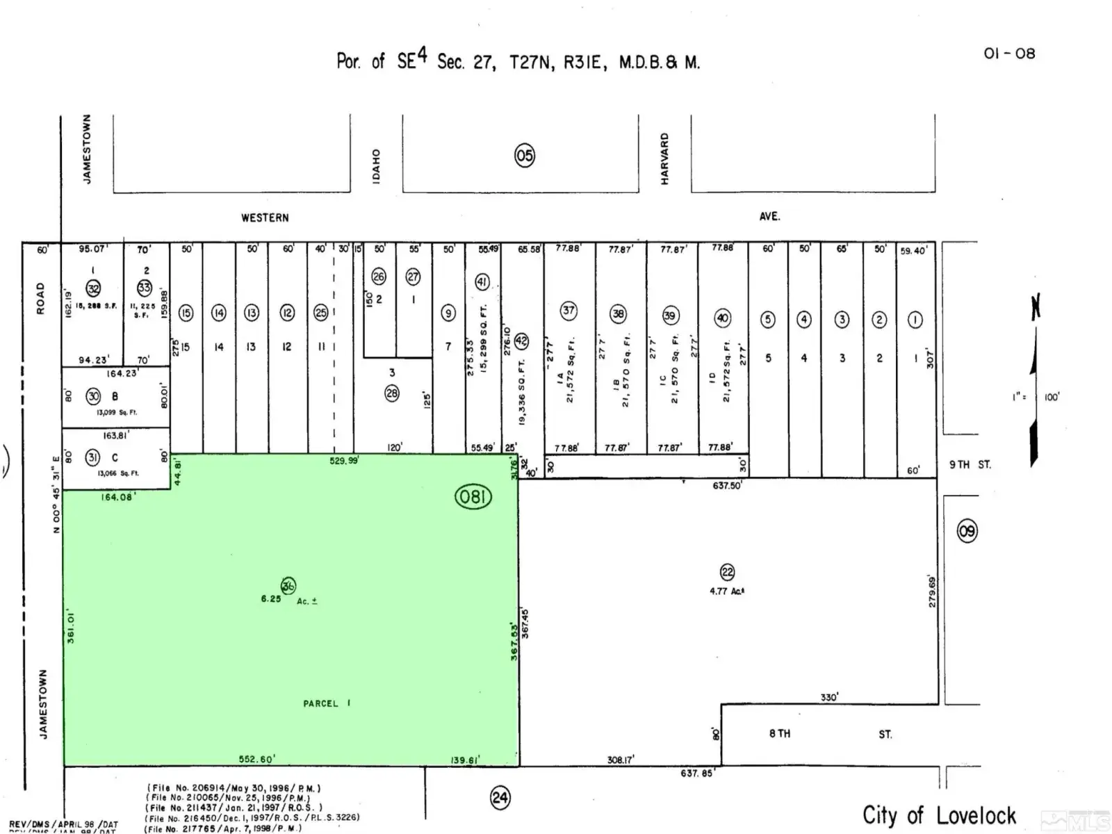 Two adjacent, undeveloped acreage parcels on Jamestown Ave and 6th St within the city limits of Lovelock, NV 89419. Total land area of 13.56+- acres. Surrounding properties are developed–this is an infill project. Water, sewer, natural gas, electric, and phone are present along adjacent street(s) and available for connection. Fencing along some lot lines. Lovely westward views of mountains and sunsets across agricultural fields. 50+ lots appear possible based on current single family residential zoning., DEVELOPER PROJECT: INFILL ACREAGE IN CITY FOR RESIDENTIAL SUBDIVISION Two adjacent, undeveloped acreage parcels on Jamestown Ave and 6th St within the city limits of Lovelock, NV 89419. Total land area of 13.56+- acres. Surrounding properties are developed–this is an infill project. Water, sewer, natural gas, electric, and phone are present along adjacent street(s) and available for connection. Fencing along some lot lines. Lovely westward views of mountains and sunsets across agricultural fields. This is the largest undeveloped acreage property within the City of Lovelock. City is in need of and receptive to new housing. 50+ lots appear possible based on current single family residential zoning. Higher density or alternative uses may be possible with a zoning change. Seller will not separate the parcels; must be purchased together. Pershing County APN’s 001-081-36 and 001-241-09 GPS 40.178169, -118.484406 Directions: I-80 exit 106, go west on Main St, left on Dartmouth Ave, right on 6th St. Property will be on your right, beginning approximately across the street from Rose Way, continuing to the end of the street at Jamestown Ave, and continuing approximately 1000 feet northward on Jamestown Ave to the first existing house.