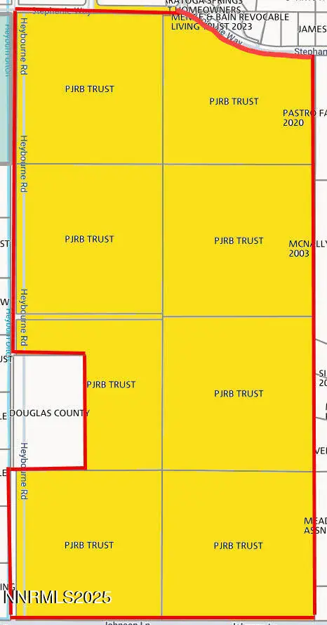 This property features over 290 acres of single-family zoned land, divided into eight neighboring parcels. Situated between the busy Stephanie Way to the north Johnson Lane to the south and Heybourne Rd. (unpaved) to the west, it’s just one mile east of US Highway 395 and about three miles north of the Minden-Tahoe Airport. With utilities nearby, the land presents an excellent opportunity for development. Interested parties are welcome to tour the site directly at their convenience. At this time, the seller would prefer to sell all parcels together rather splitting off any. Approximate Longitude/Latitude Coordinates: 39.03421345864859 / -119.7547959713731. Listing includes the following contiguous parcels: 142032001006, 142032001008, 142032001009, 142032001010, 142032002007, 142032002008, 142032002009, and 142032002010. Per Douglas County Planning Dept. these parcels are not within the Receiving Area. No subdivision work has been started with the county. Seller and marketing agent/brokerage assume no responsibility as to the accuracy of the marketing information. Buyers/agents are encouraged to evaluate all aspects of the property.